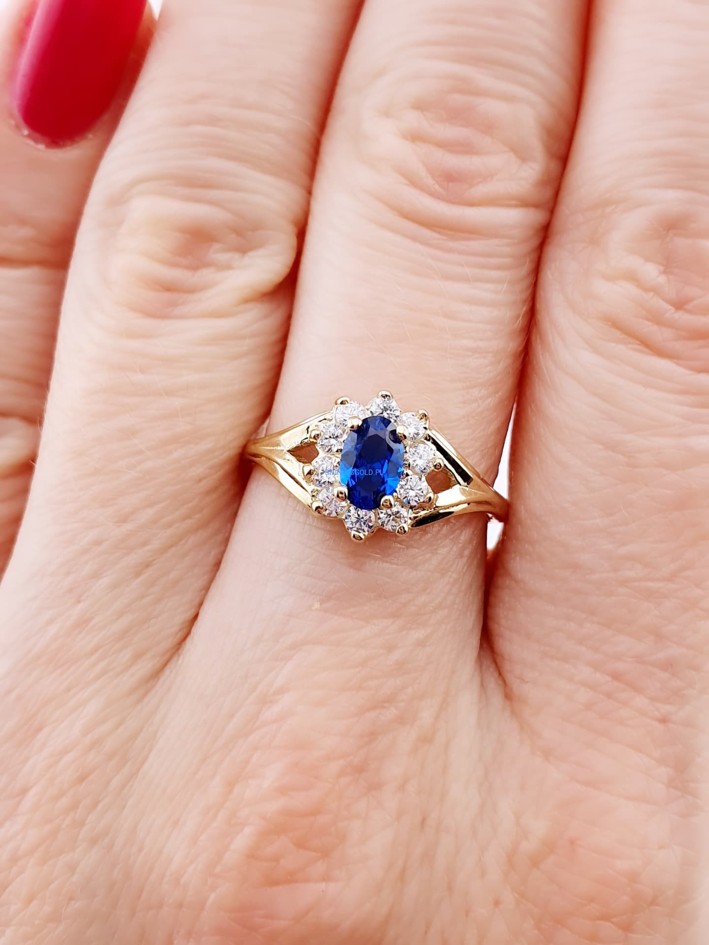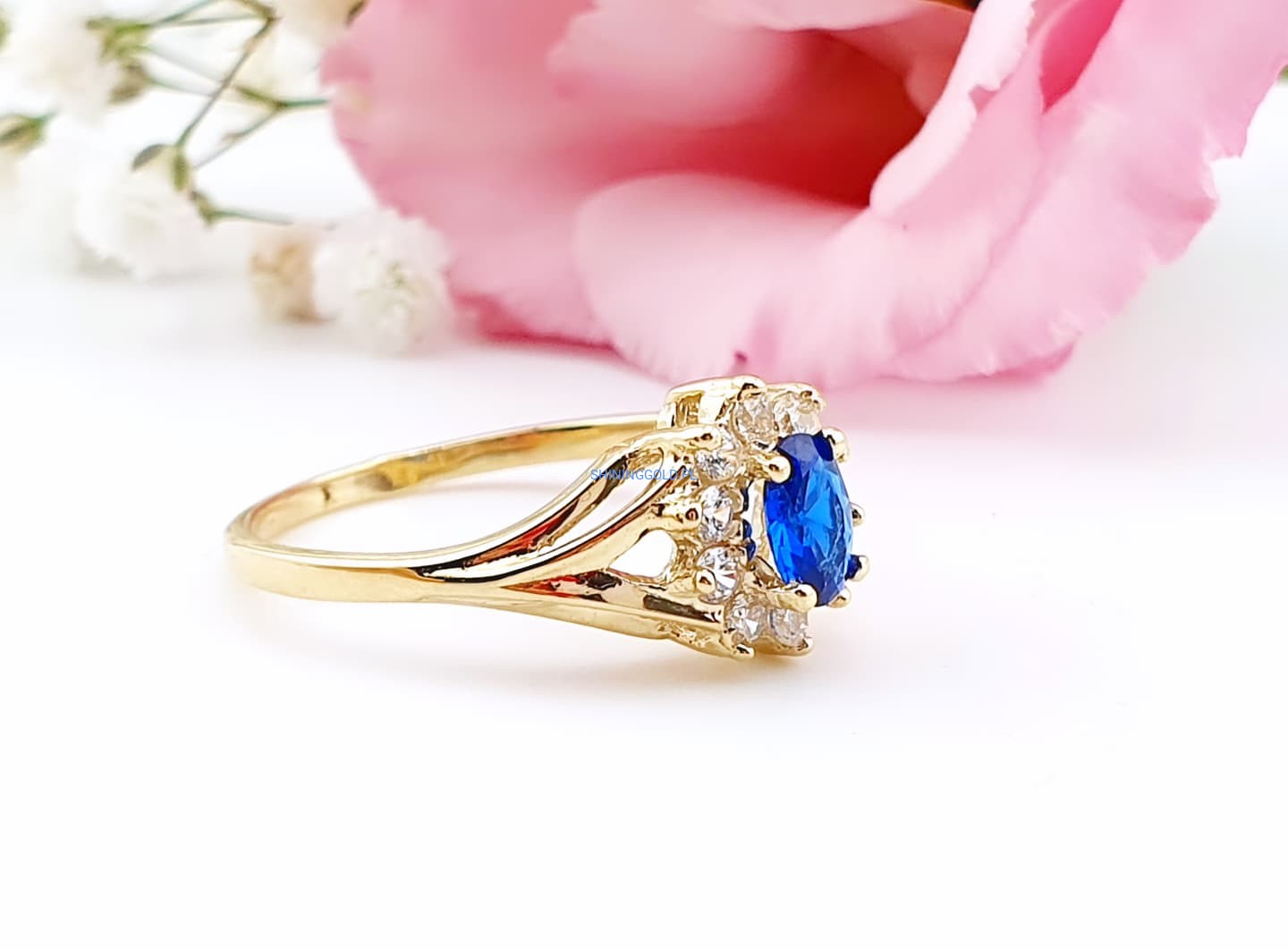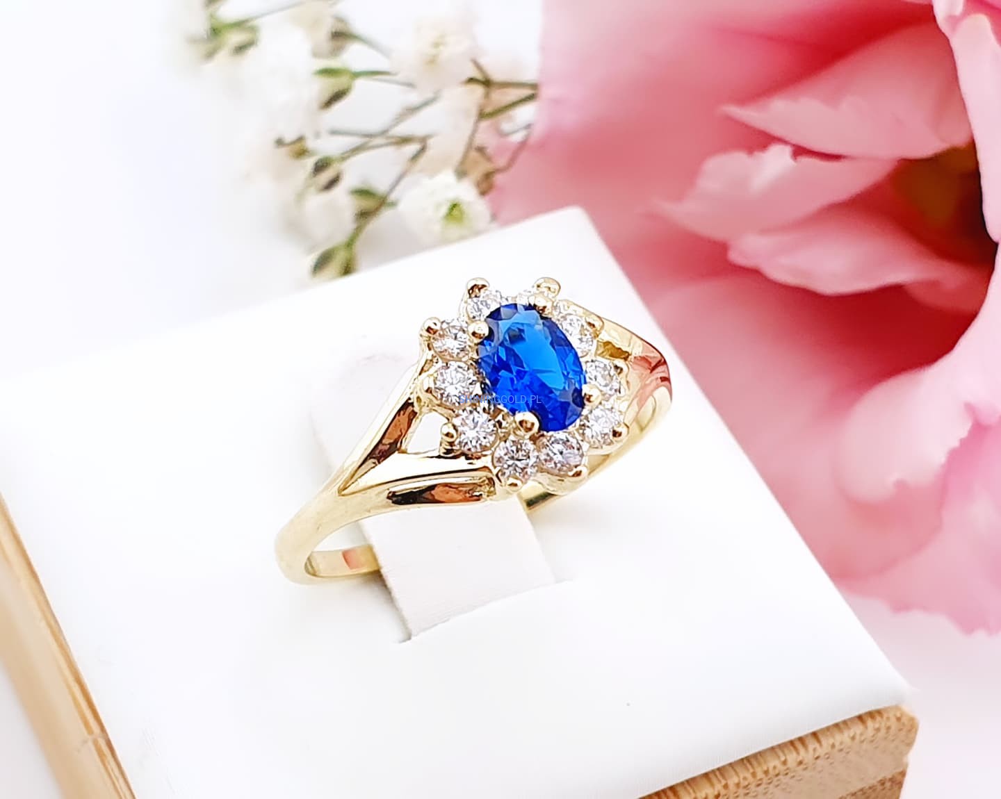 Złoty, nowy pierścionek z niebieskim kamieniem | Próba 375