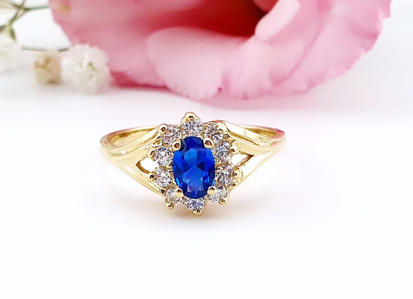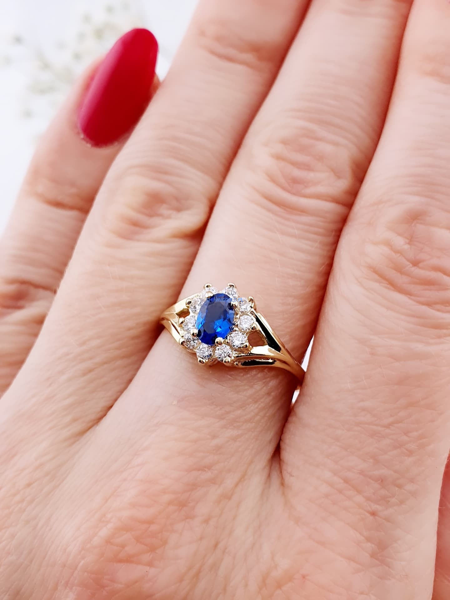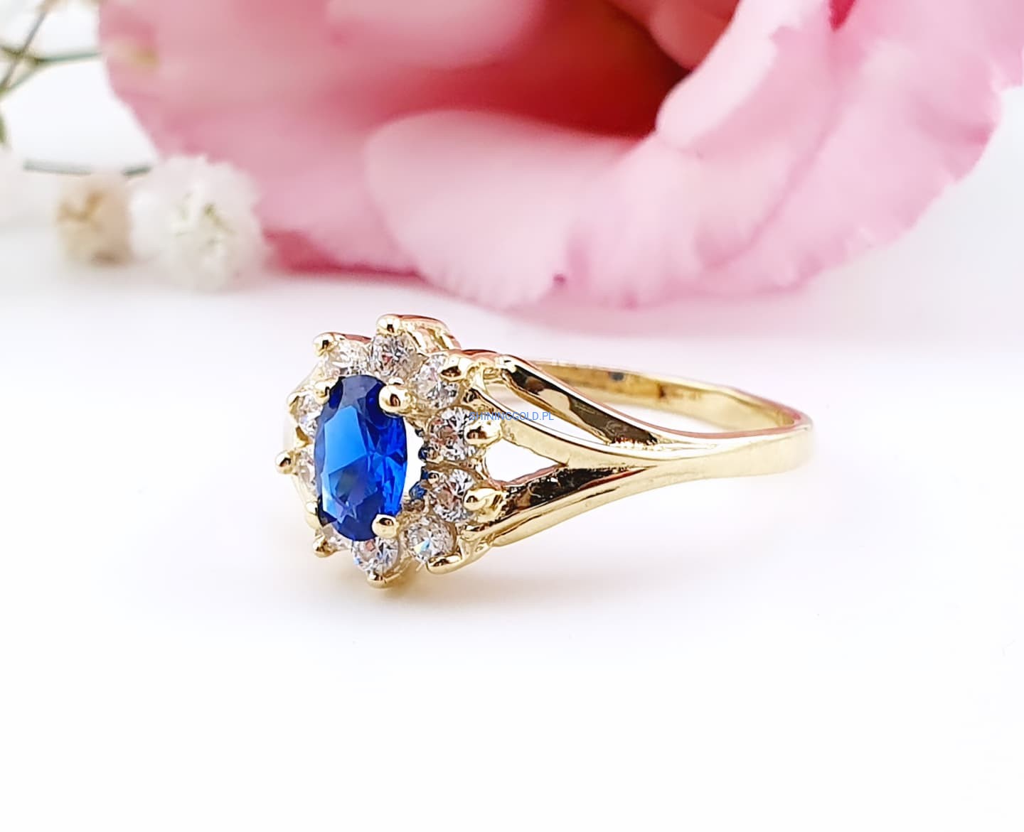 Złoty, nowy pierścionek z niebieskim kamieniem | Próba 375