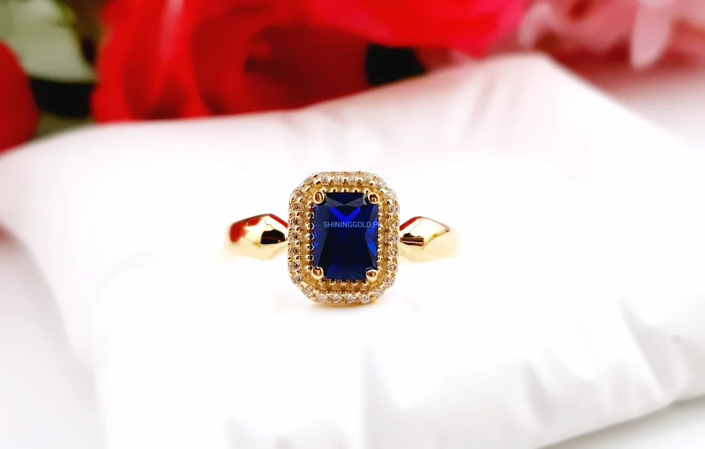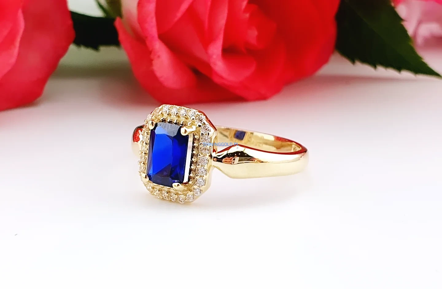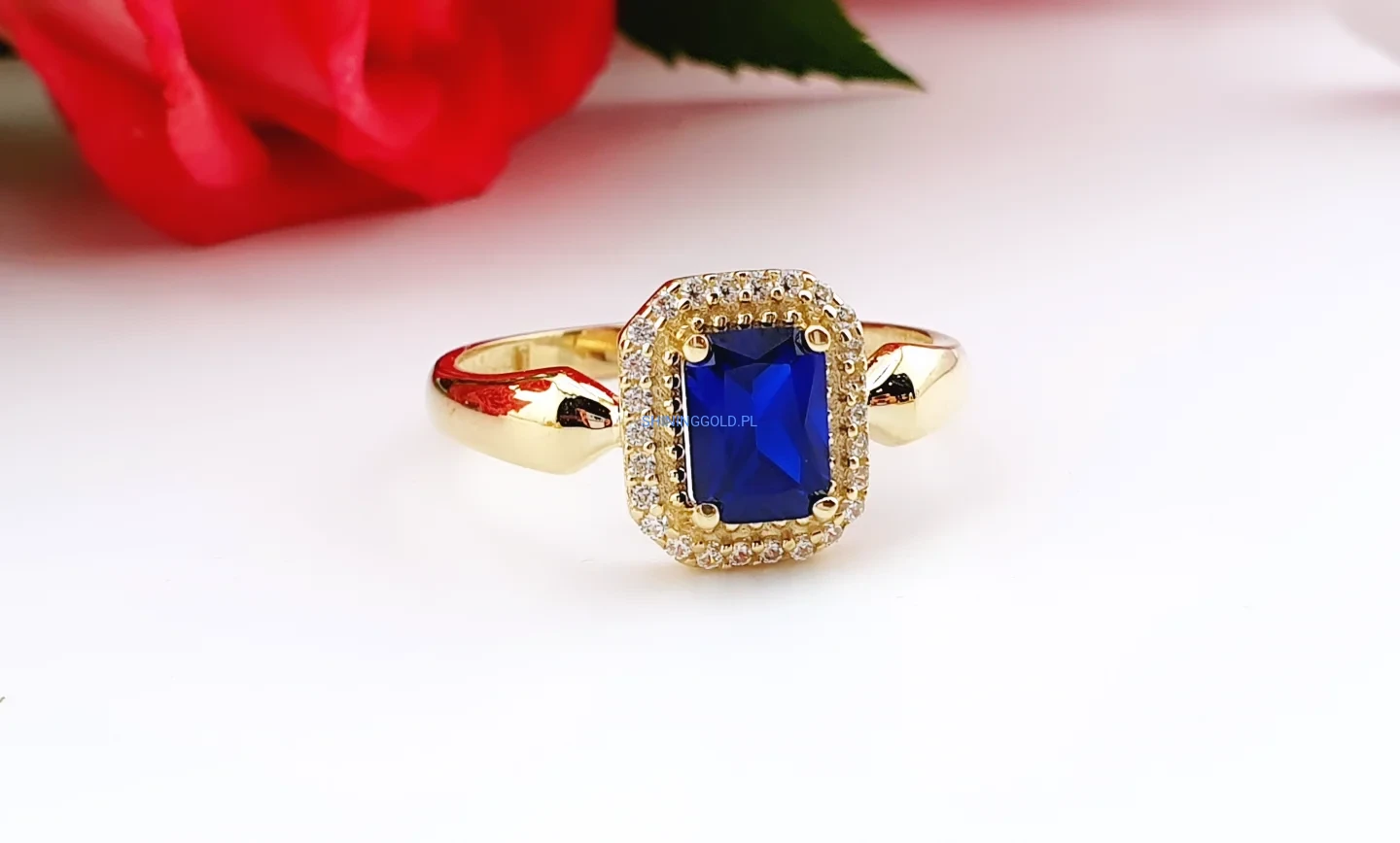 Złoty, nowy pierścionek z niebieskim kamieniem i cyrkoniami (024A)