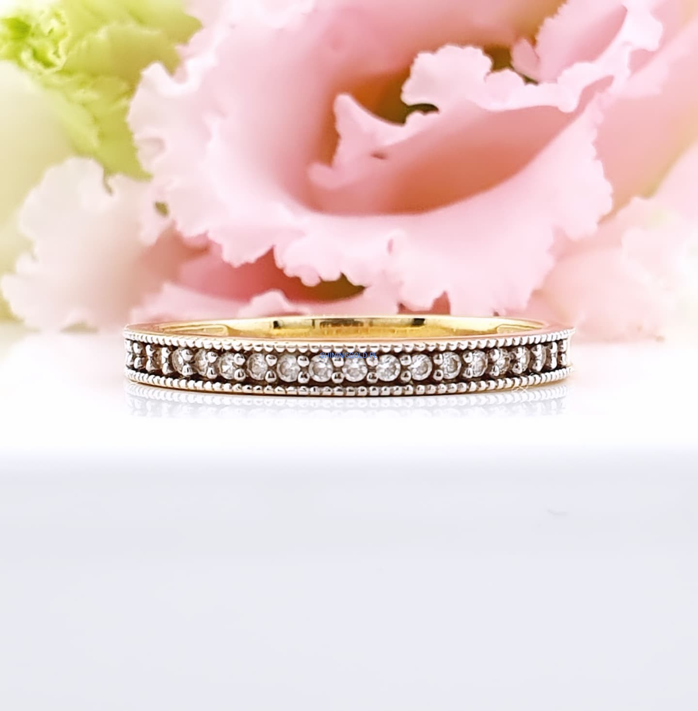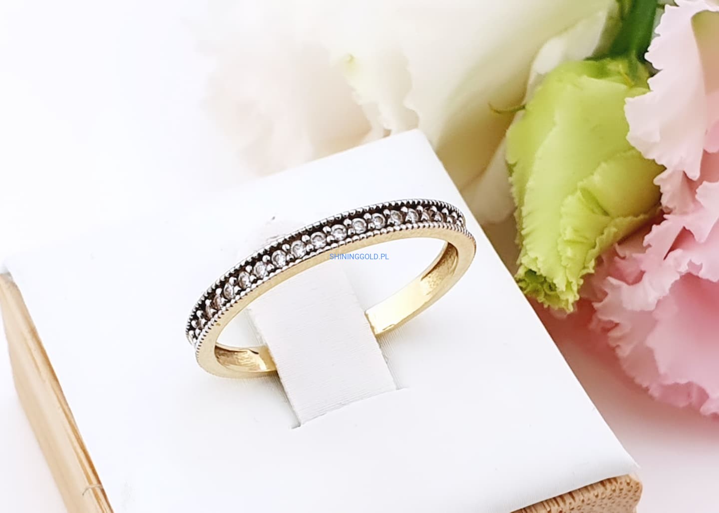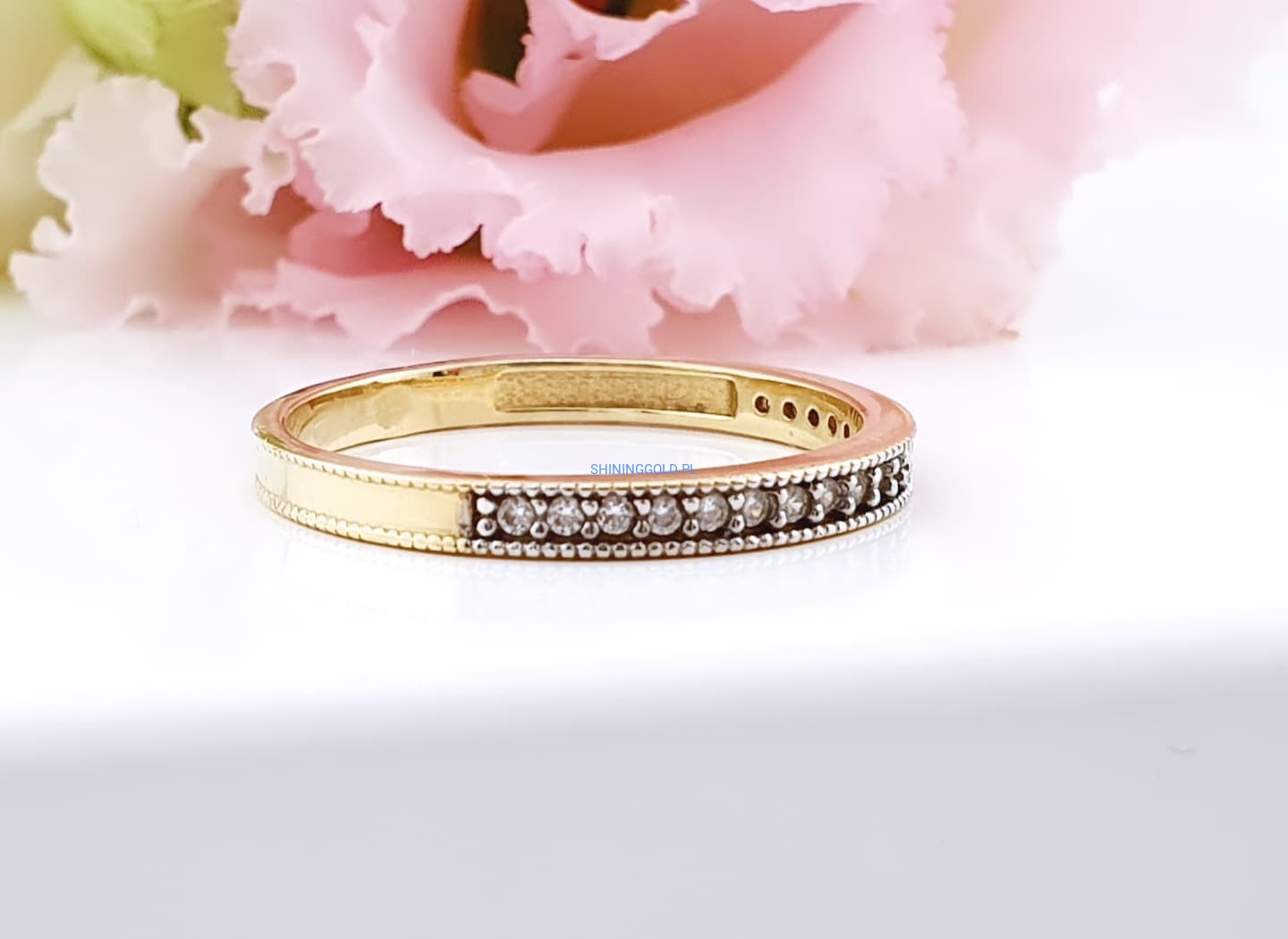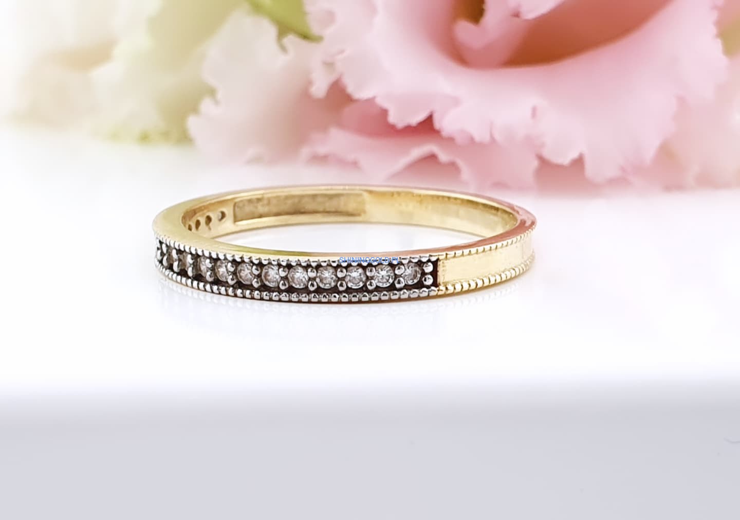 Elegancki i subtelnie błyszczący pierścionek w formie delikatnej obrączki, wykonany z wysokiej jakości złota próby 585. Jego klasyczny kształt został wzbogacony o rząd drobnych, lśniących cyrkonii, które pięknie odbijają światło i dodają biżuterii wyjątkowego uroku.