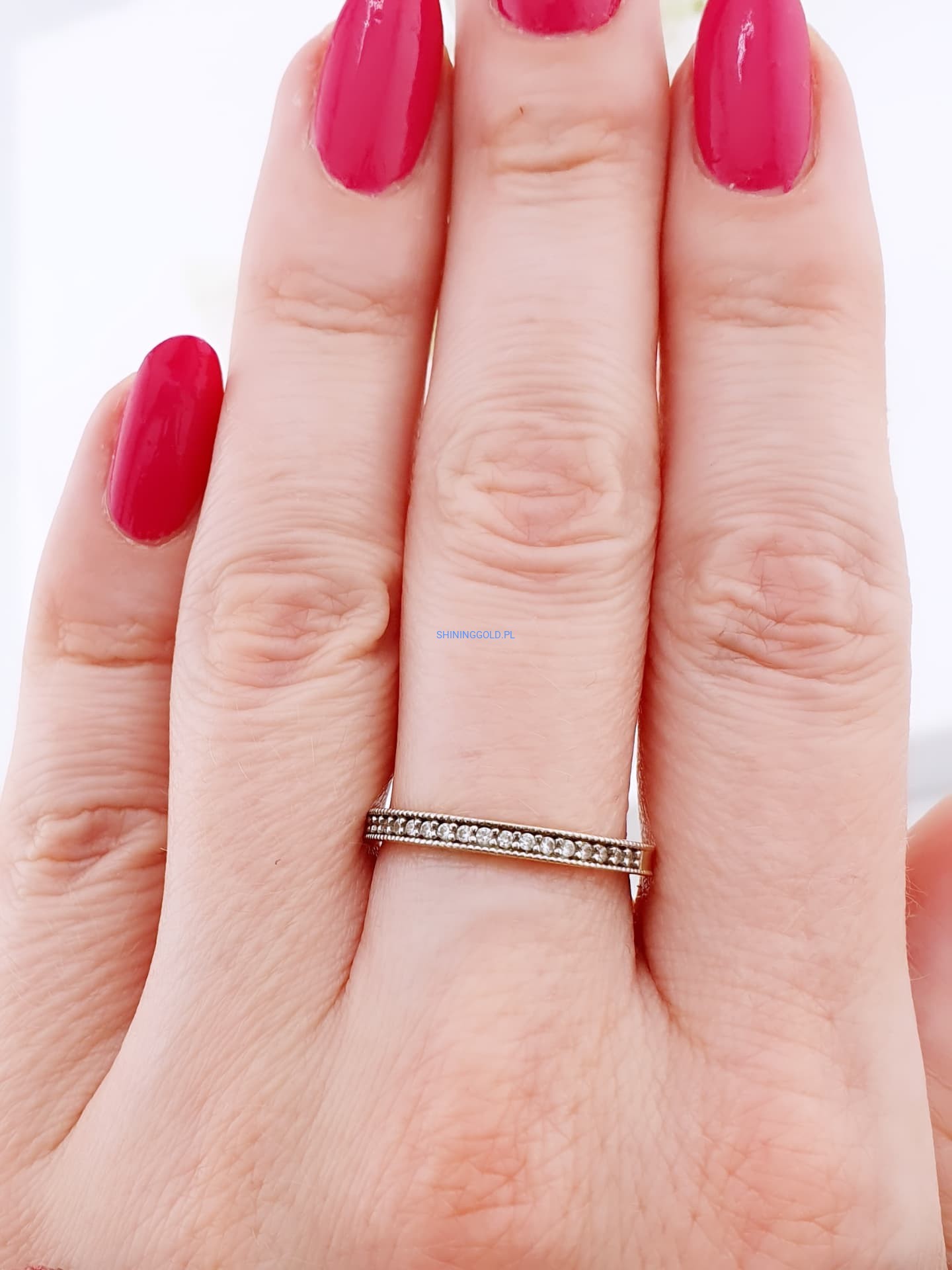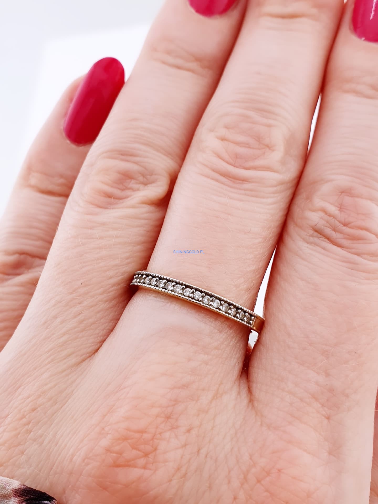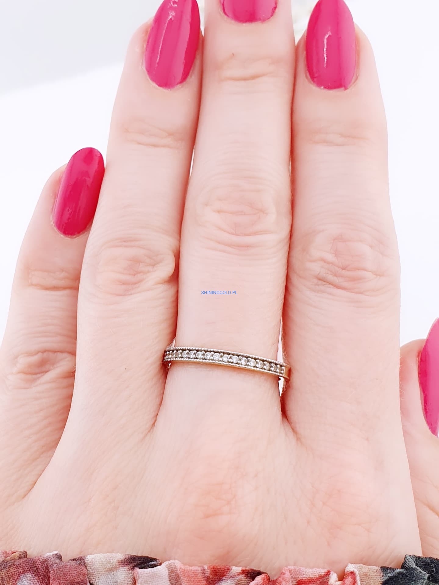 Ten pierścionek to doskonałe połączenie prostoty i elegancji. Jego smukła forma sprawia, że świetnie sprawdzi się zarówno jako codzienny dodatek, jak i element bardziej formalnych stylizacji. Cyrkonie umieszczone wzdłuż obrączki subtelnie połyskują przy każdym ruchu dłoni, dodając jej lekkości i kobiecego blasku.