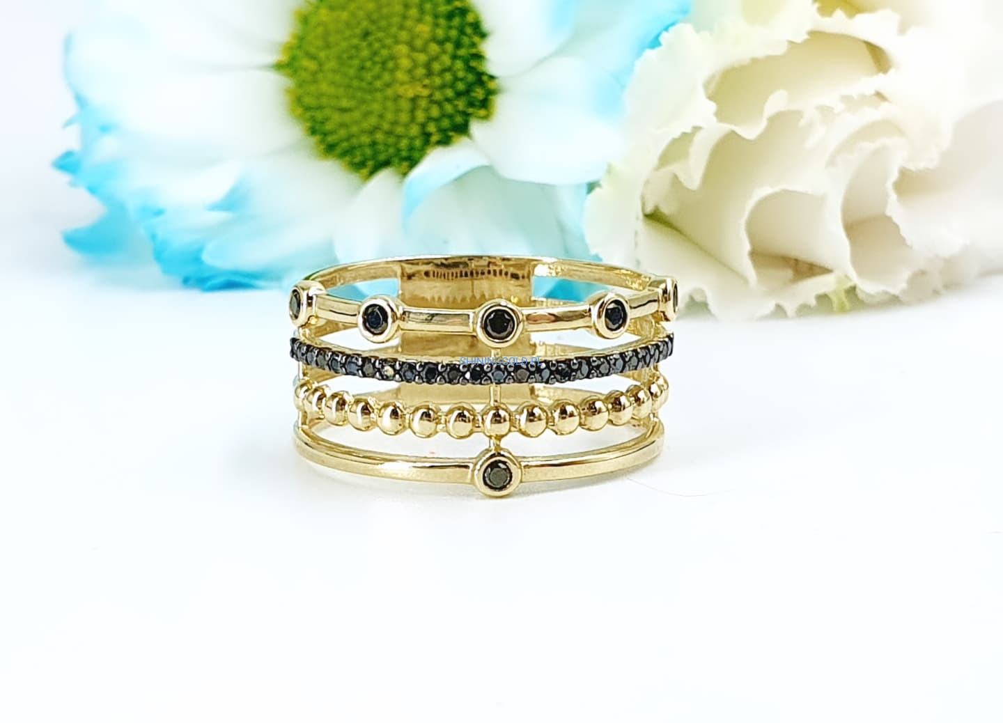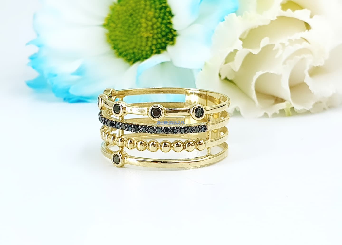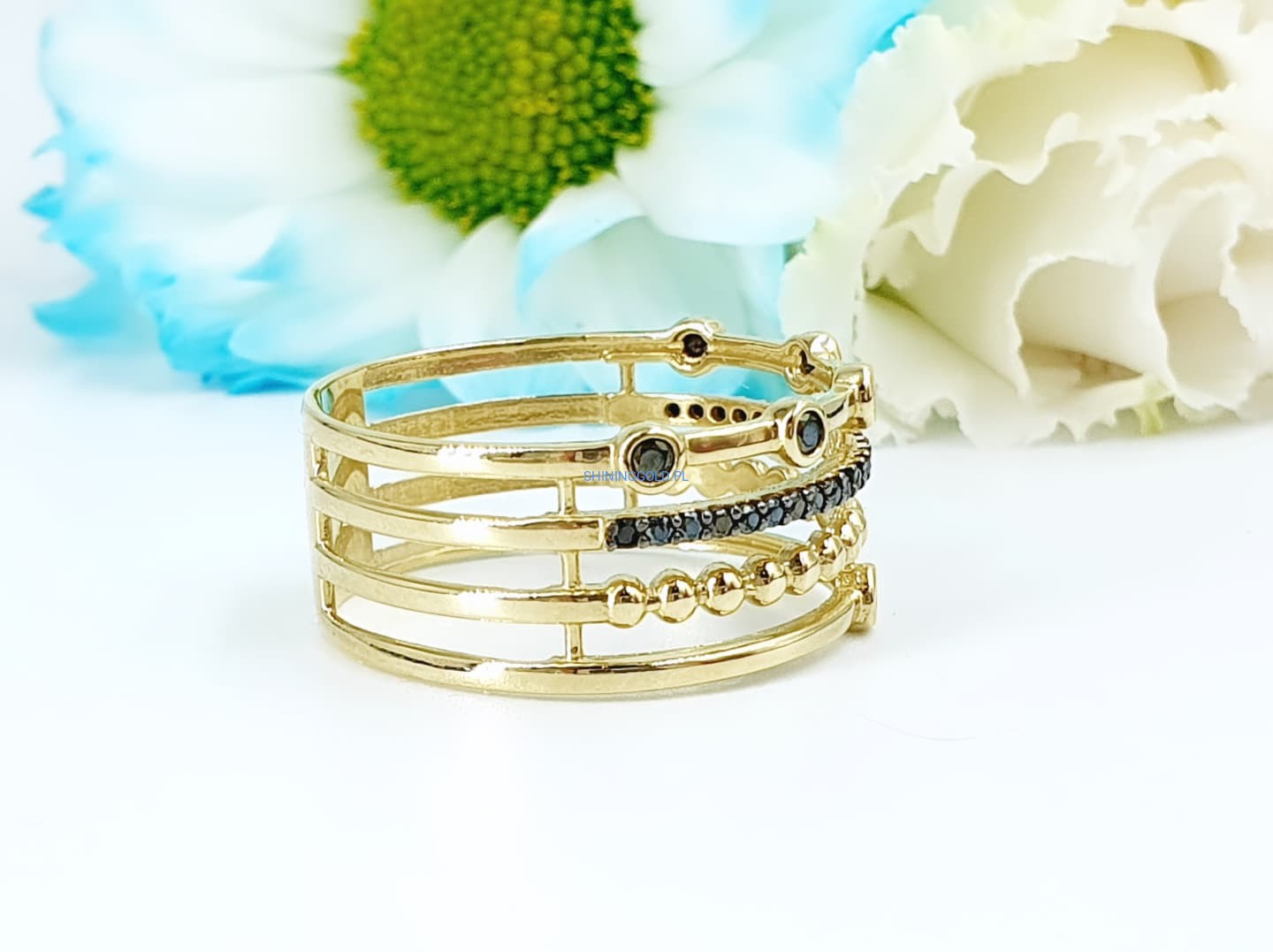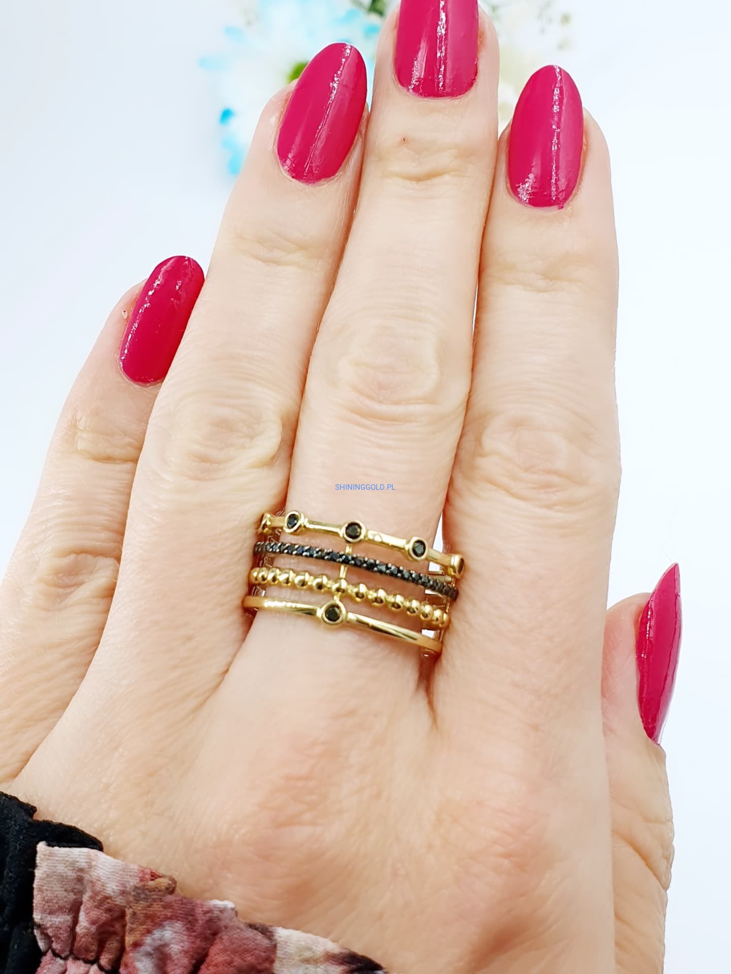 Złoty, nowy szeroki pierścionek z czarnymi cyrkoniami