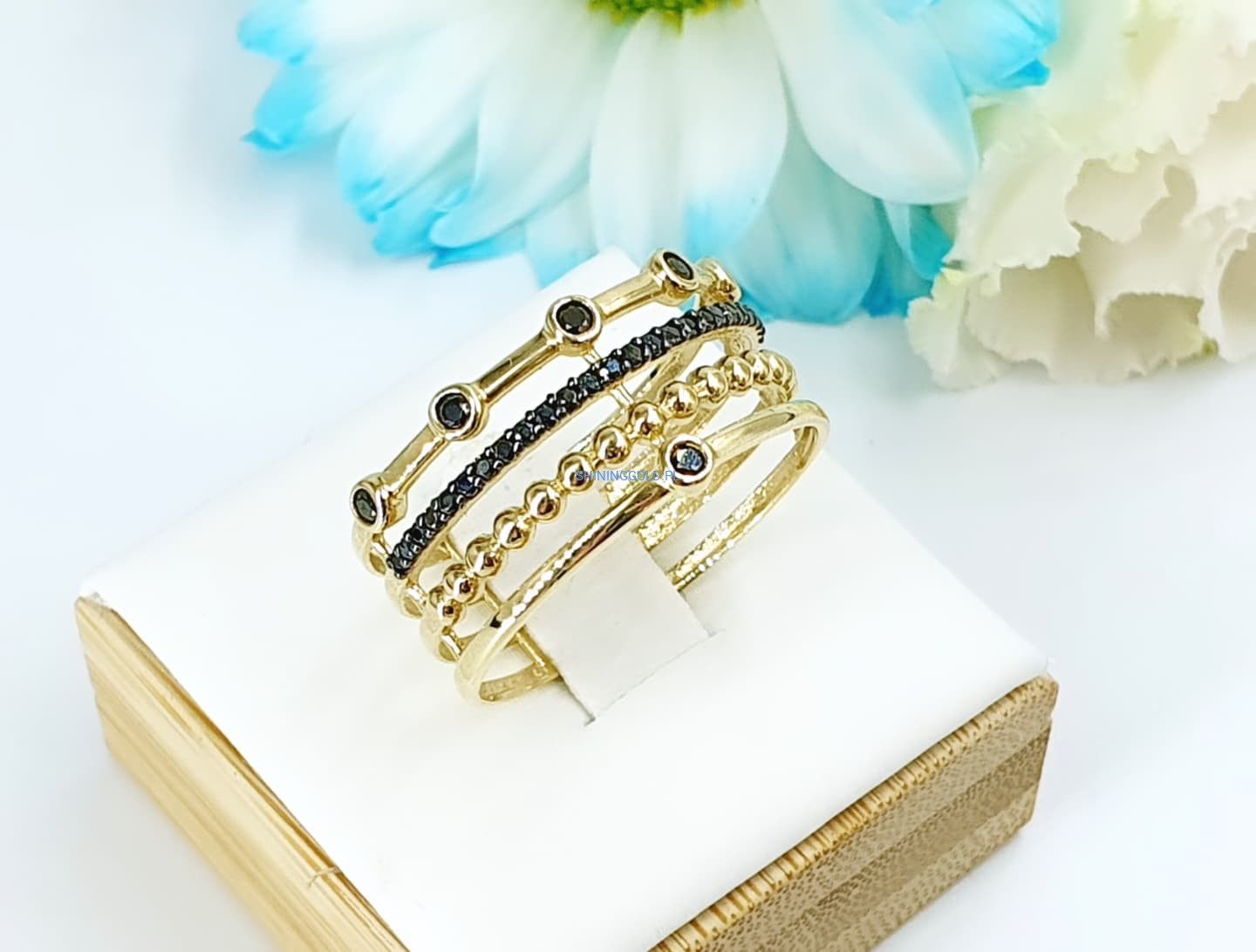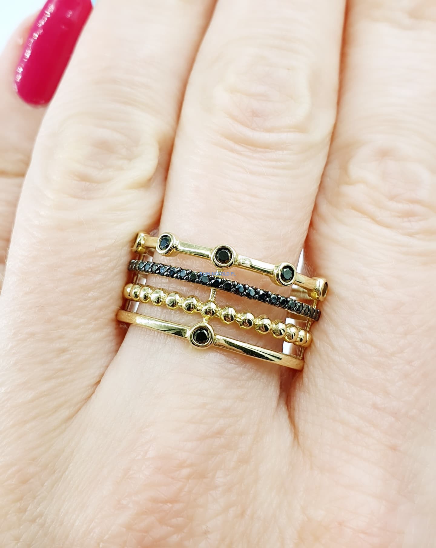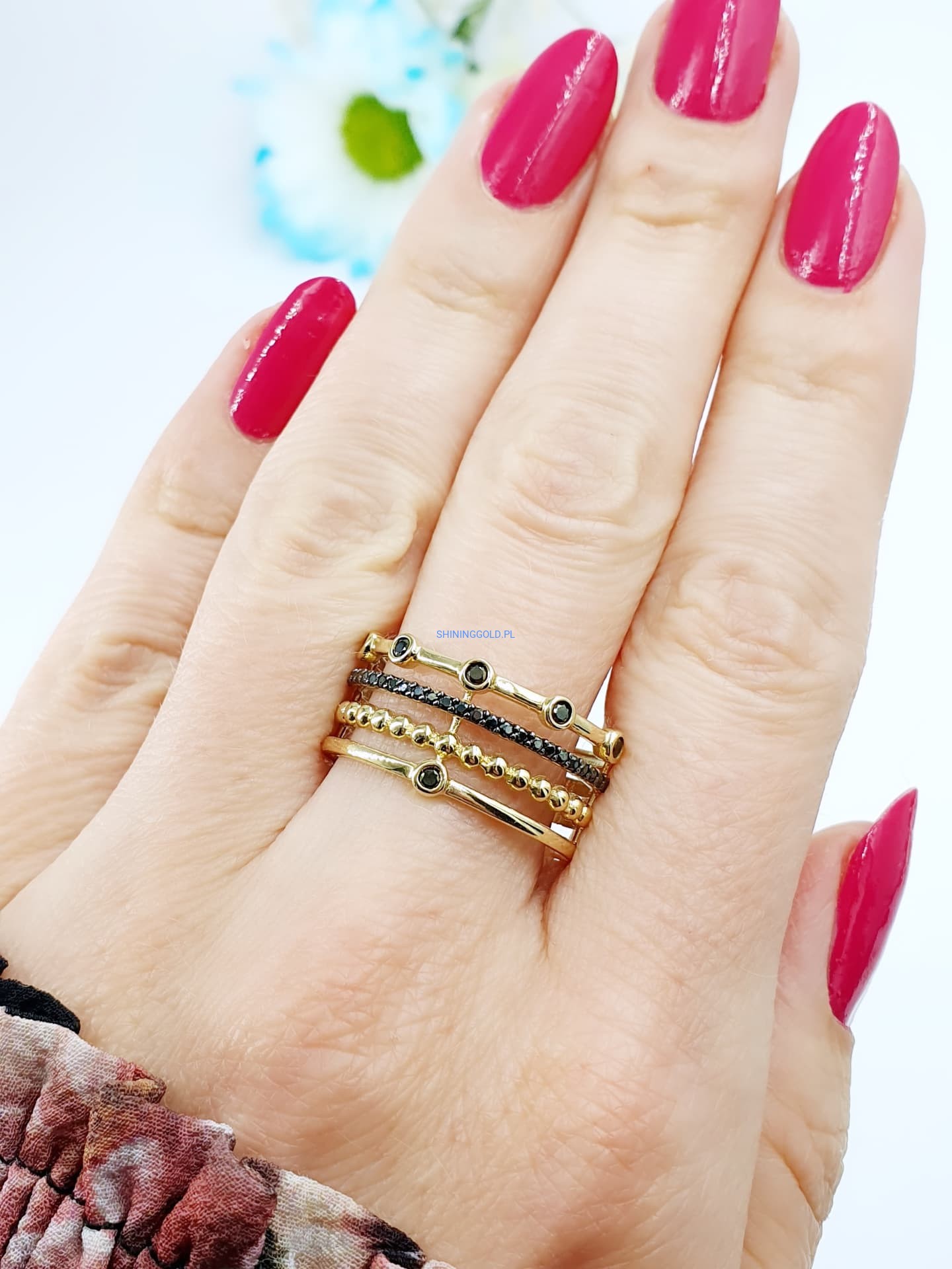 Ten efektowny pierścionek wyróżnia się szeroką, wygodną formą oraz stylową kompozycją z czarnych cyrkonii, które kontrastują z ciepłym odcieniem złota. To biżuteria o zdecydowanym charakterze – idealna do stylizacji wieczorowych, ale także jako mocny akcent w codziennym looku.