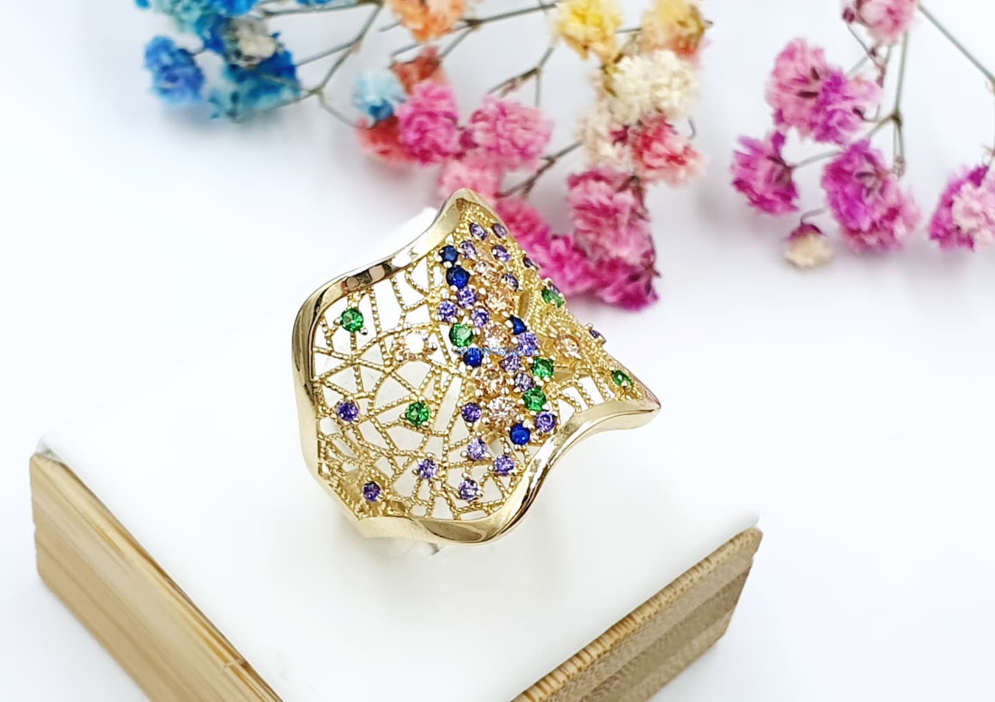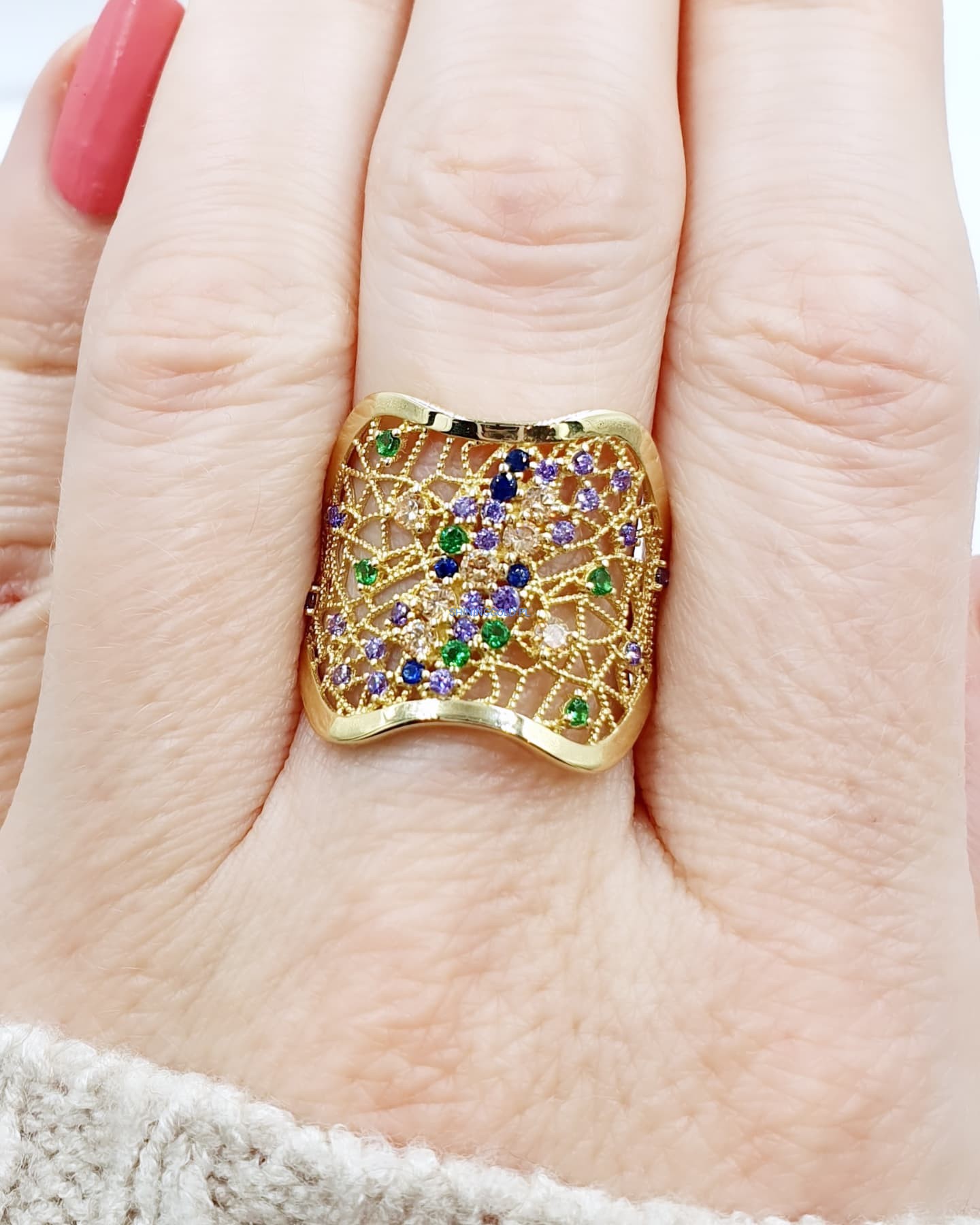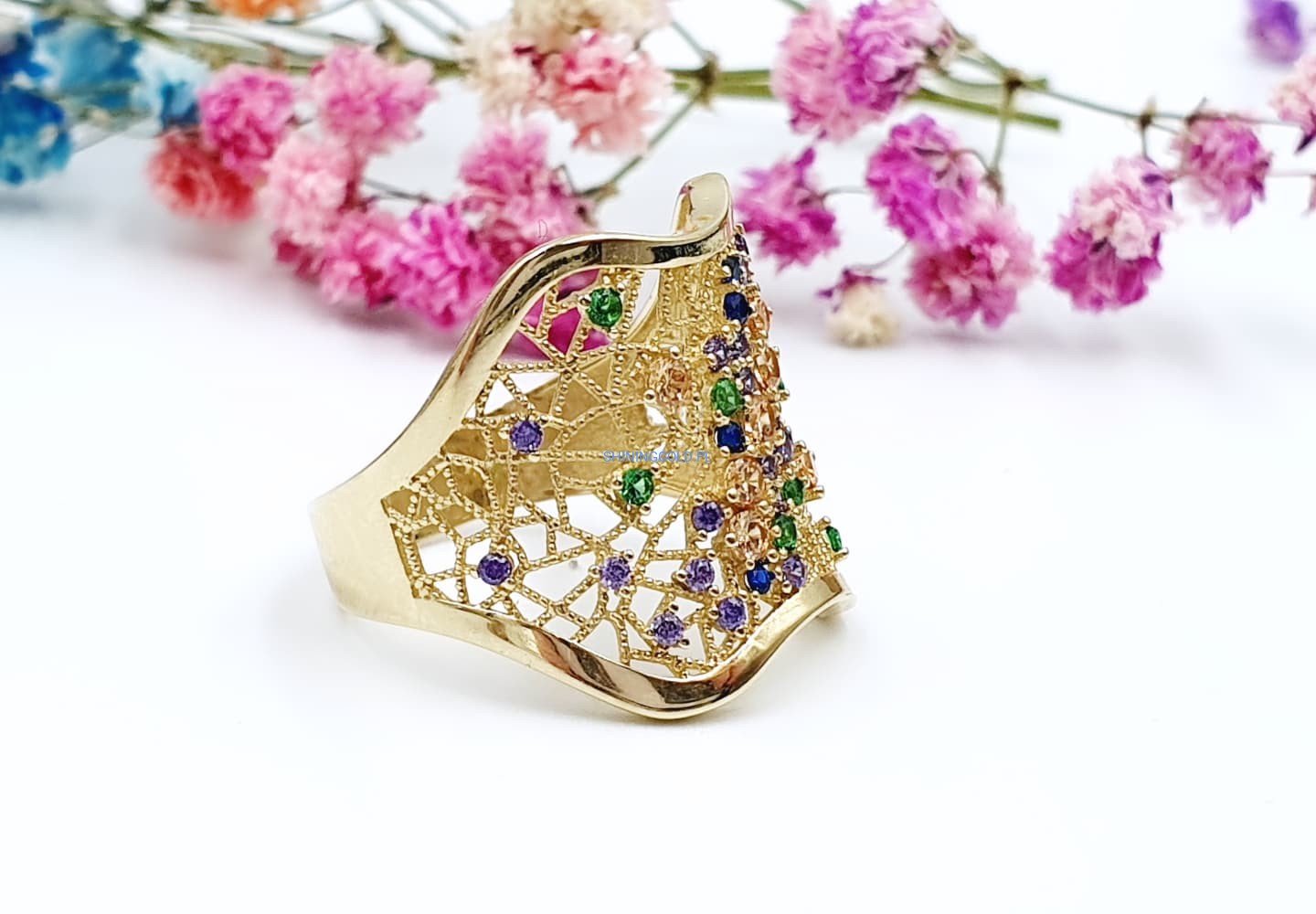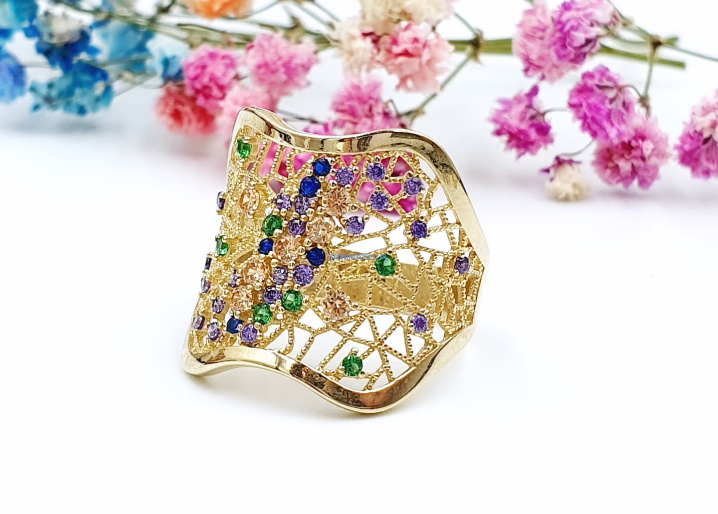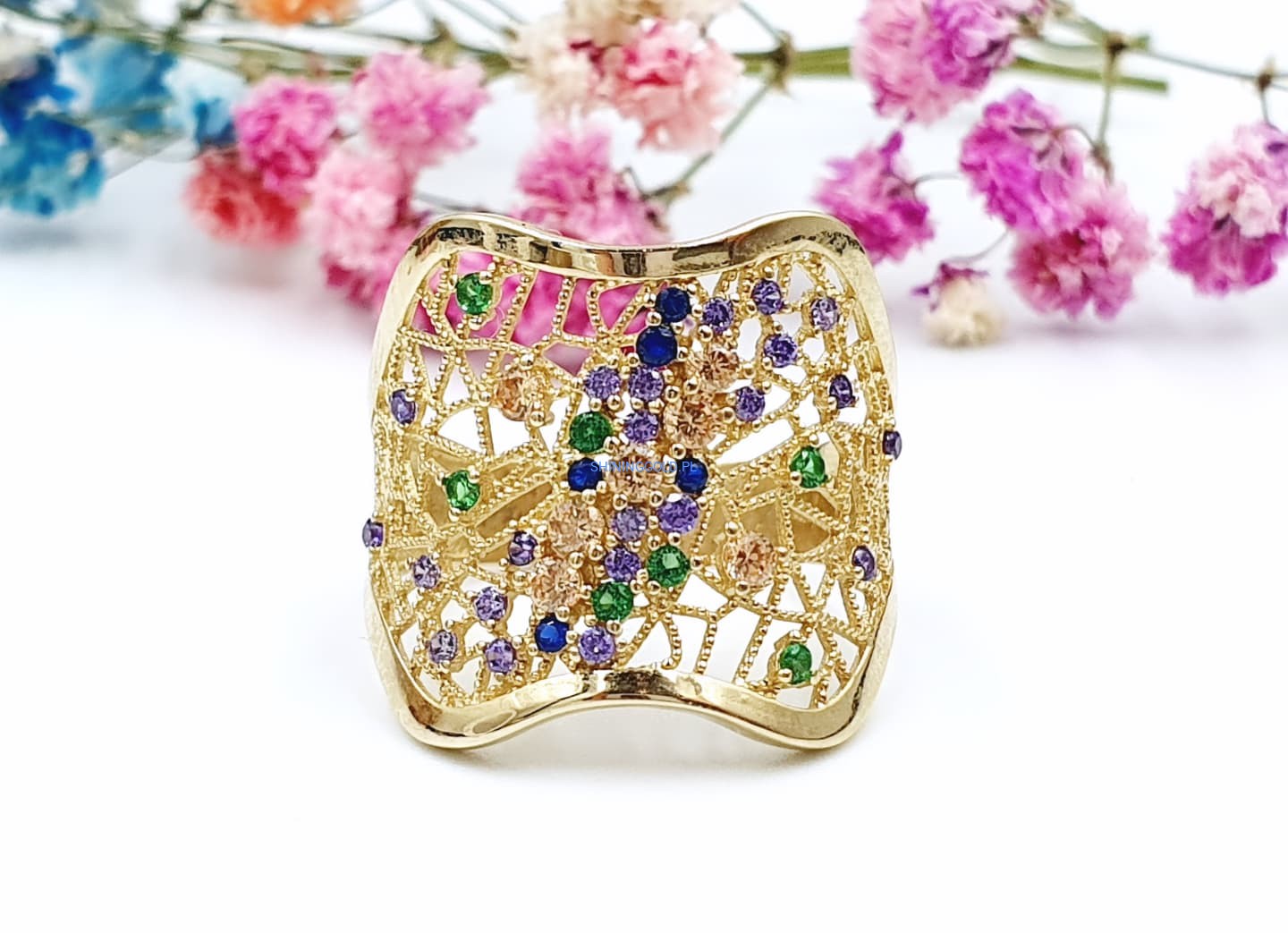 Złoty ażurowy pierścionek z kolorowymi cyrkoniami (001.WS)