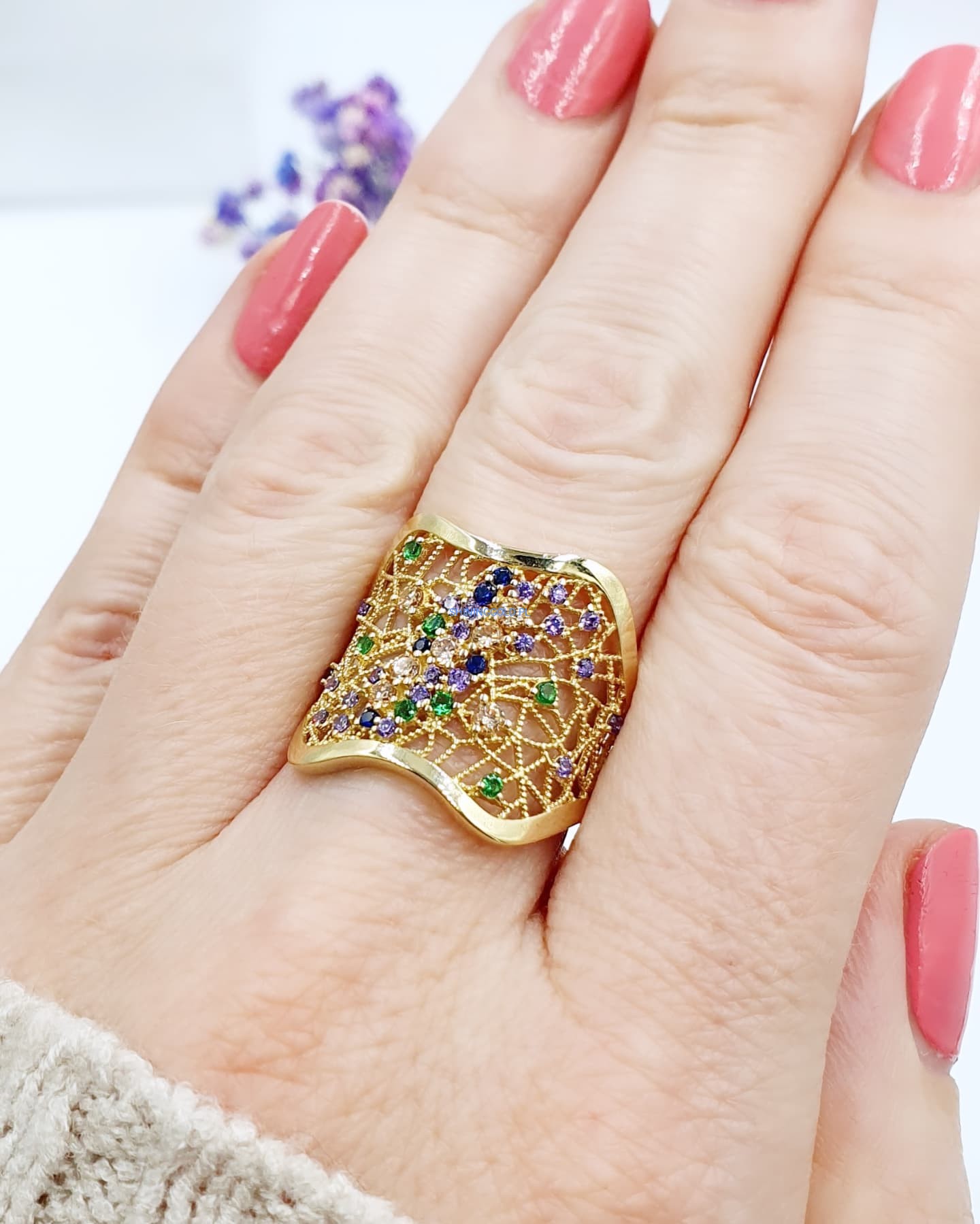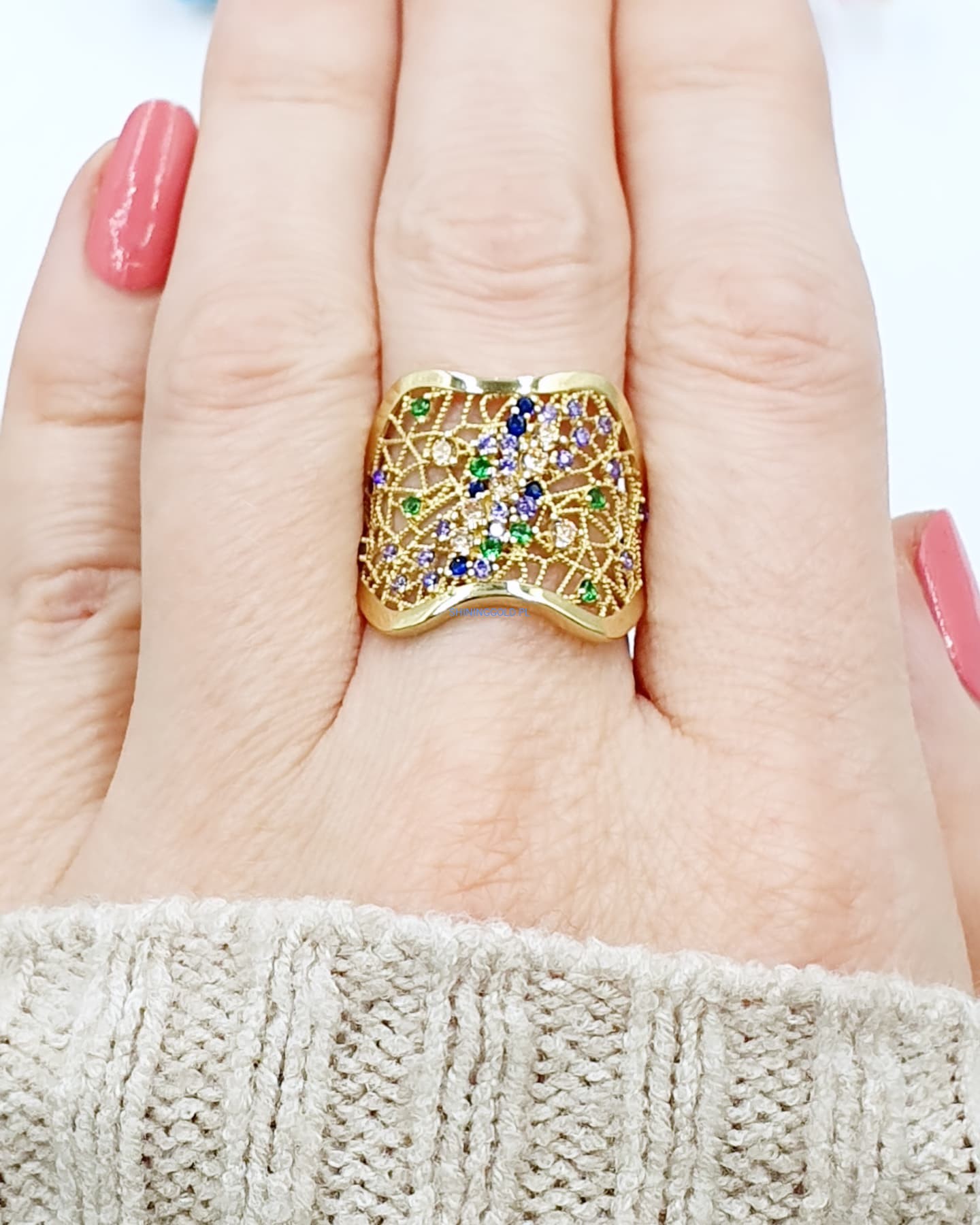Złoty ażurowy pierścionek z kolorowymi cyrkoniami – lekkość i blask