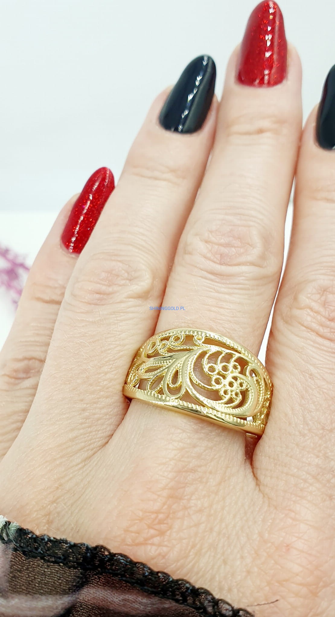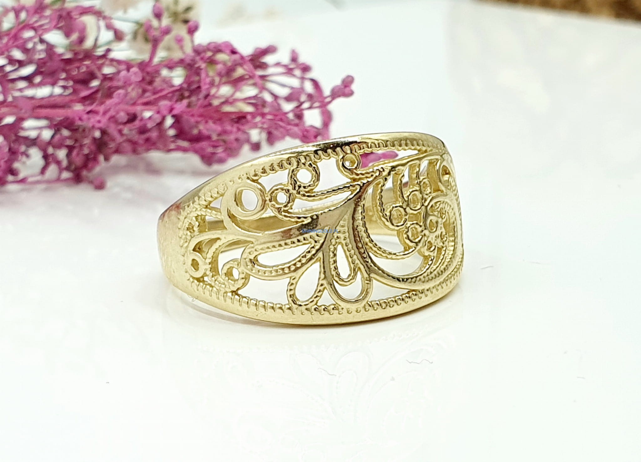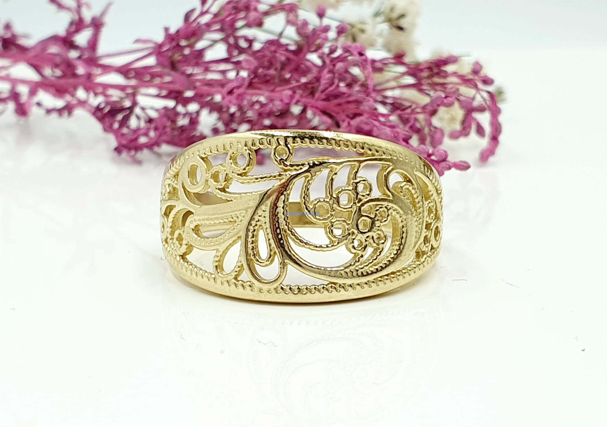 Złoty, nowy ażurowy pierścionek
