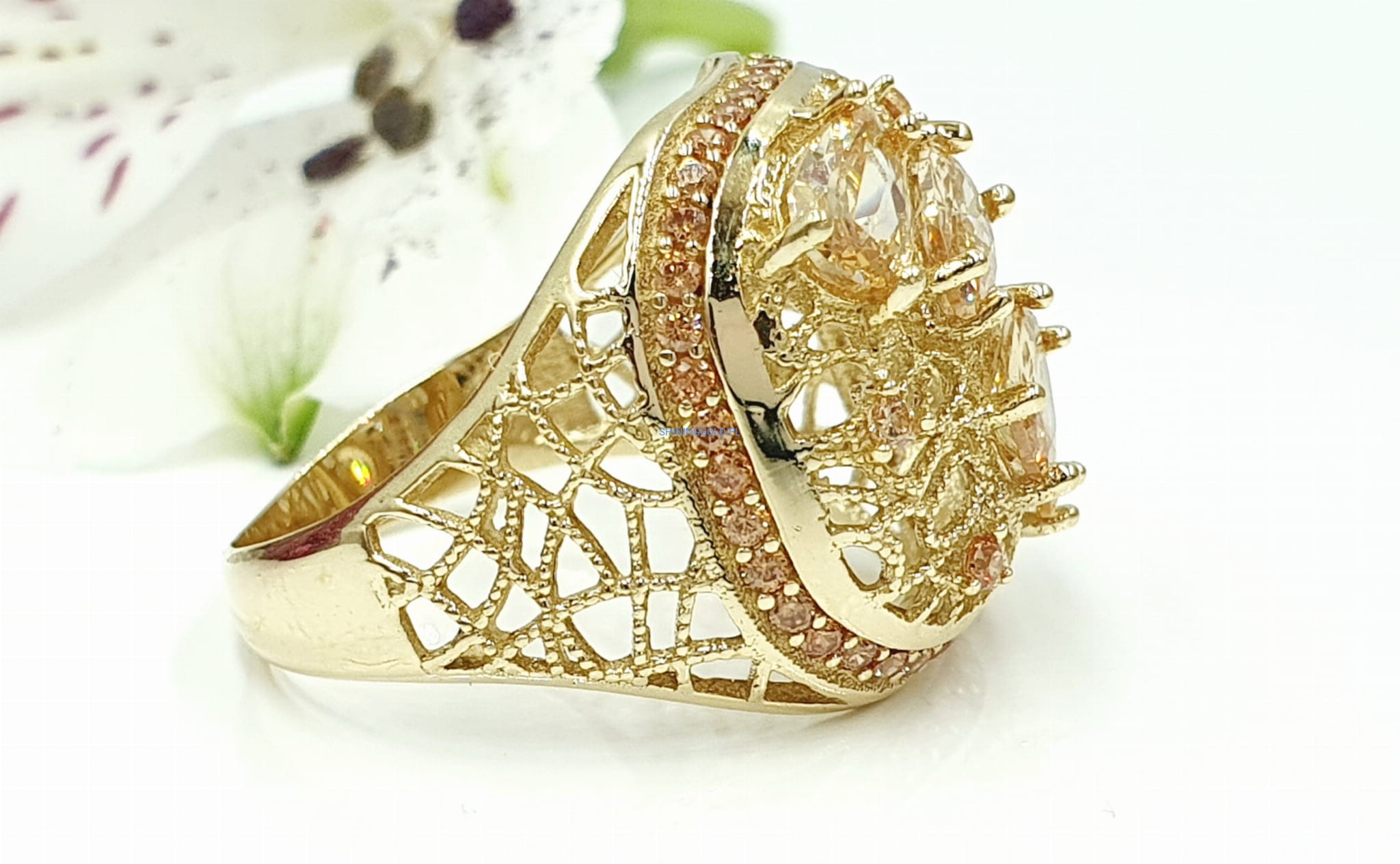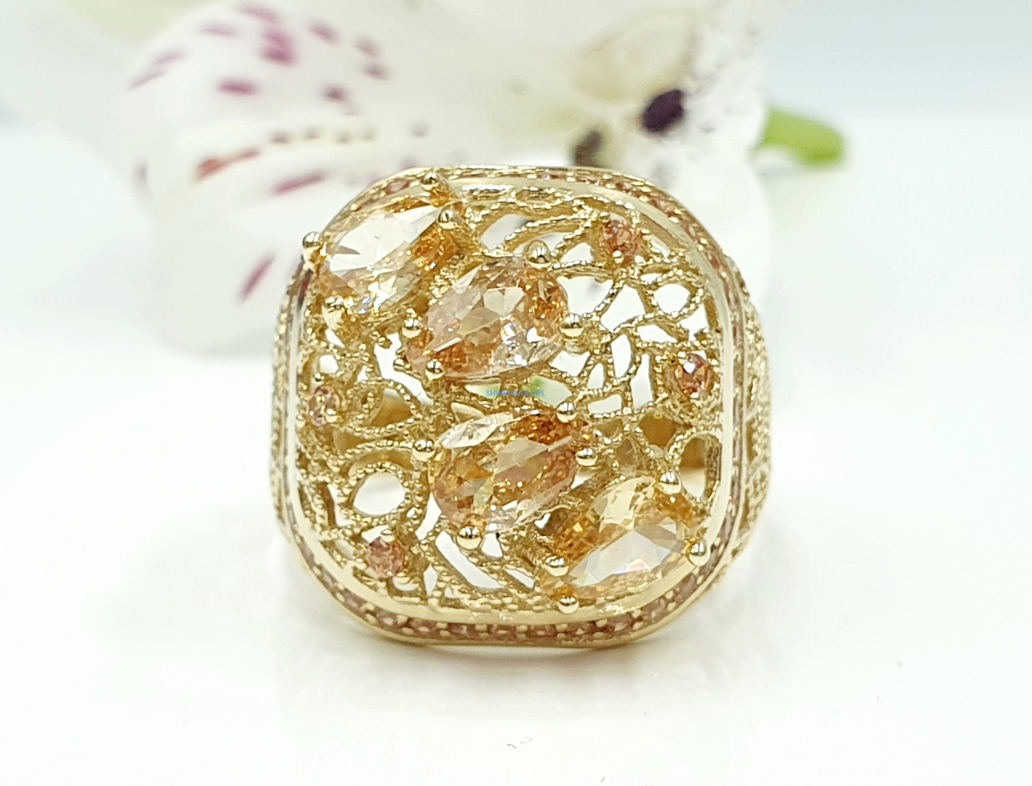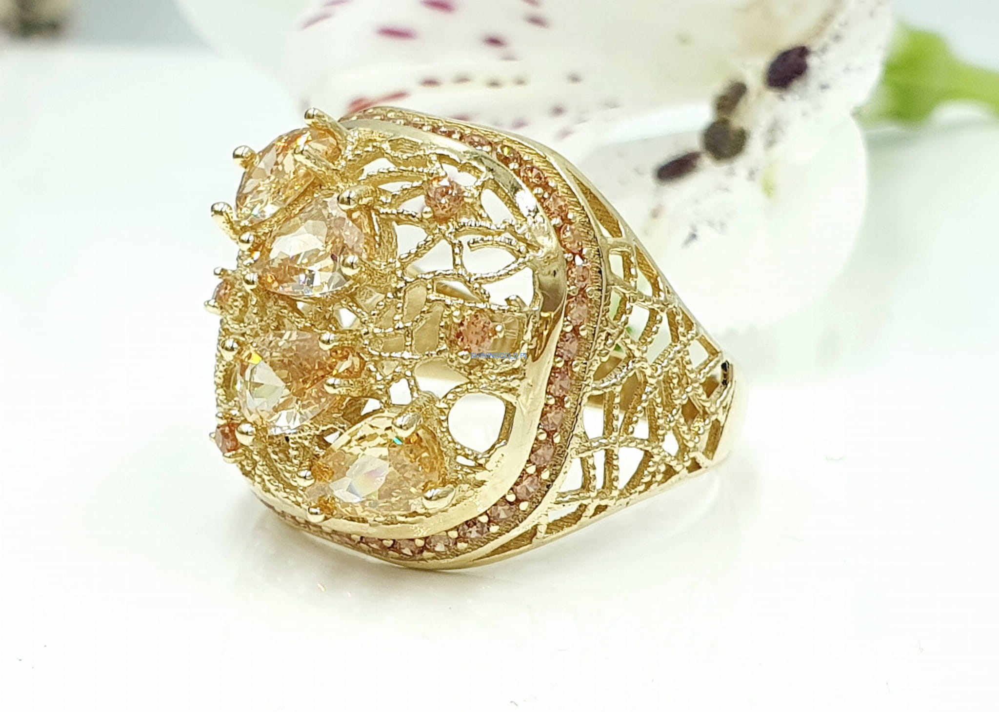 Piękny, nowy złoty pierścionek z żółtymi cyrkoniami