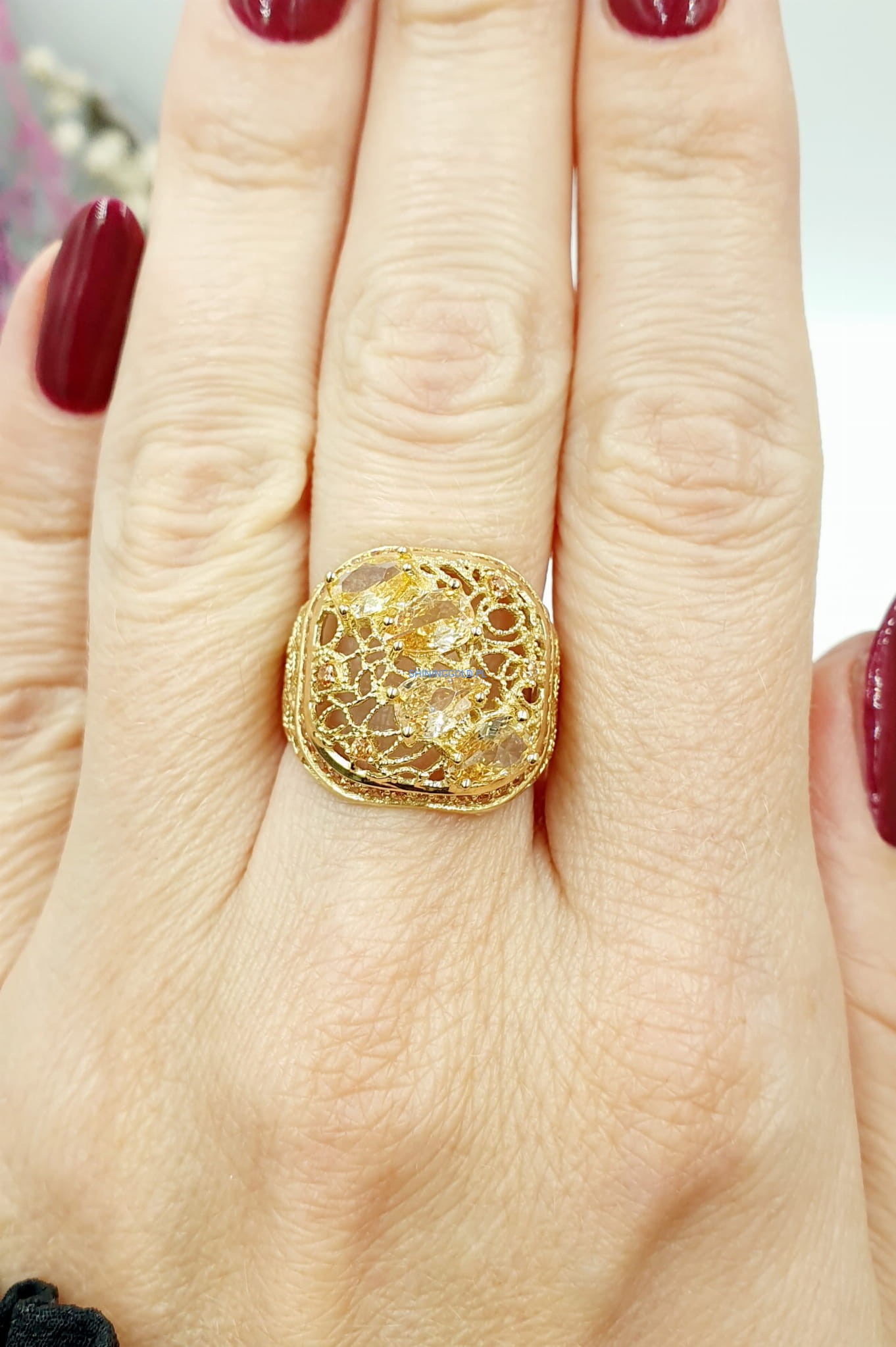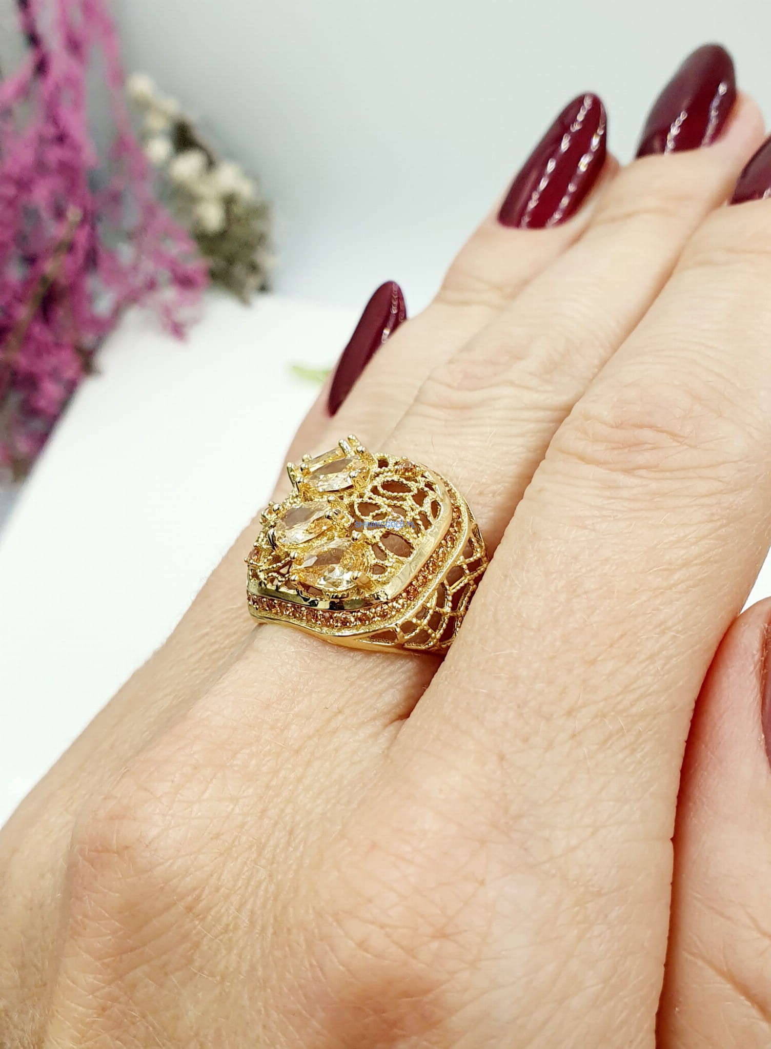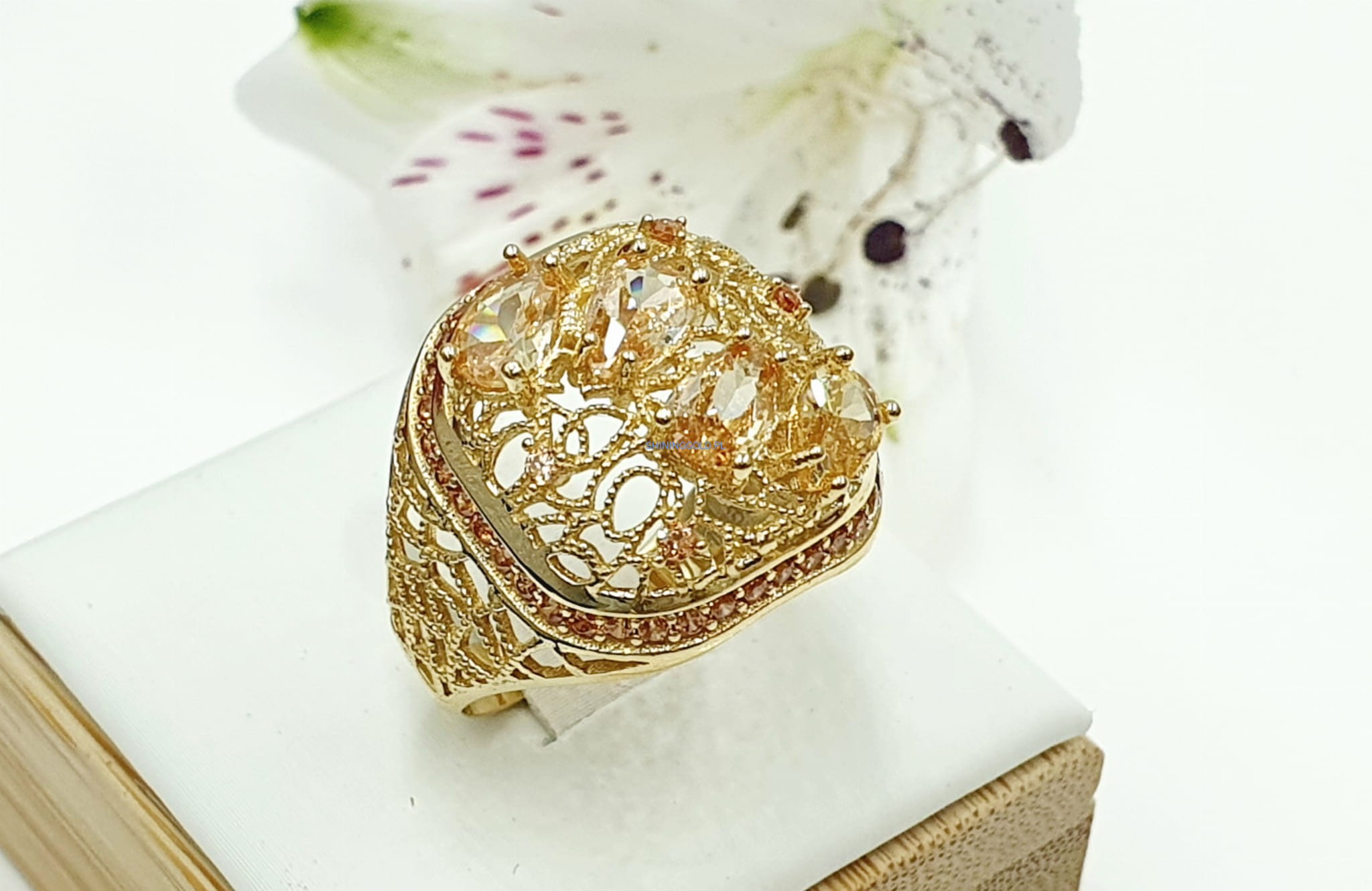 Piękny, nowy złoty pierścionek z żółtymi cyrkoniami