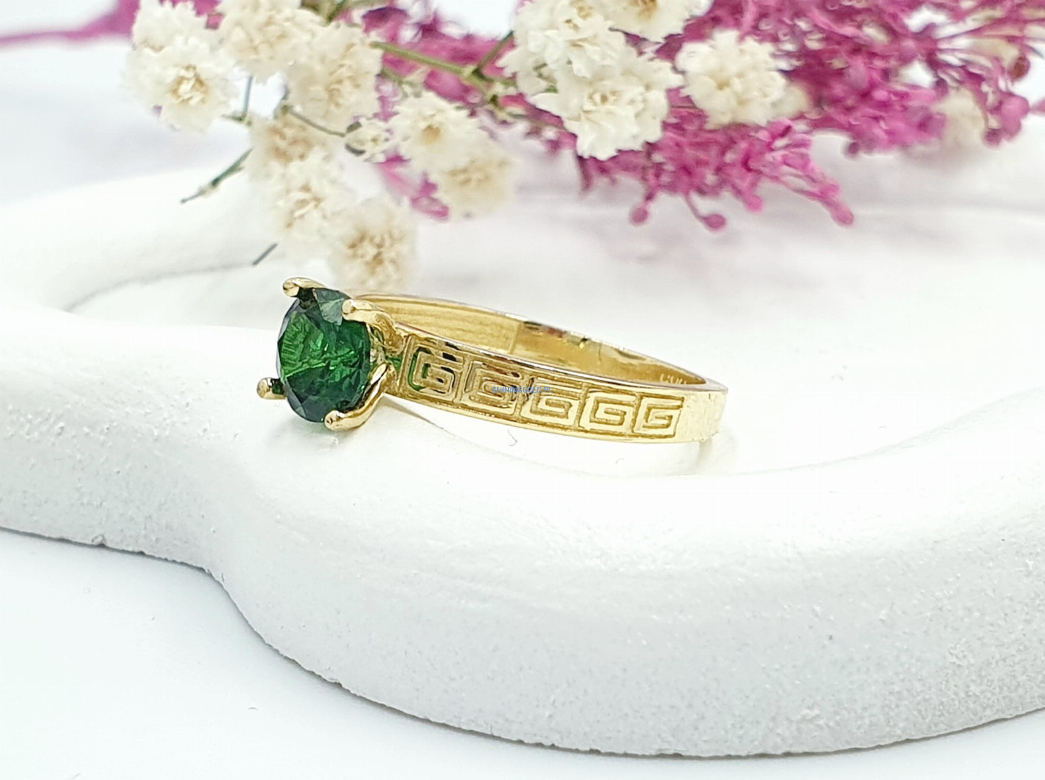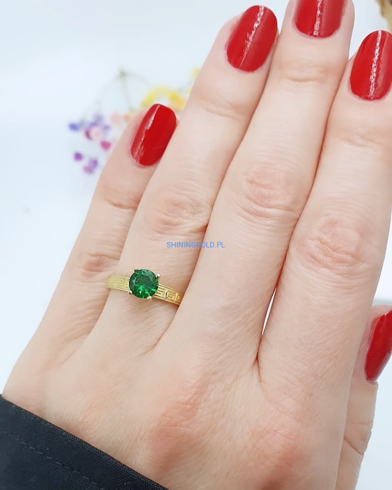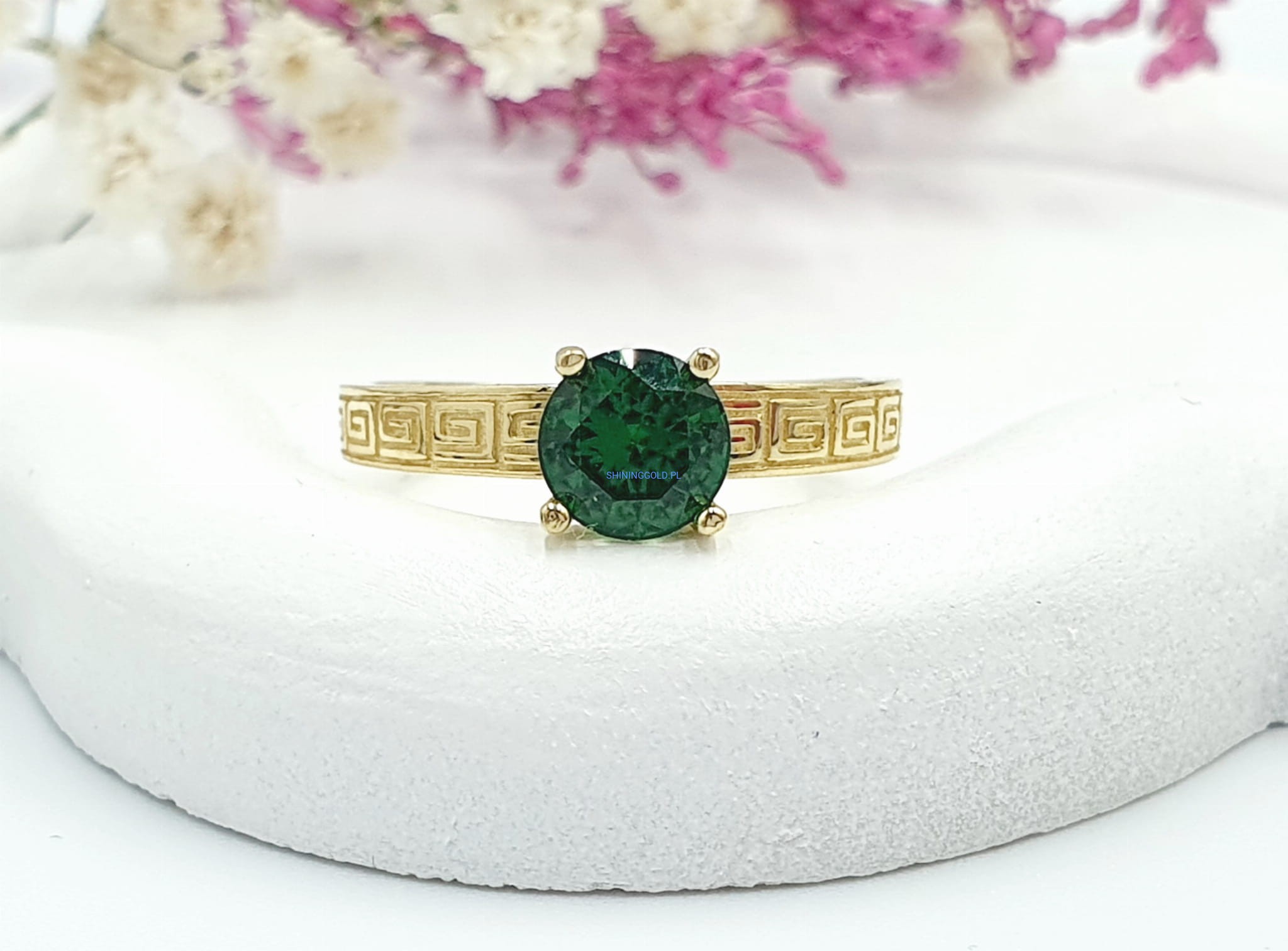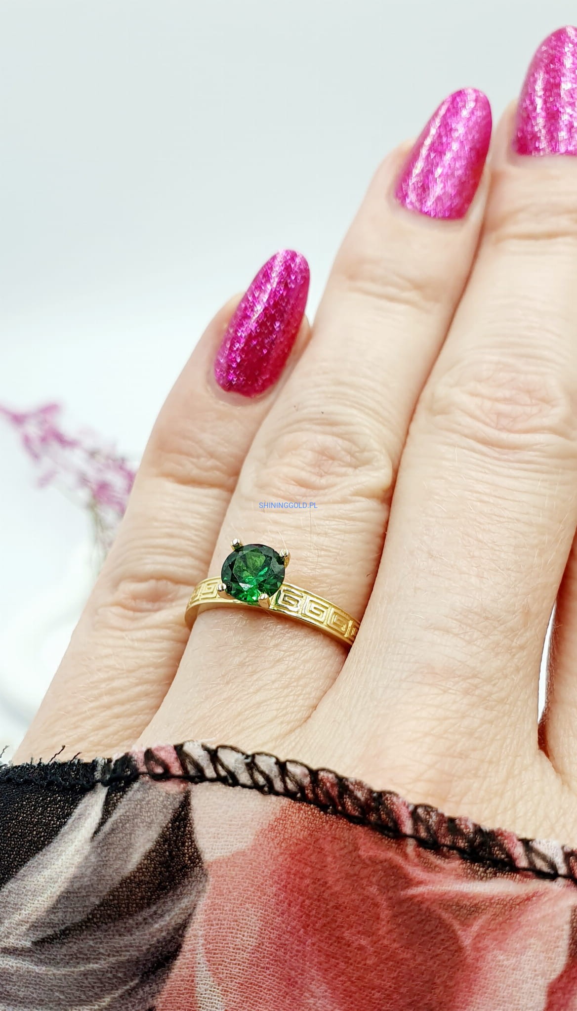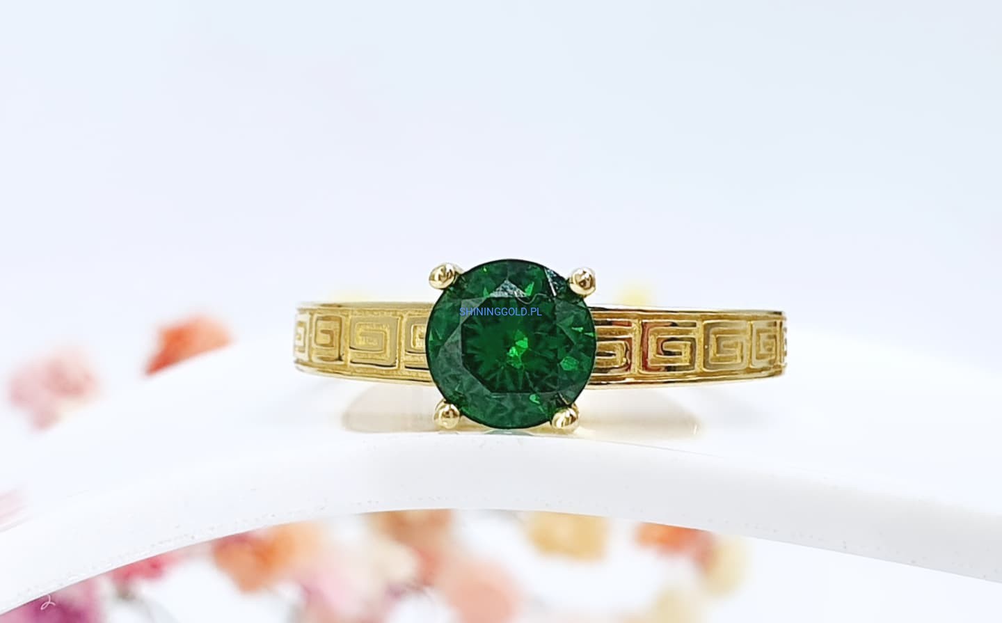 Złoty, nowy pierścionek z zieloną cyrkonią i wzorem greckim