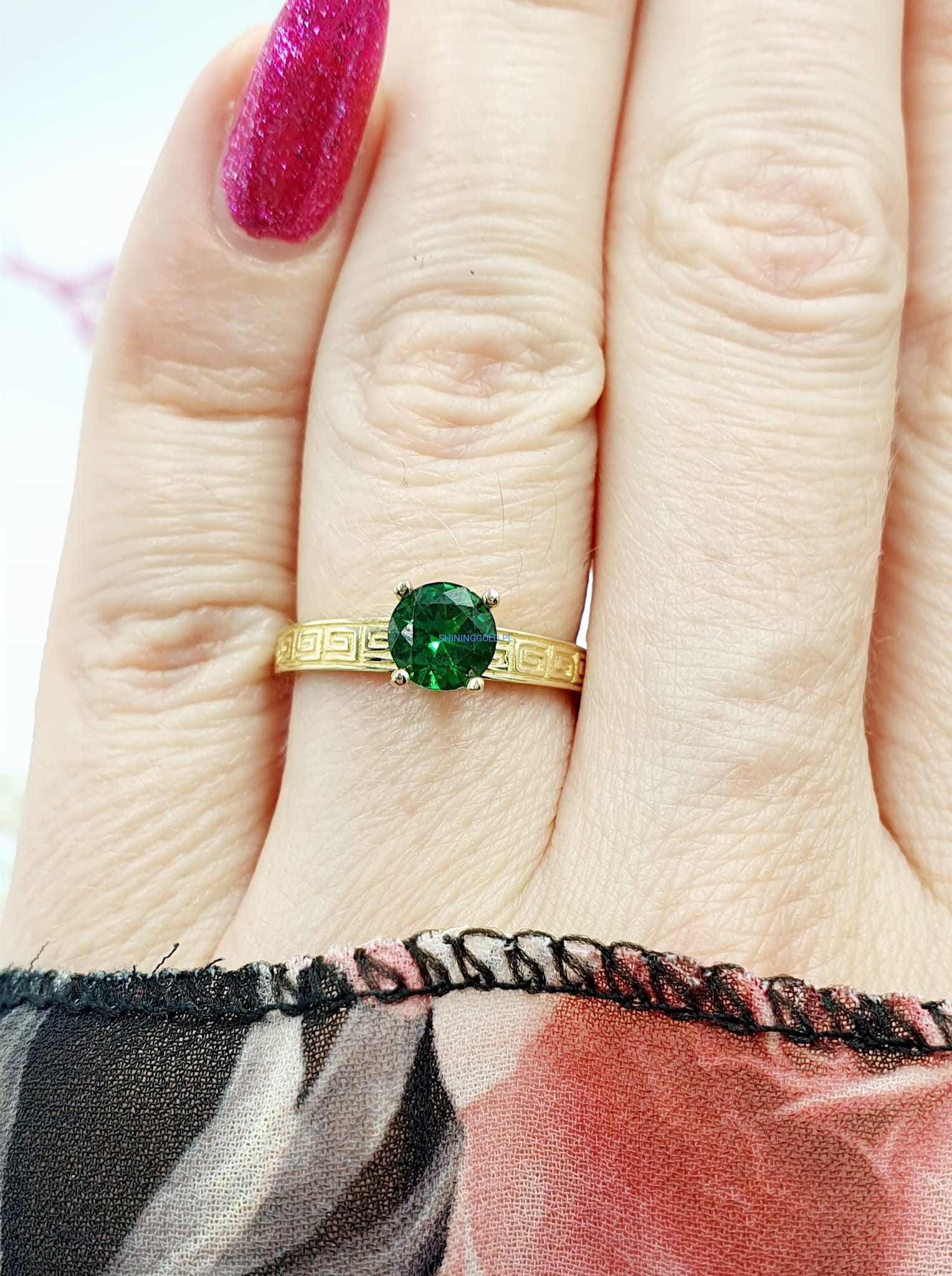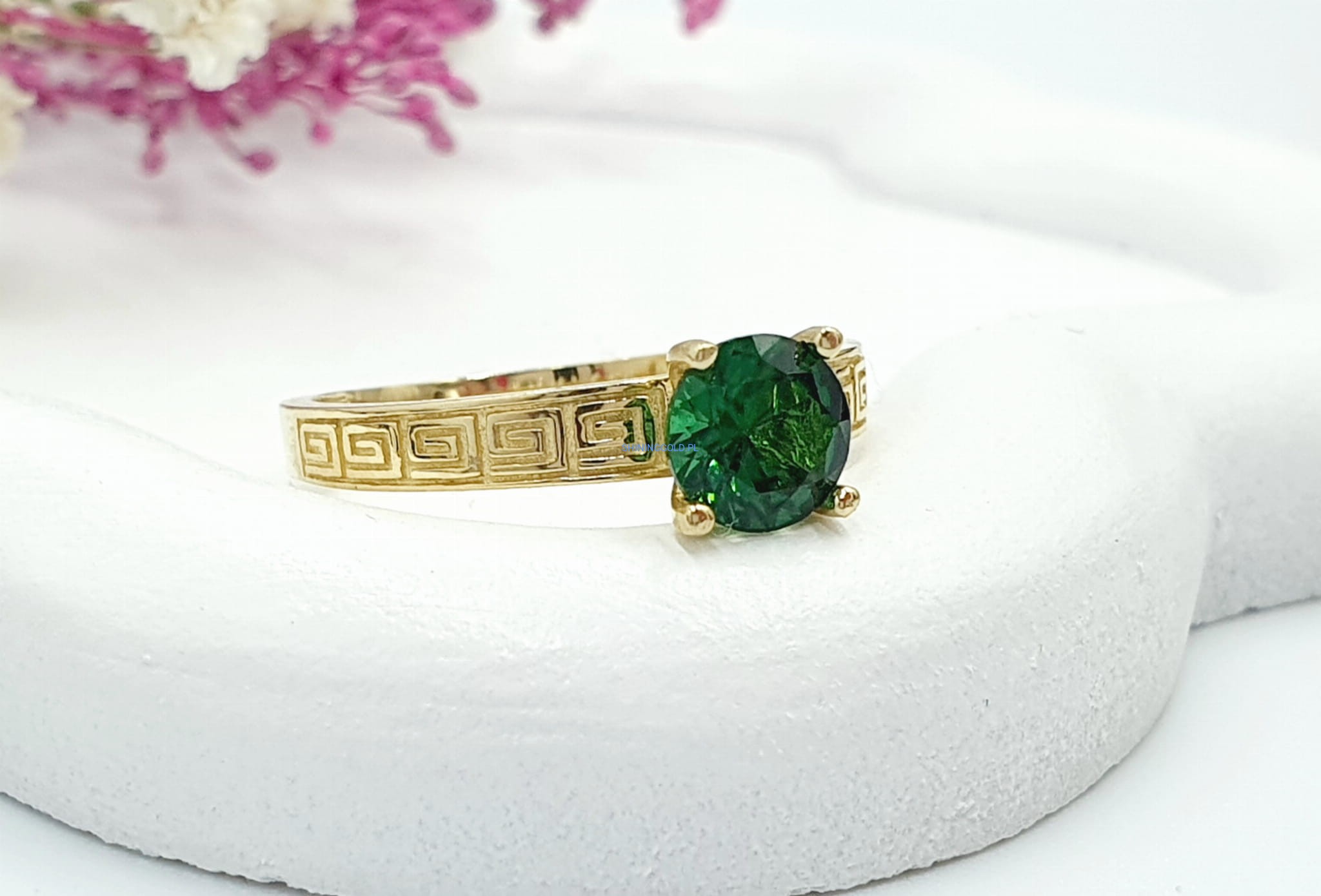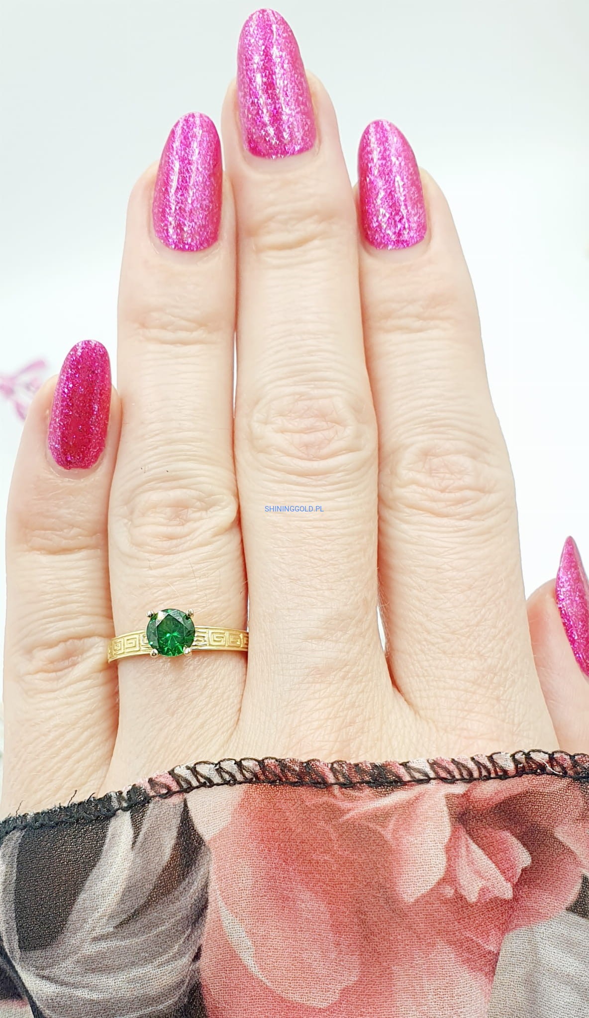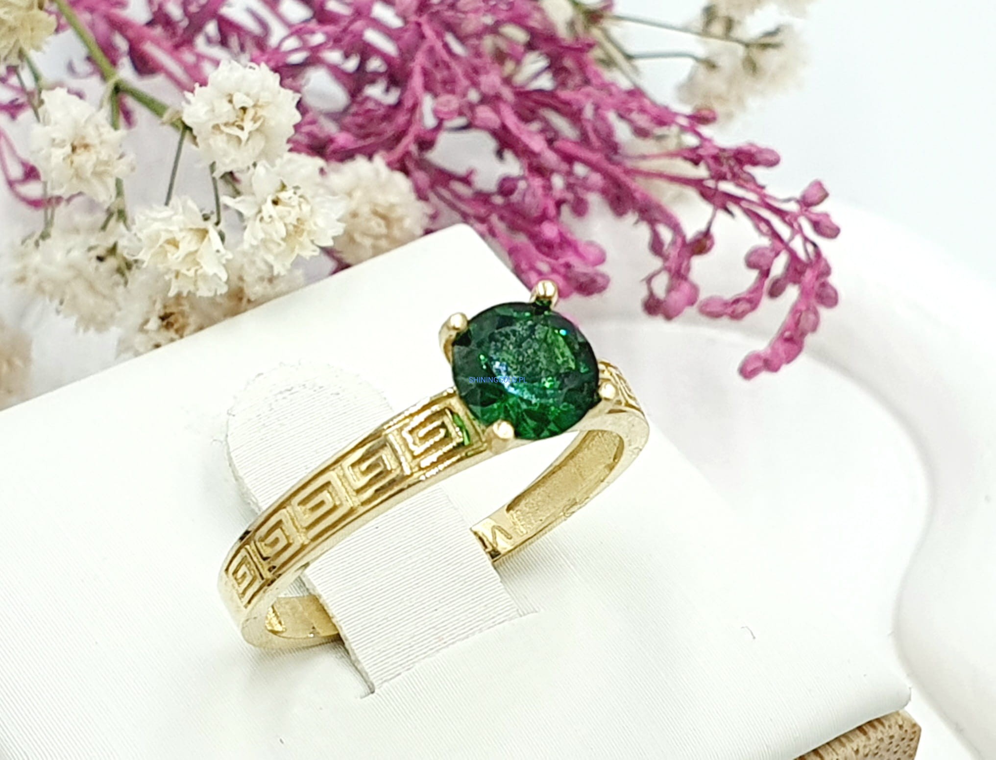 Złoty, nowy pierścionek z zieloną cyrkonią i wzorem greckim