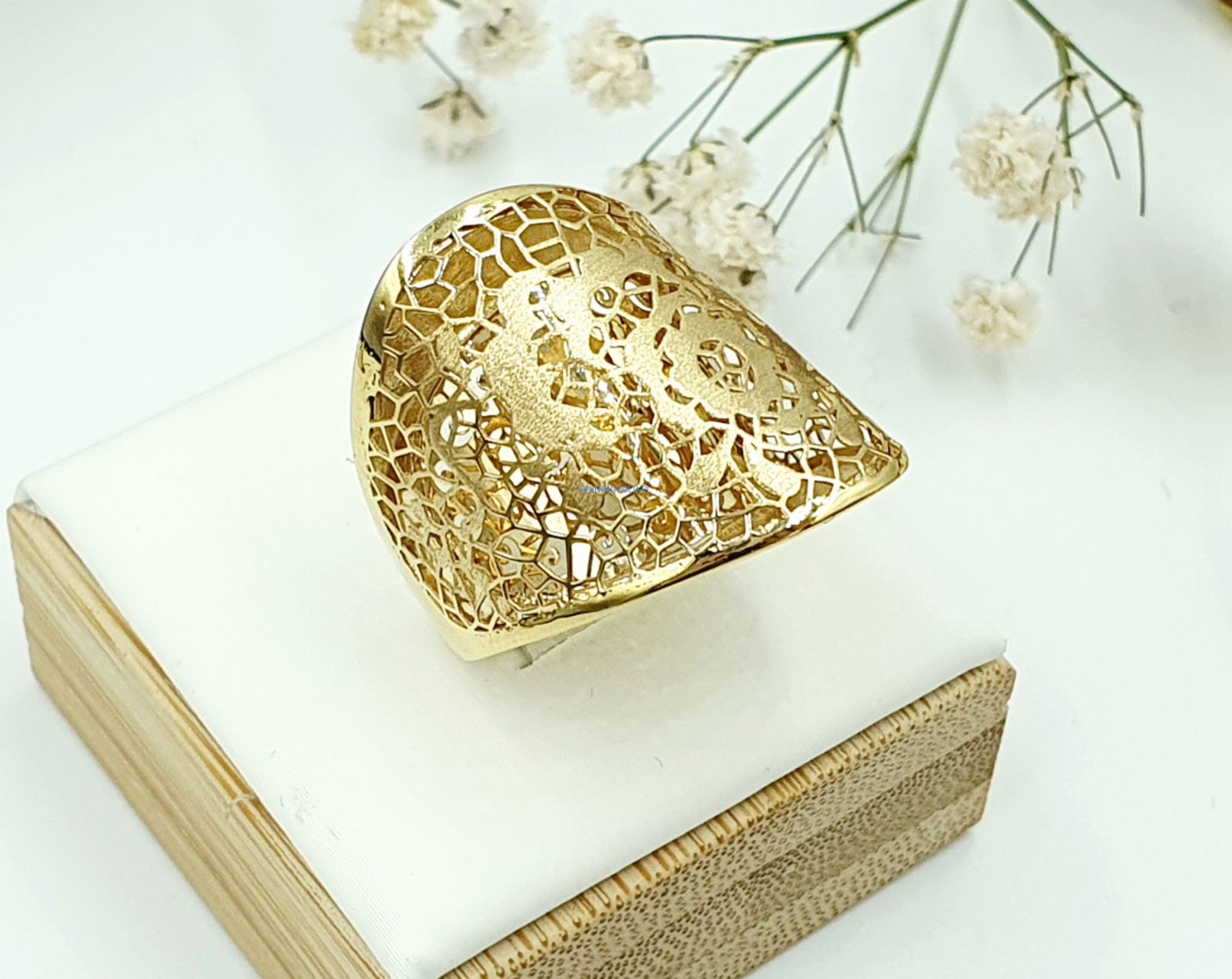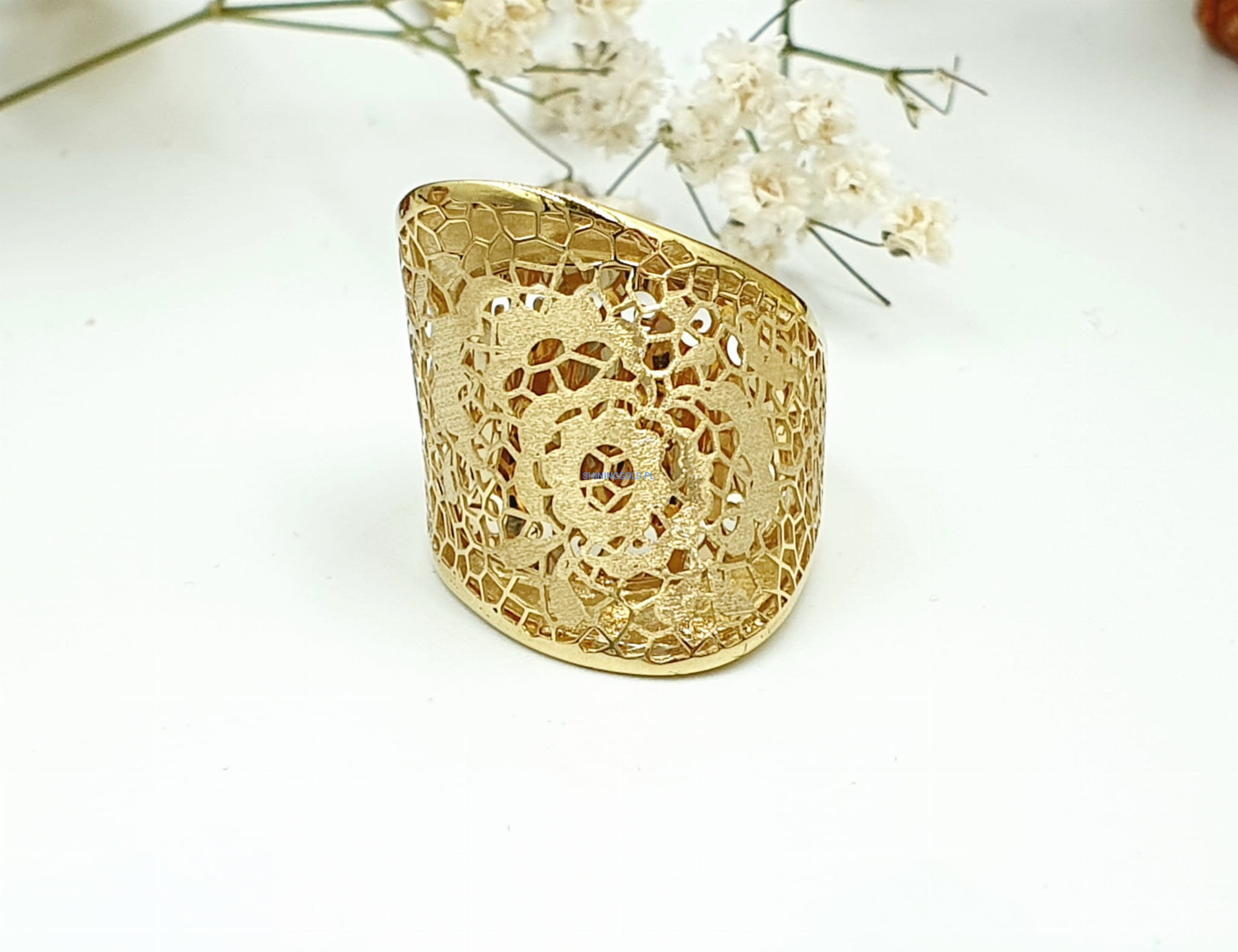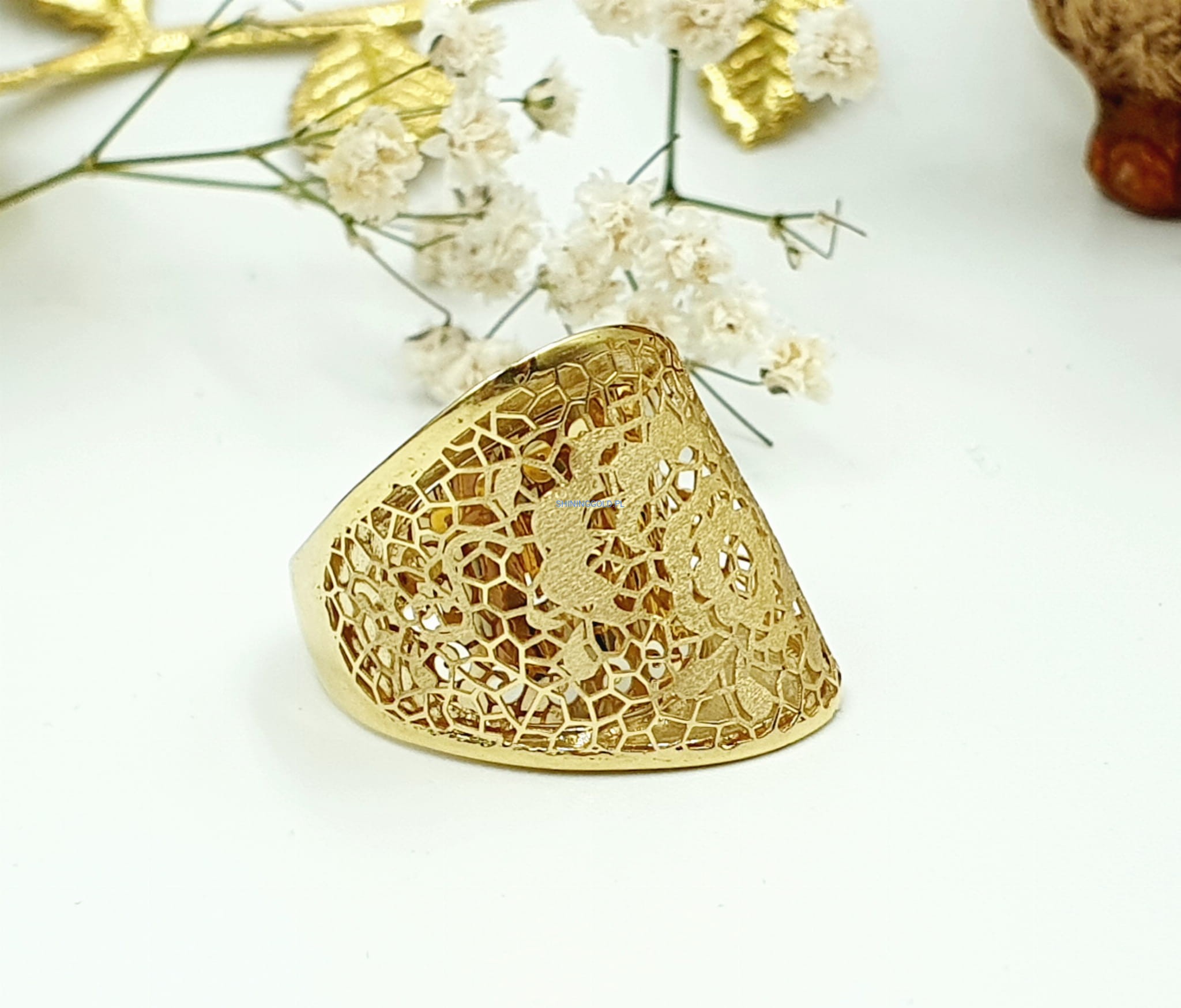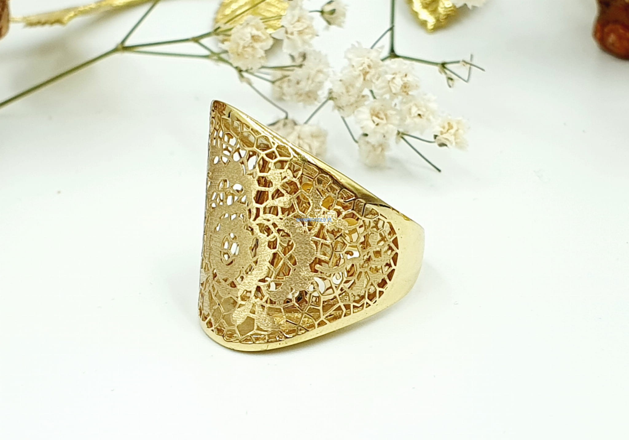 Przepiękny złoty pierścionek o misternym ażurowym wzorze, ozdobiony delikatnym motywem kwiatowym. Idealny dla miłośniczek subtelnej elegancji i naturalnych inspiracji.