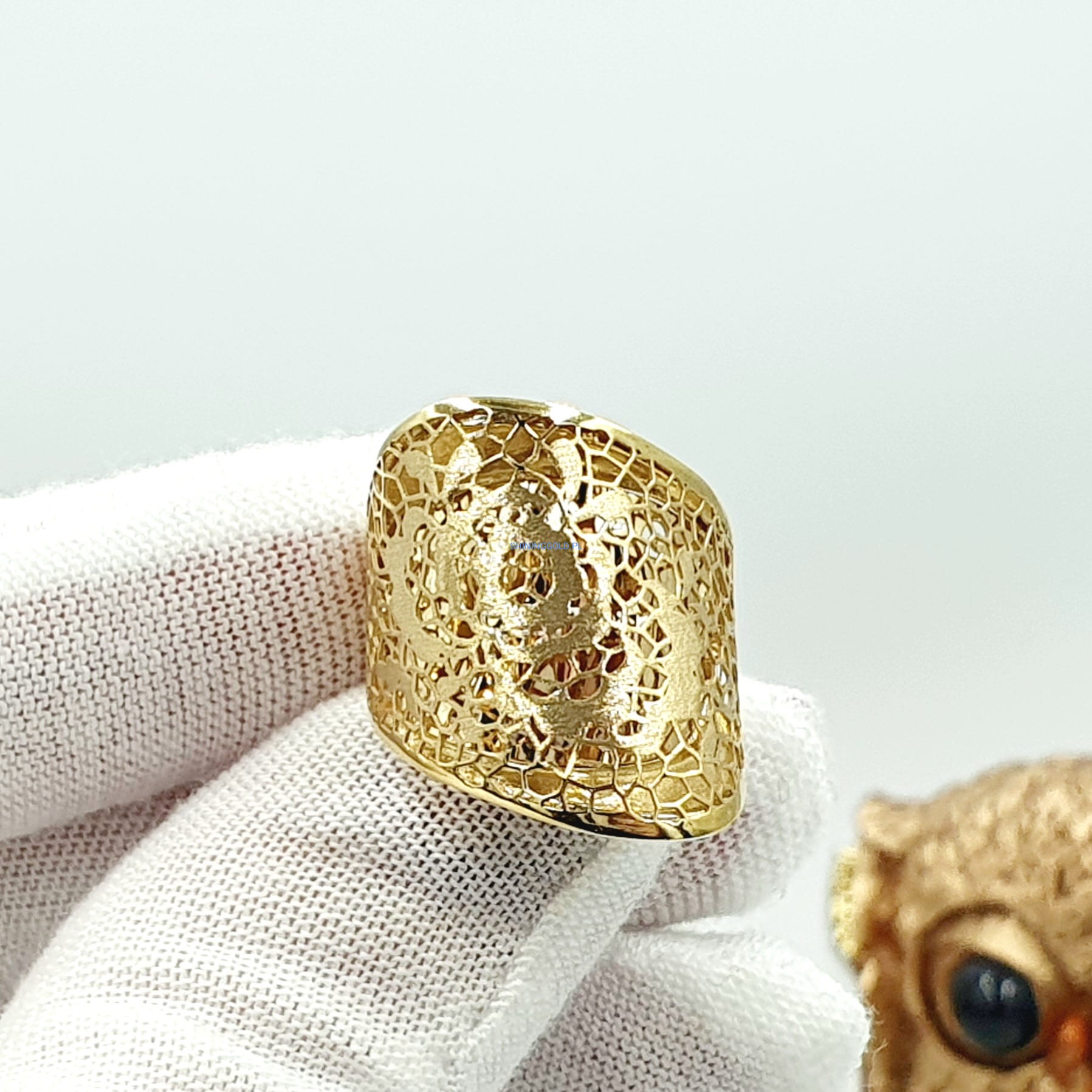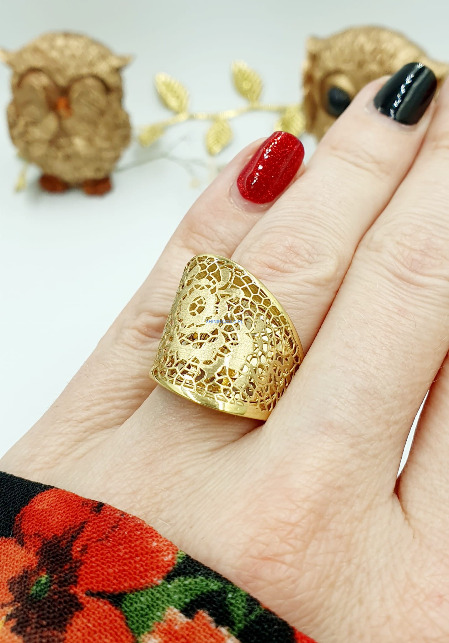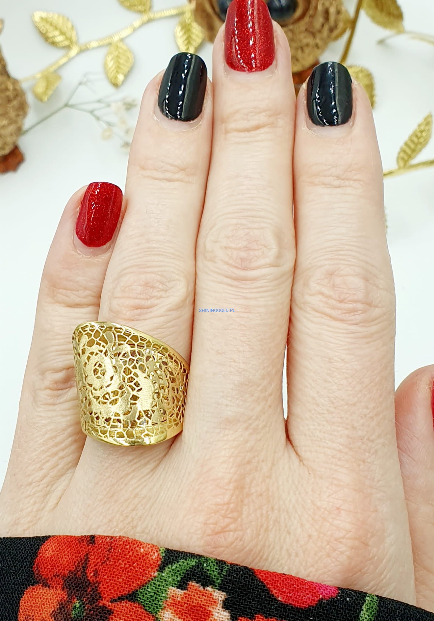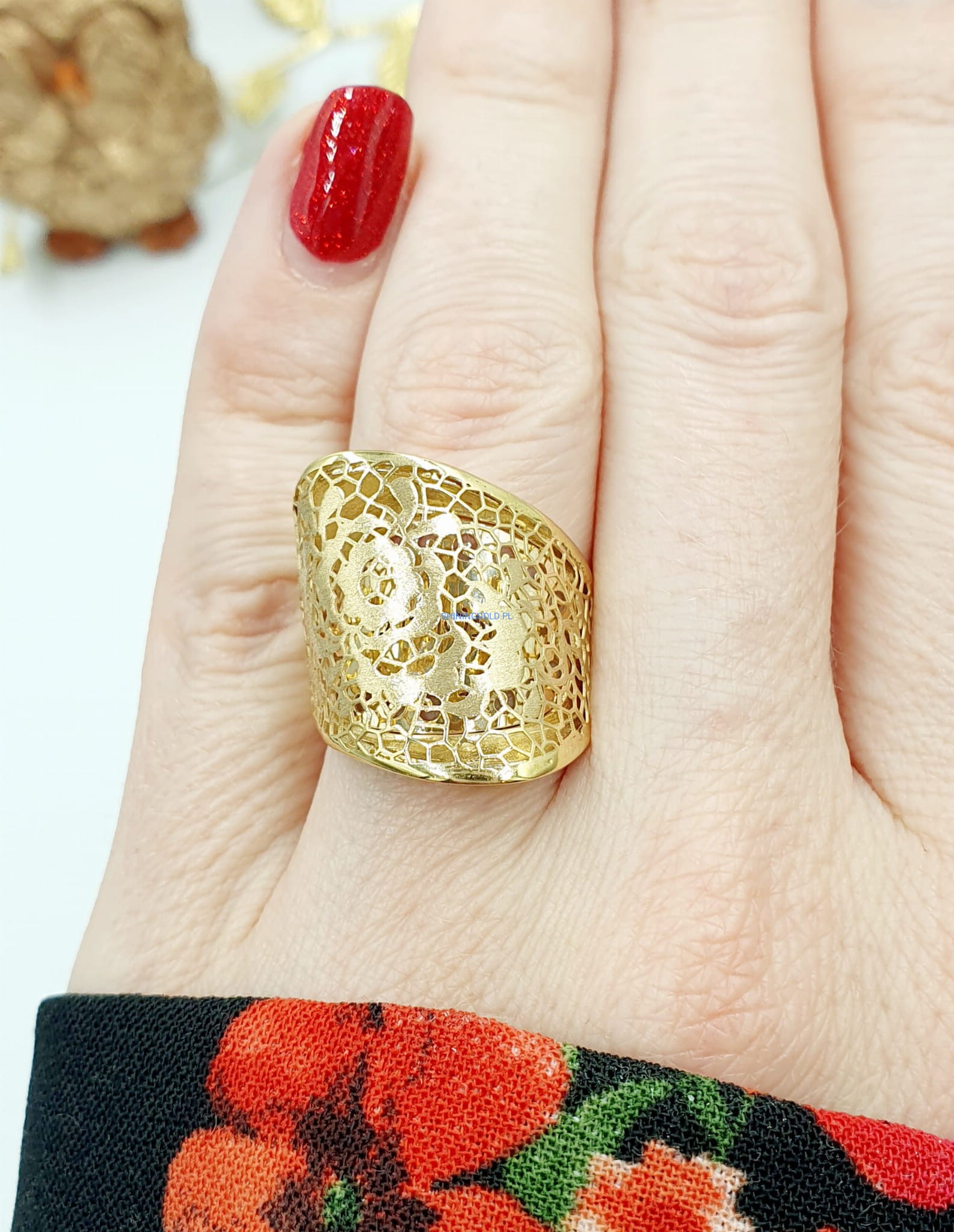 Przepiękny złoty pierścionek o misternym ażurowym wzorze, ozdobiony delikatnym motywem kwiatowym. Idealny dla miłośniczek subtelnej elegancji i naturalnych inspiracji.