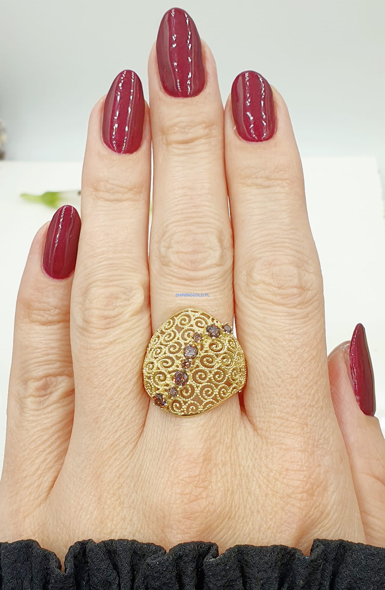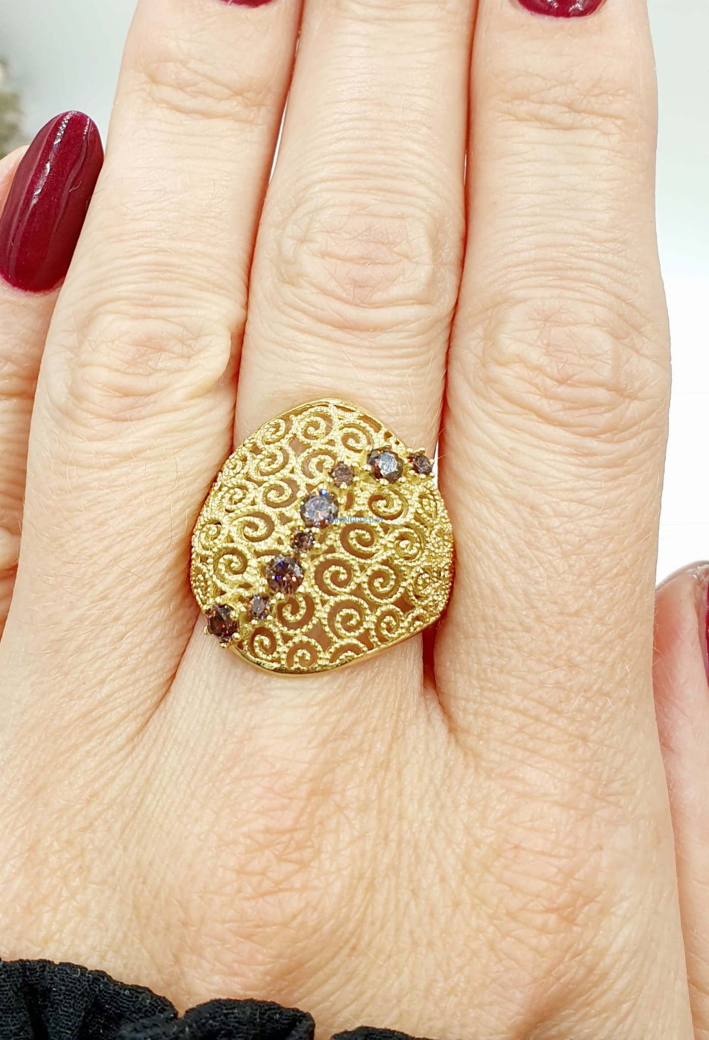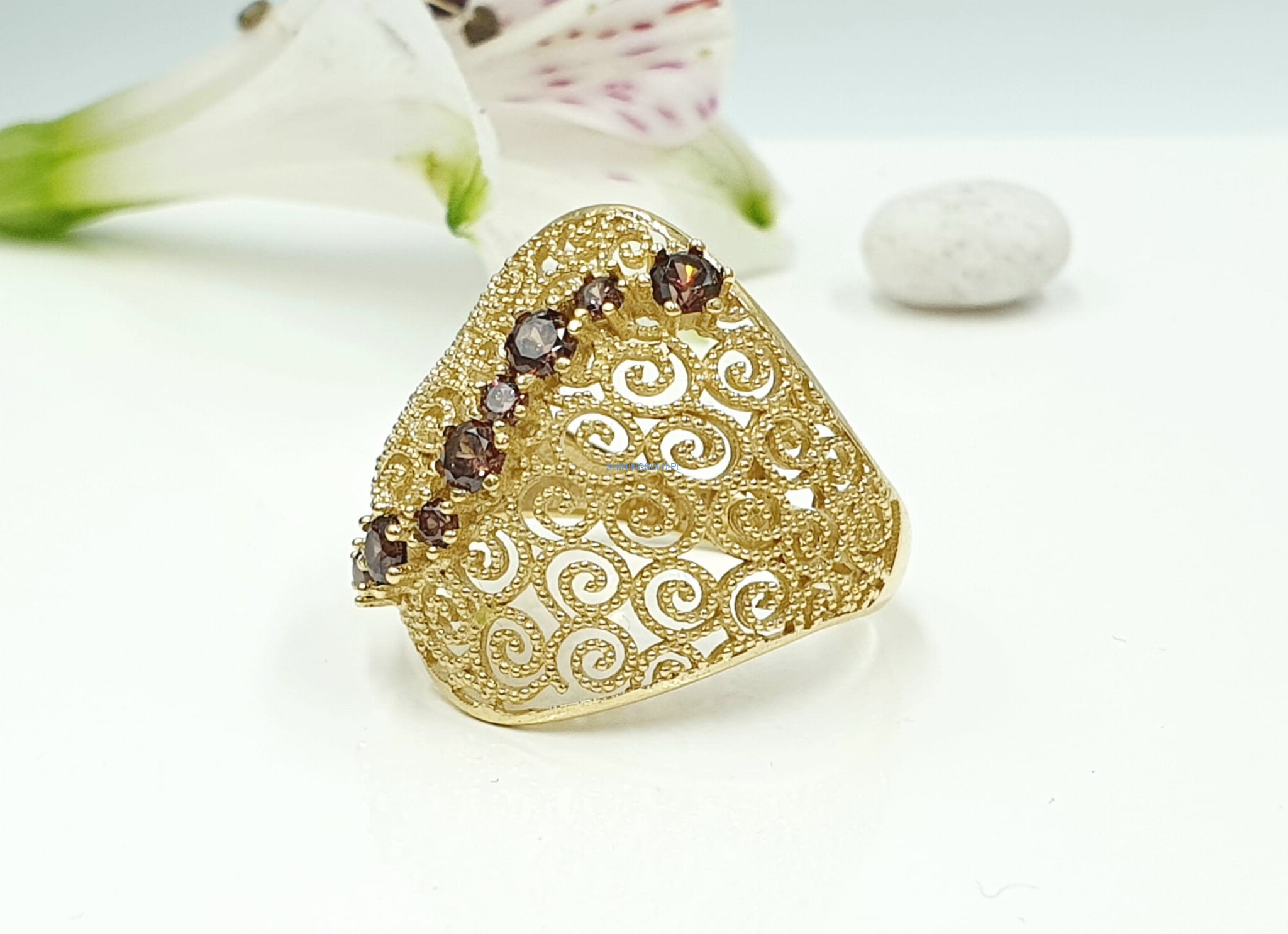 - Brązowe cyrkonie, które pięknie kontrastują ze złotem, dodając pierścionkowi subtelnego blasku.