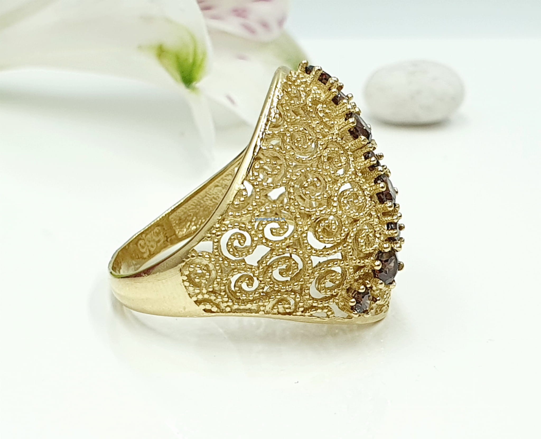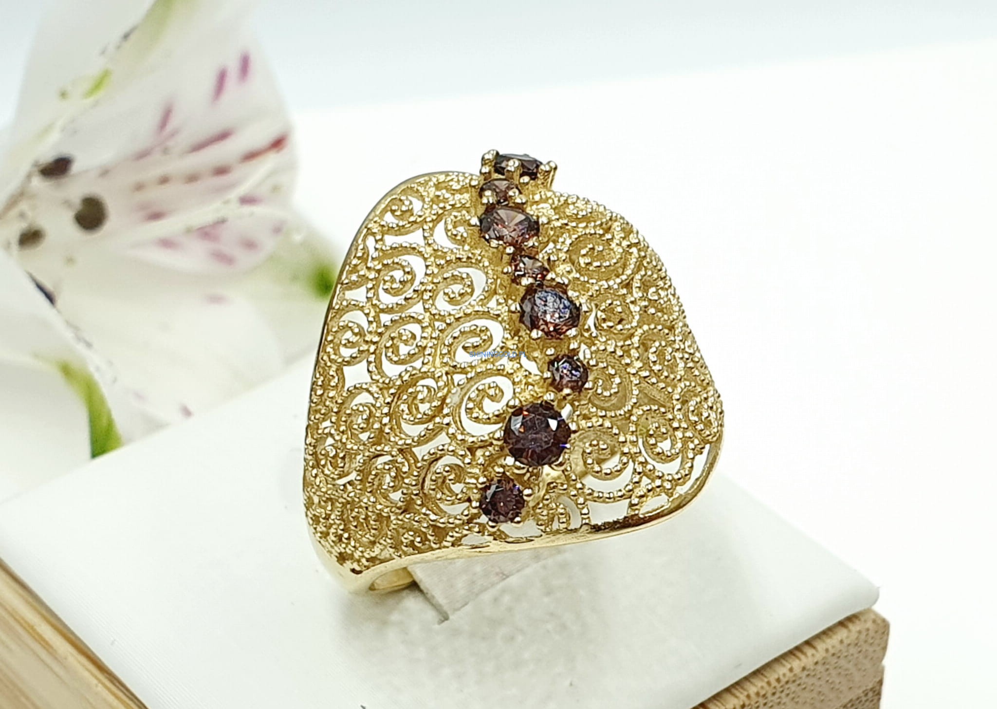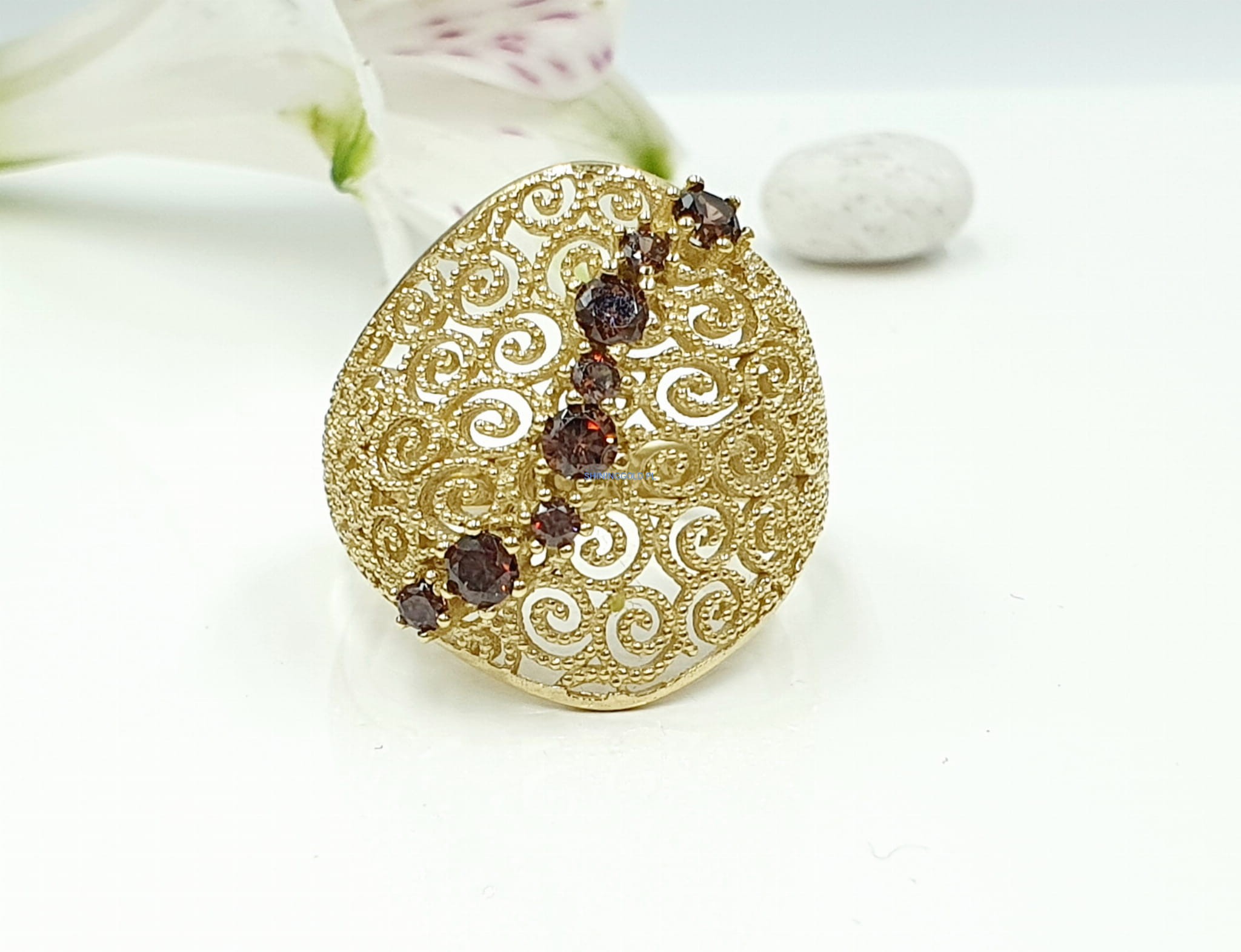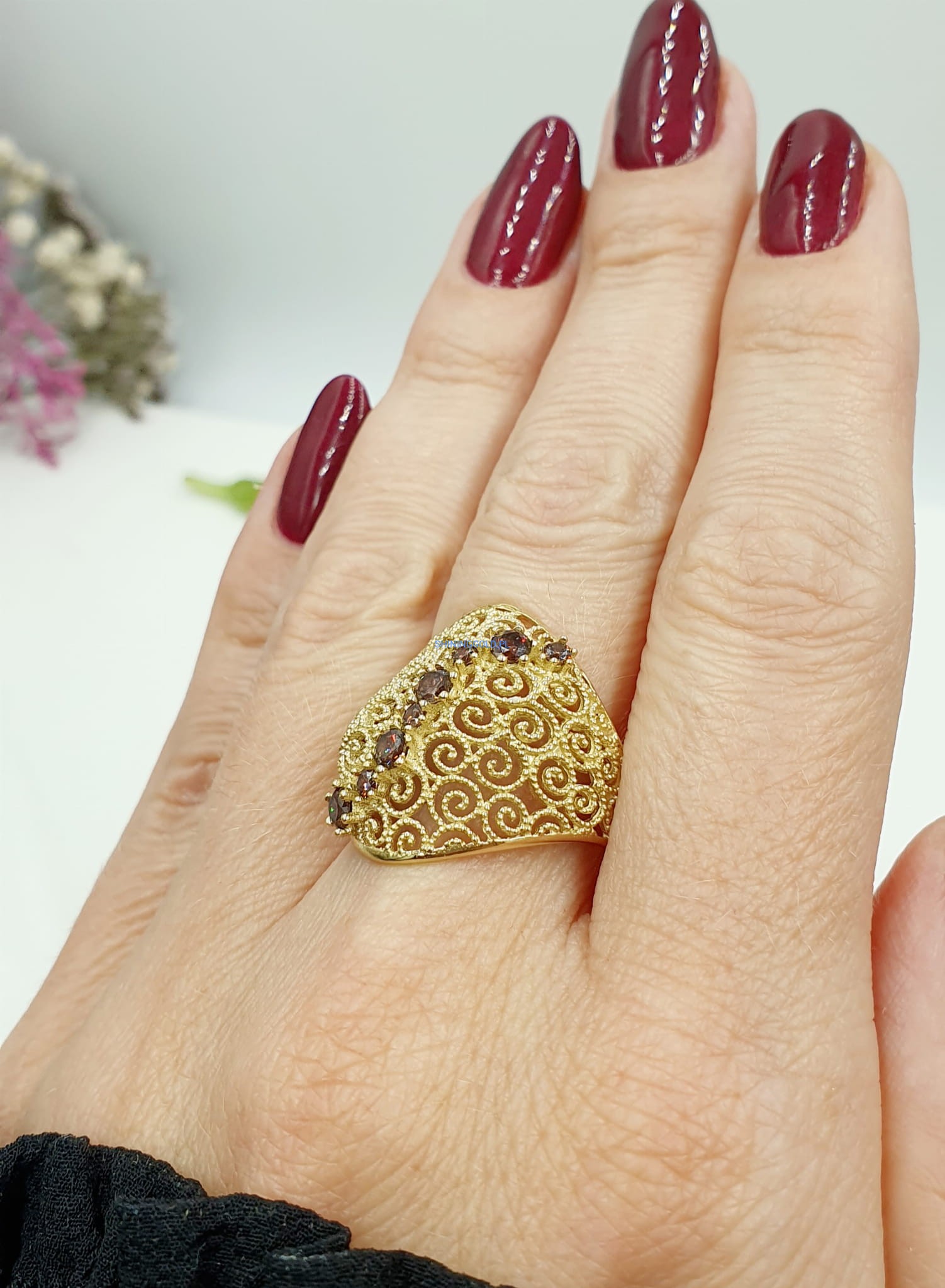 - Brązowe cyrkonie, które pięknie kontrastują ze złotem, dodając pierścionkowi subtelnego blasku.
