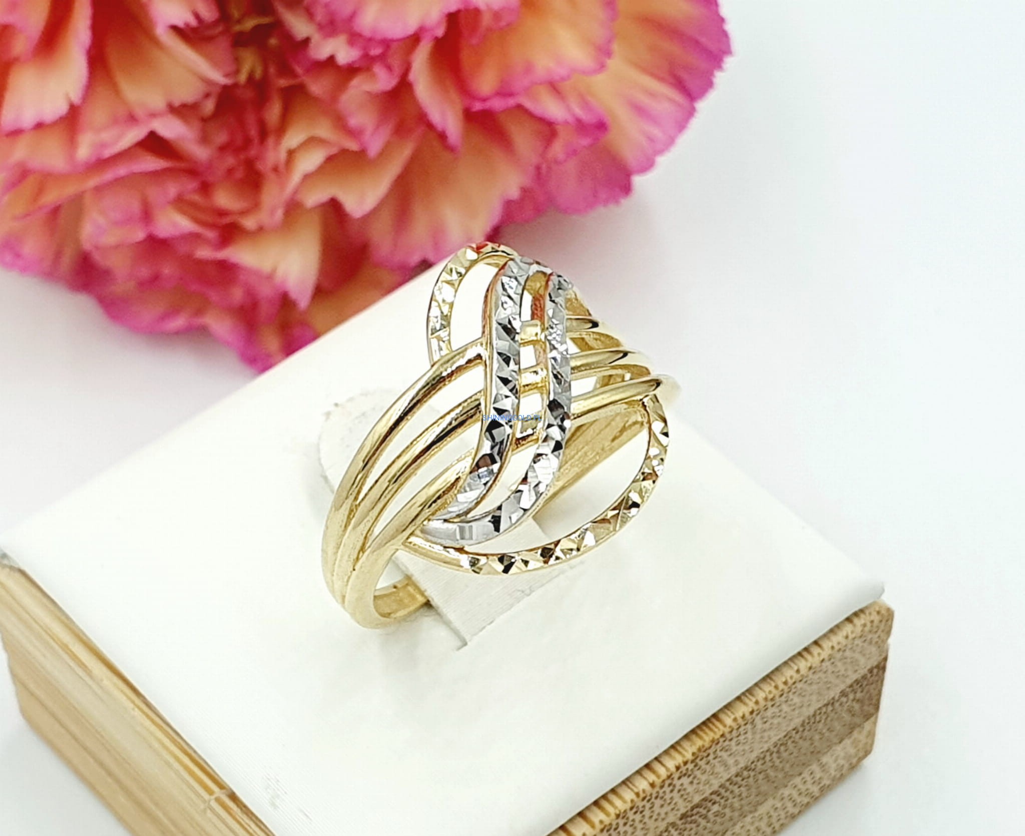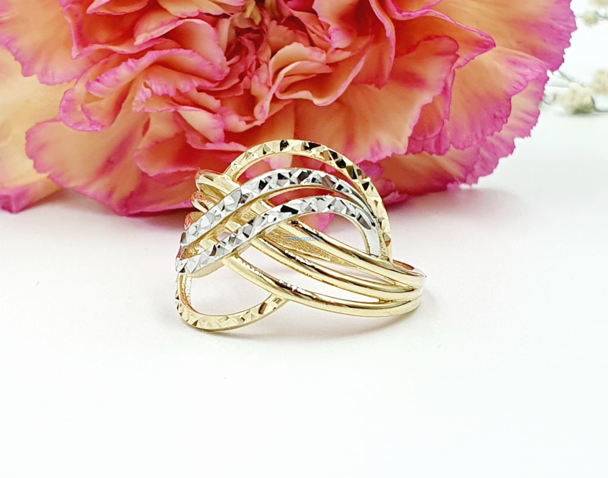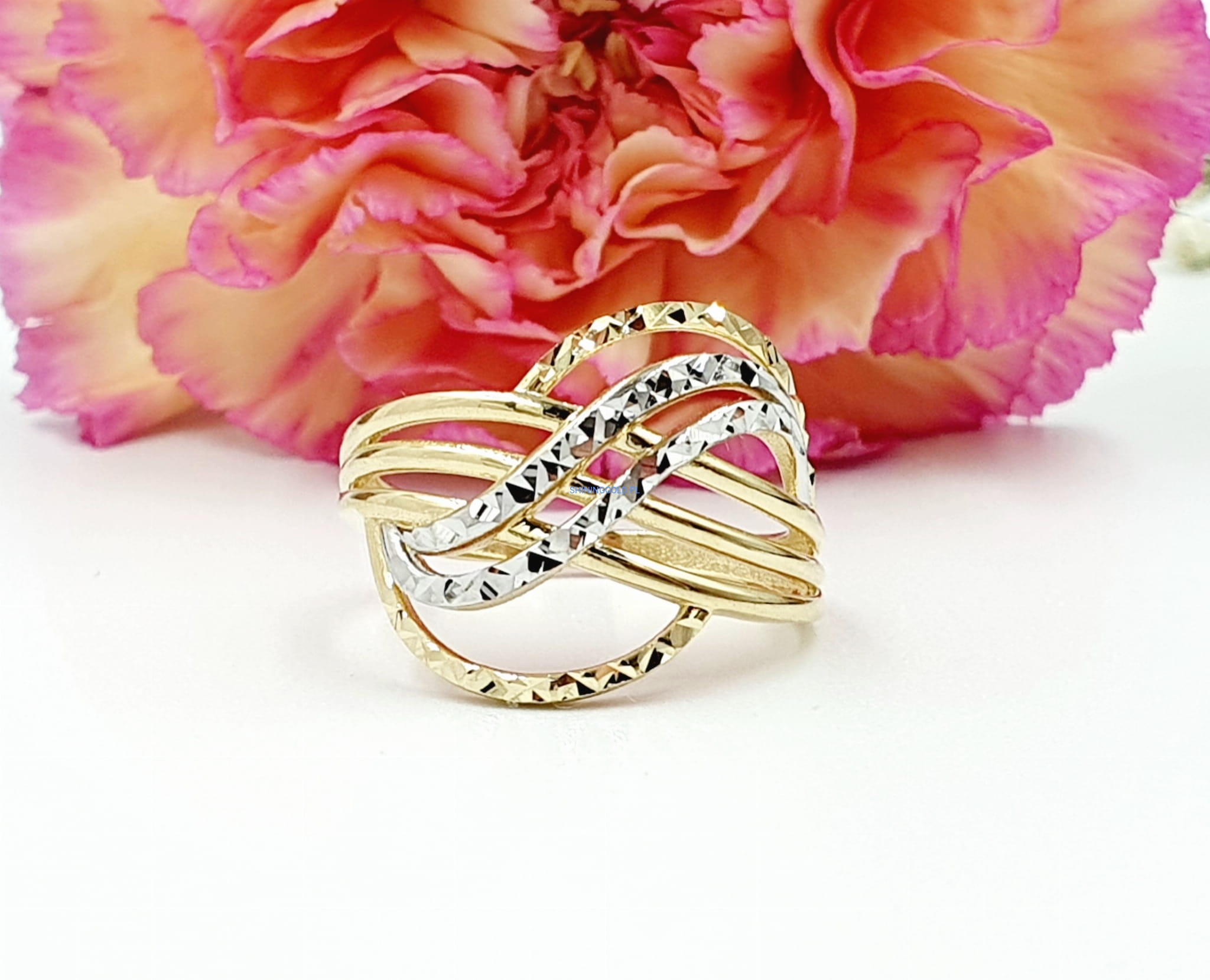Elegancki złoty pierścionek o unikatowym wzorze, który zachwyca finezją i subtelnością detali. Idealny na wyjątkowe okazje, a także jako elegancki dodatek do codziennych stylizacji.