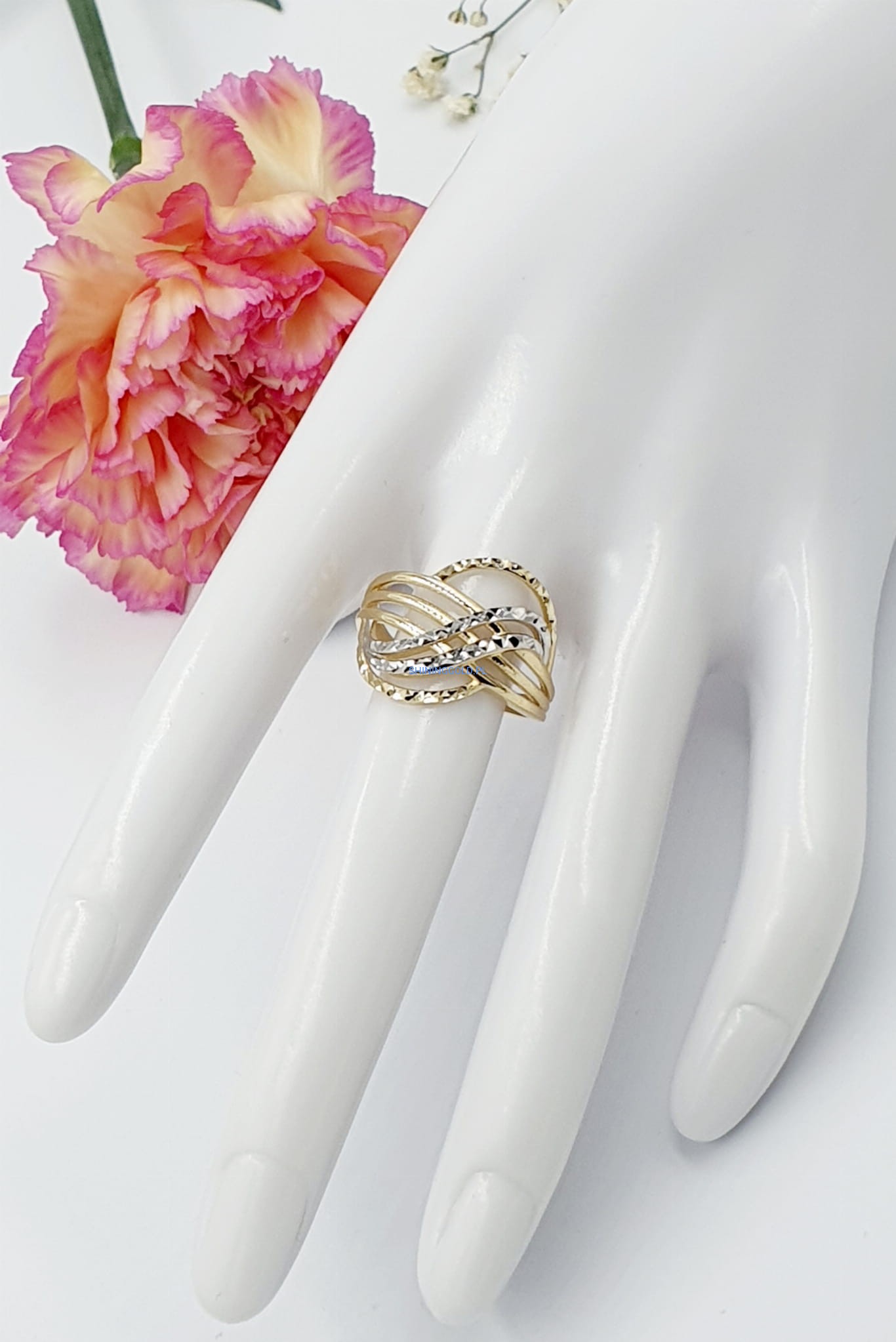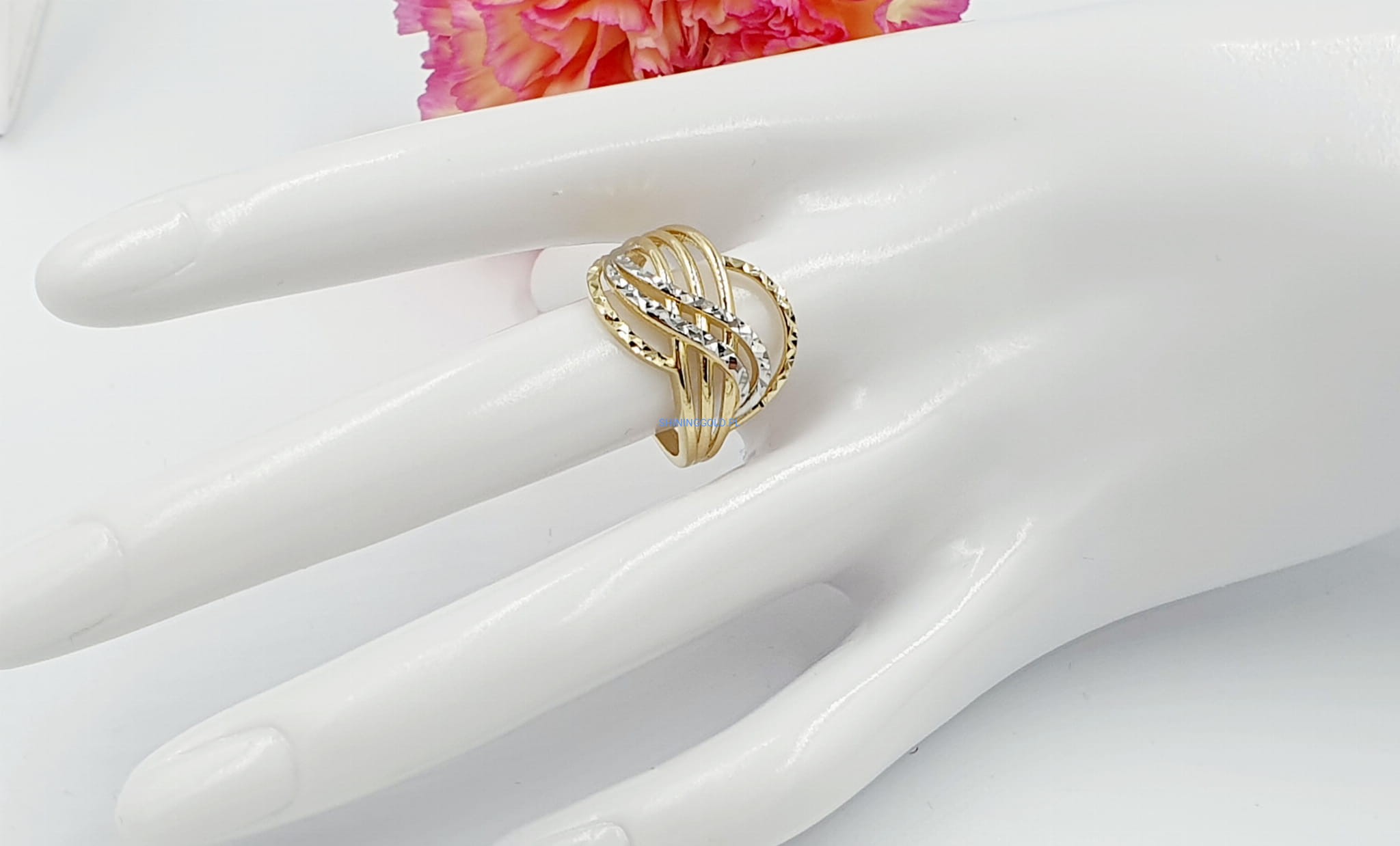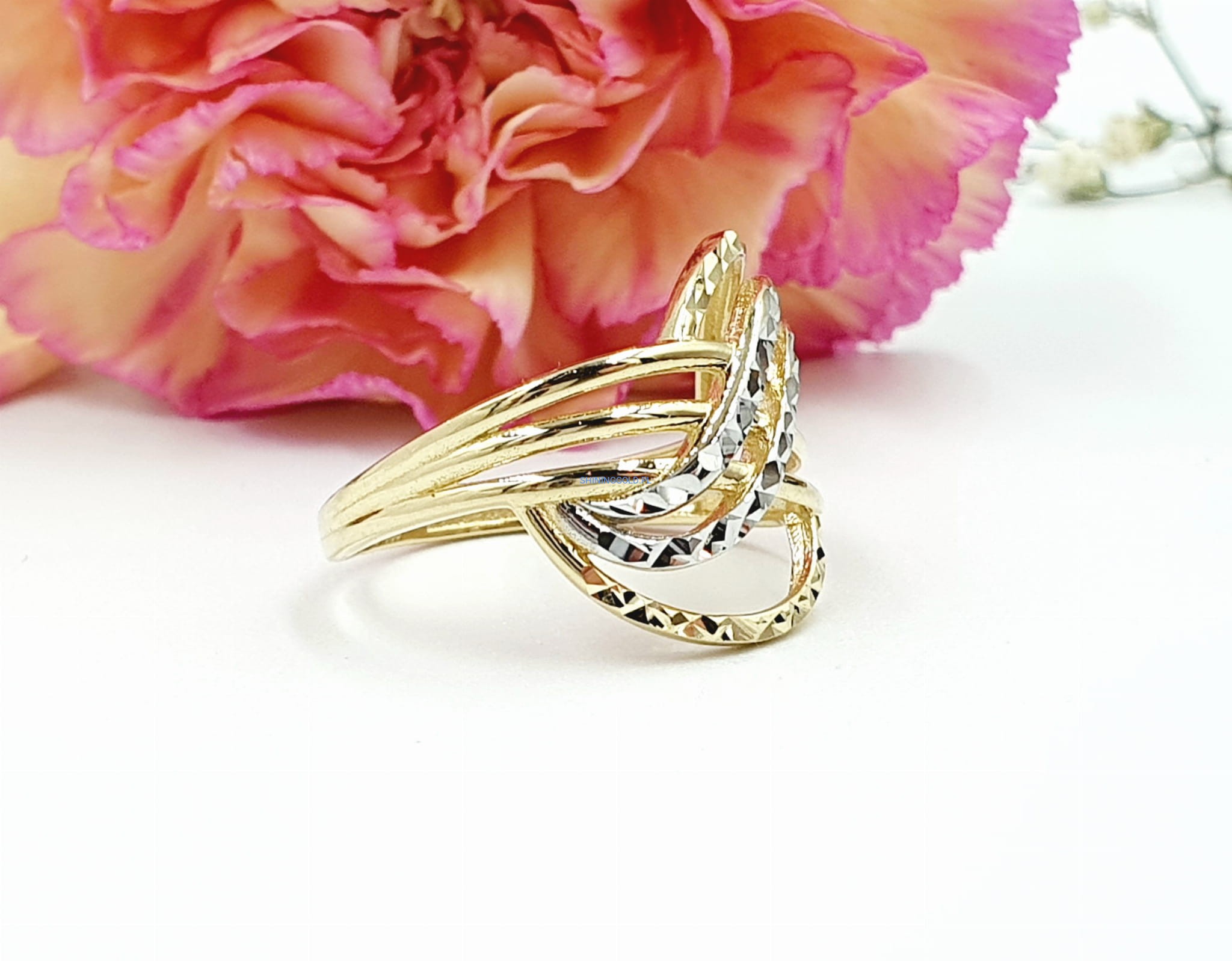 Elegancki złoty pierścionek o unikatowym wzorze, który zachwyca finezją i subtelnością detali. Idealny na wyjątkowe okazje, a także jako elegancki dodatek do codziennych stylizacji.