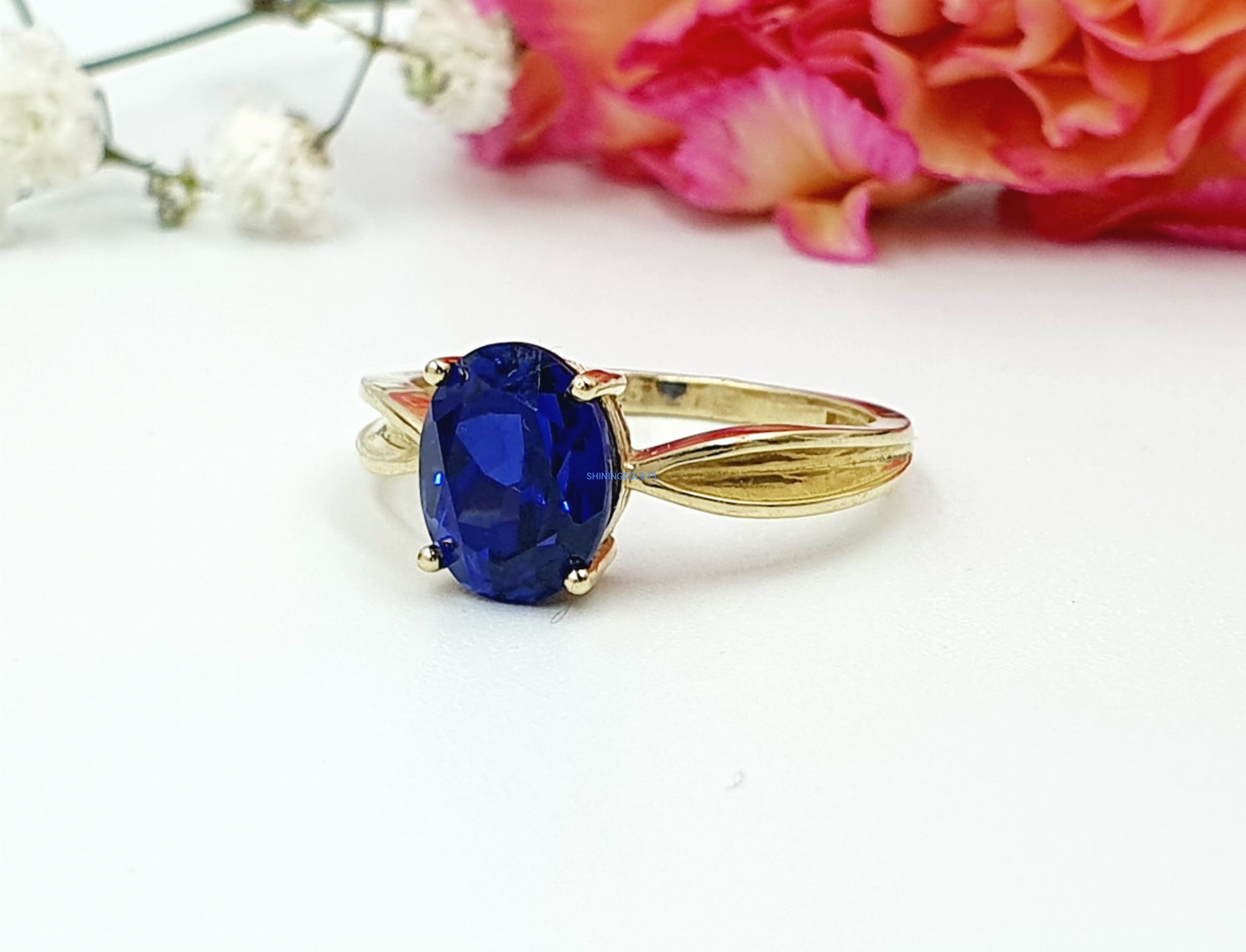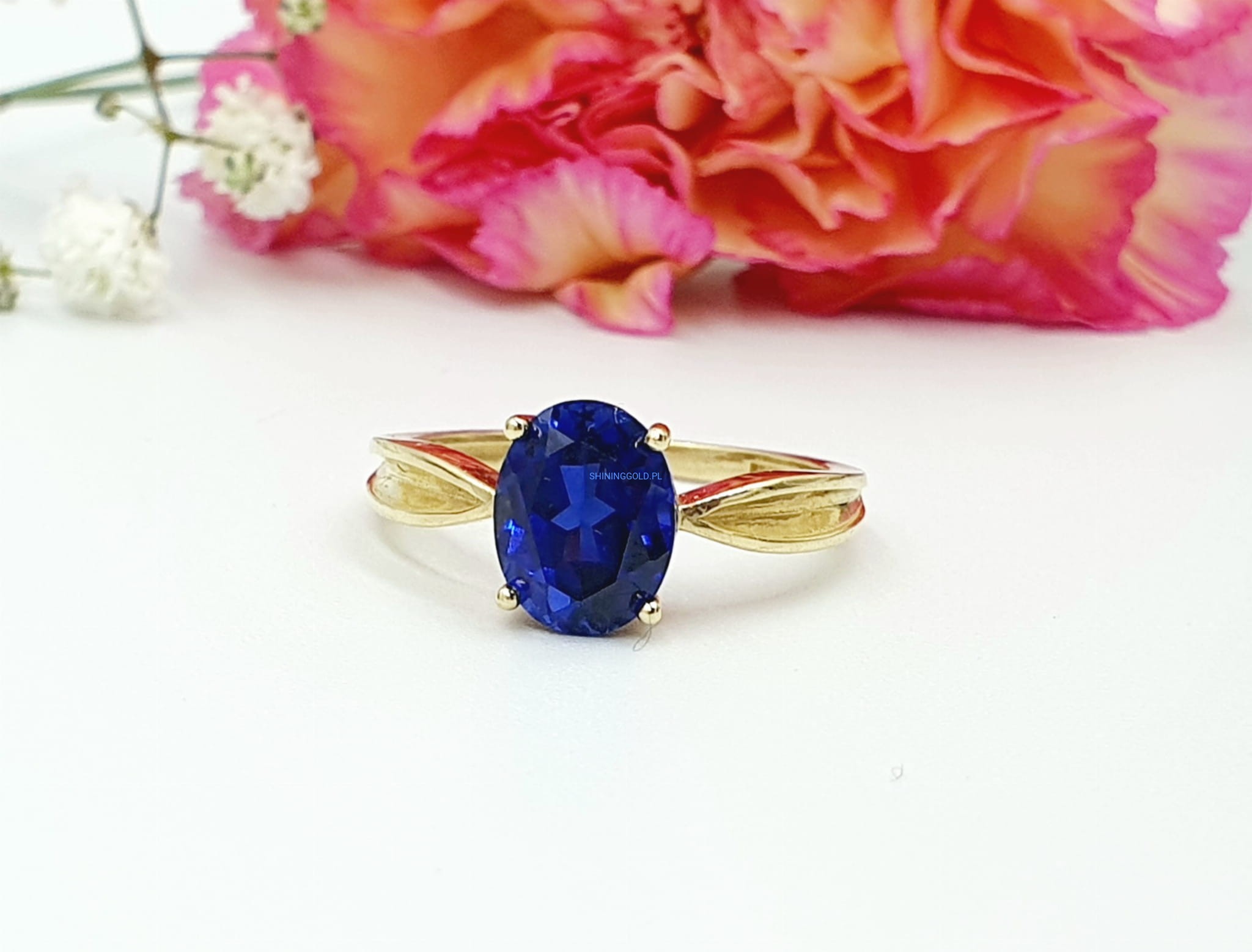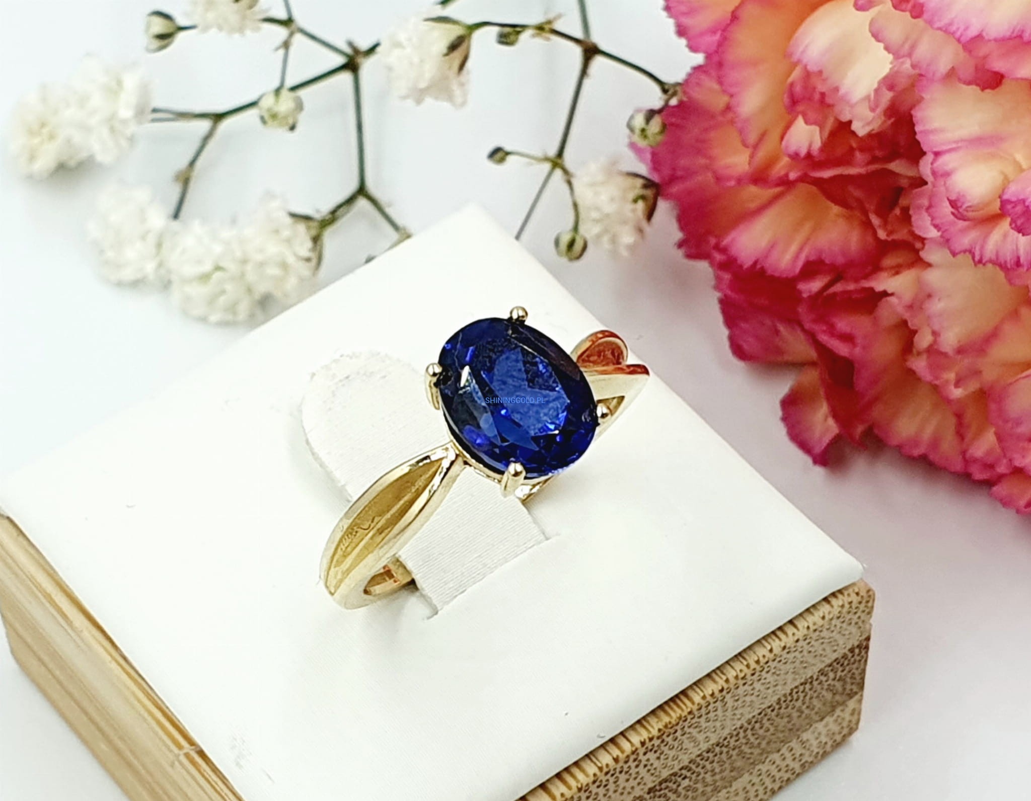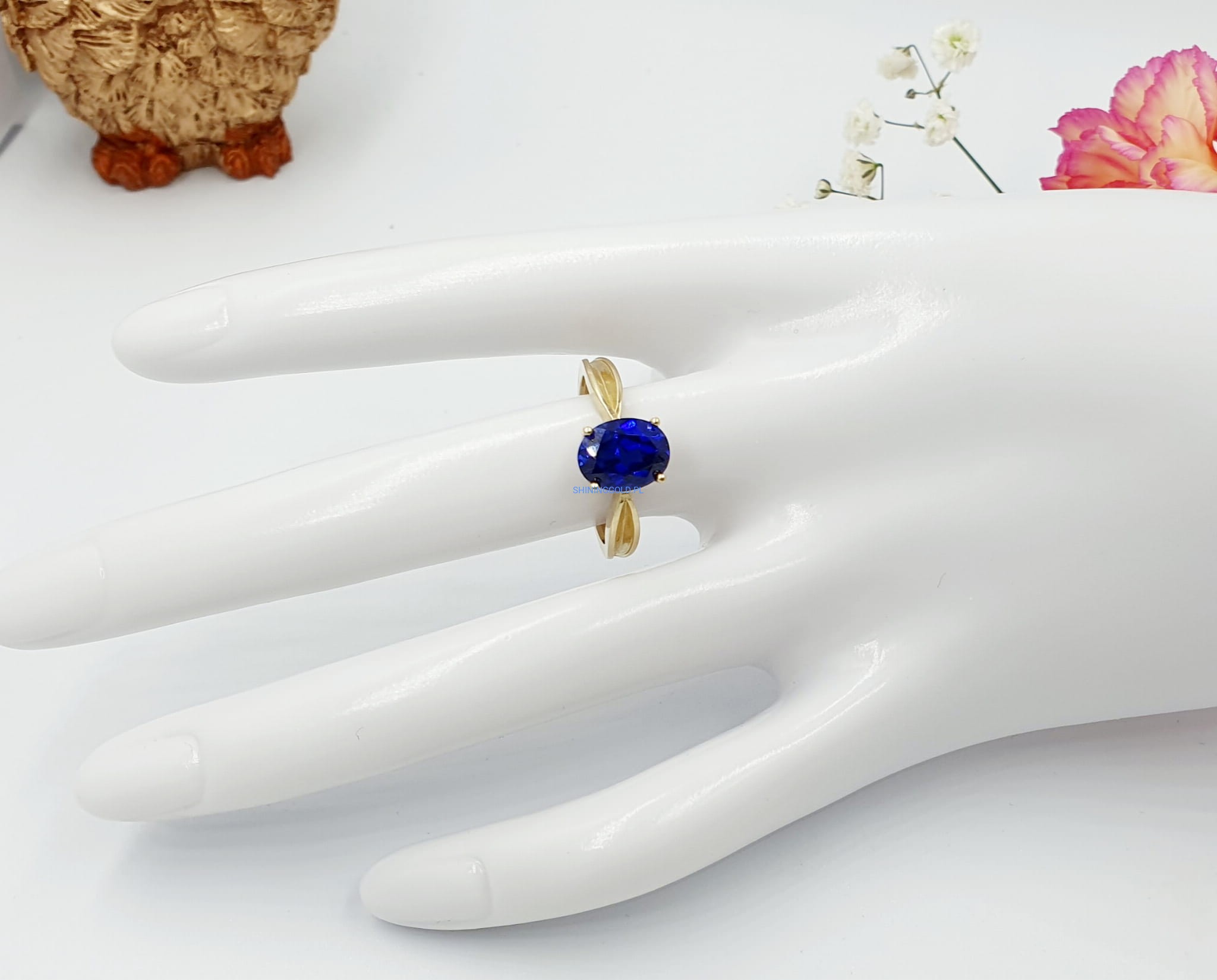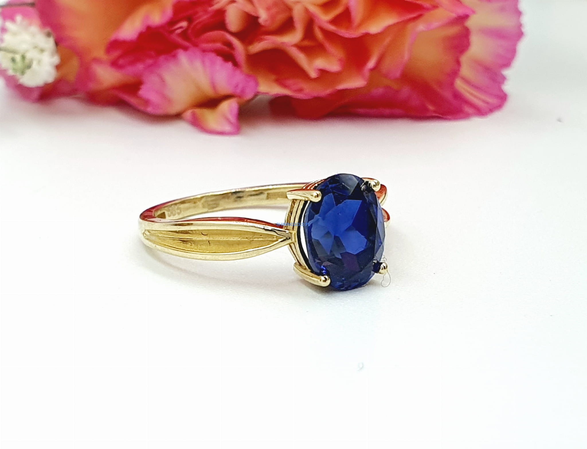 Elegancki złoty pierścionek ozdobiony niebieskim kamieniem syntetycznym, wykonany z wysokiej jakości złota próby 585. Idealny jako wyrazisty dodatek na każdą okazję.