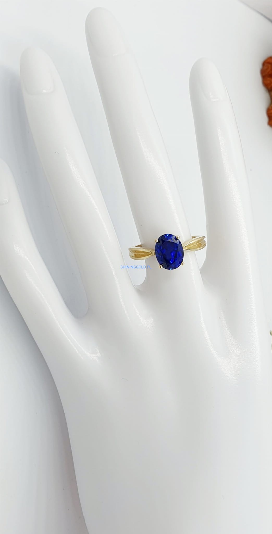 Złoty, nowy pierścionek z niebieskim kamieniem syntetycznym