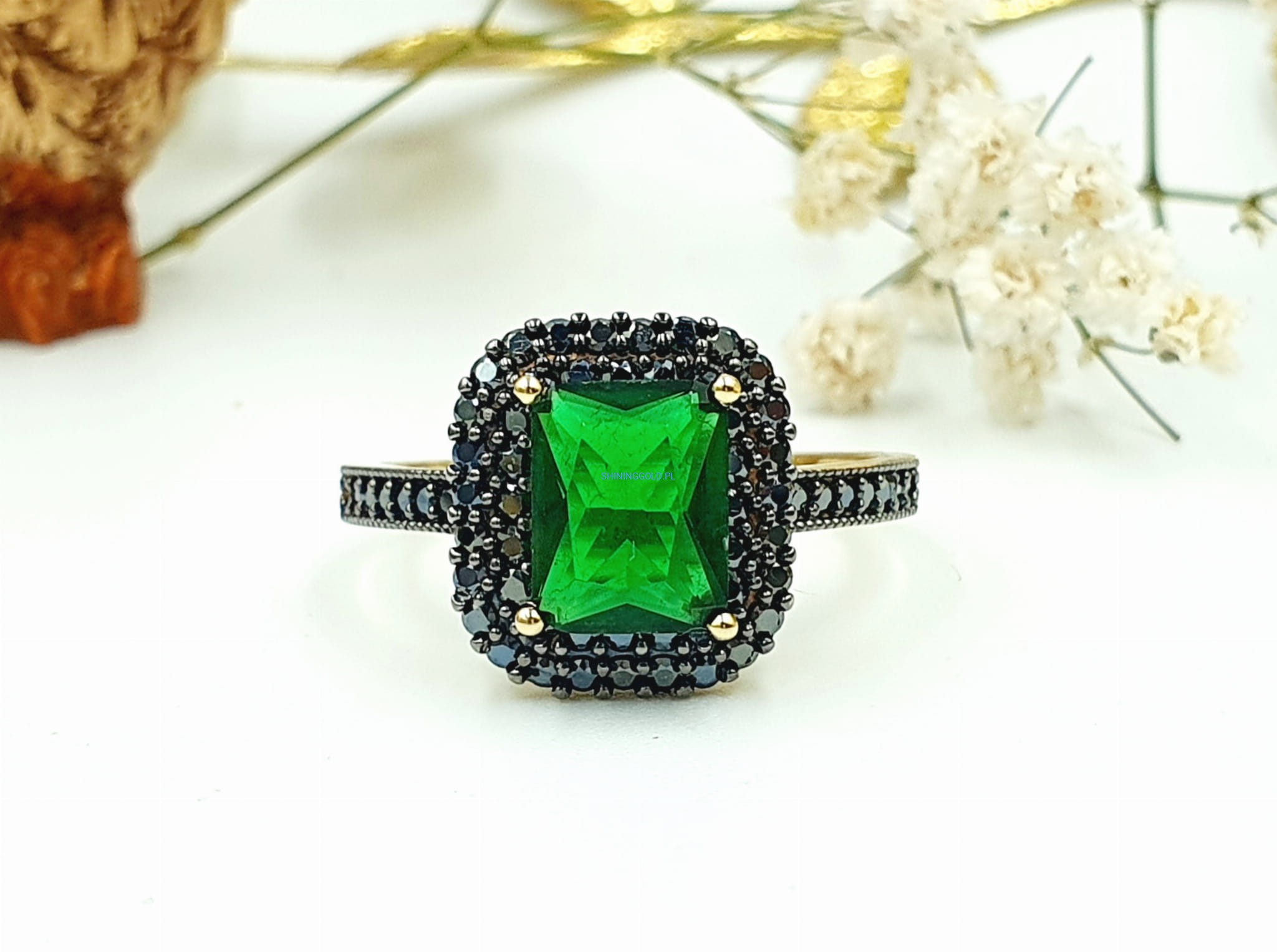 Złoty pierścionek z zielonym kamieniem syntetycznym i czarnymi cyrkoniami