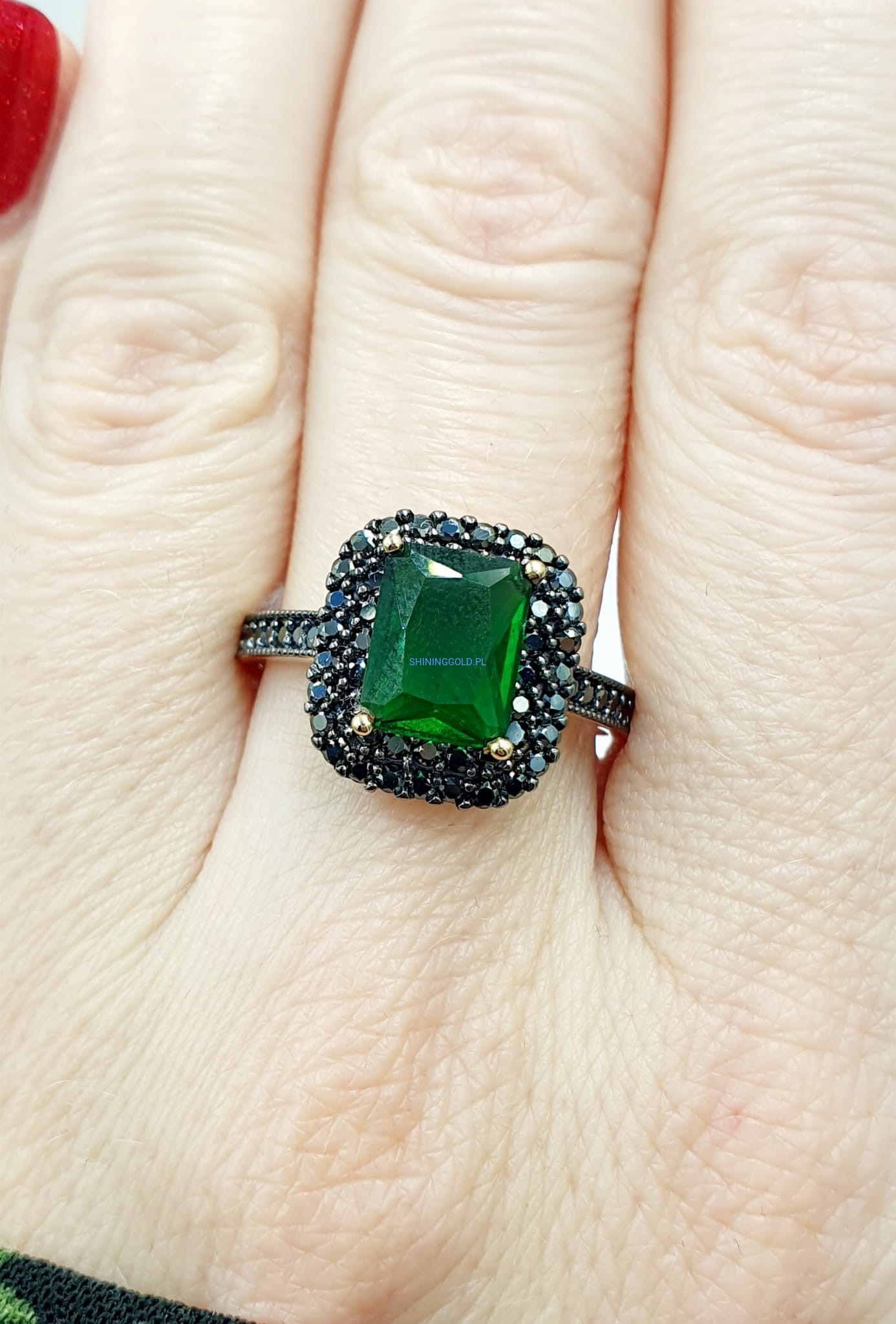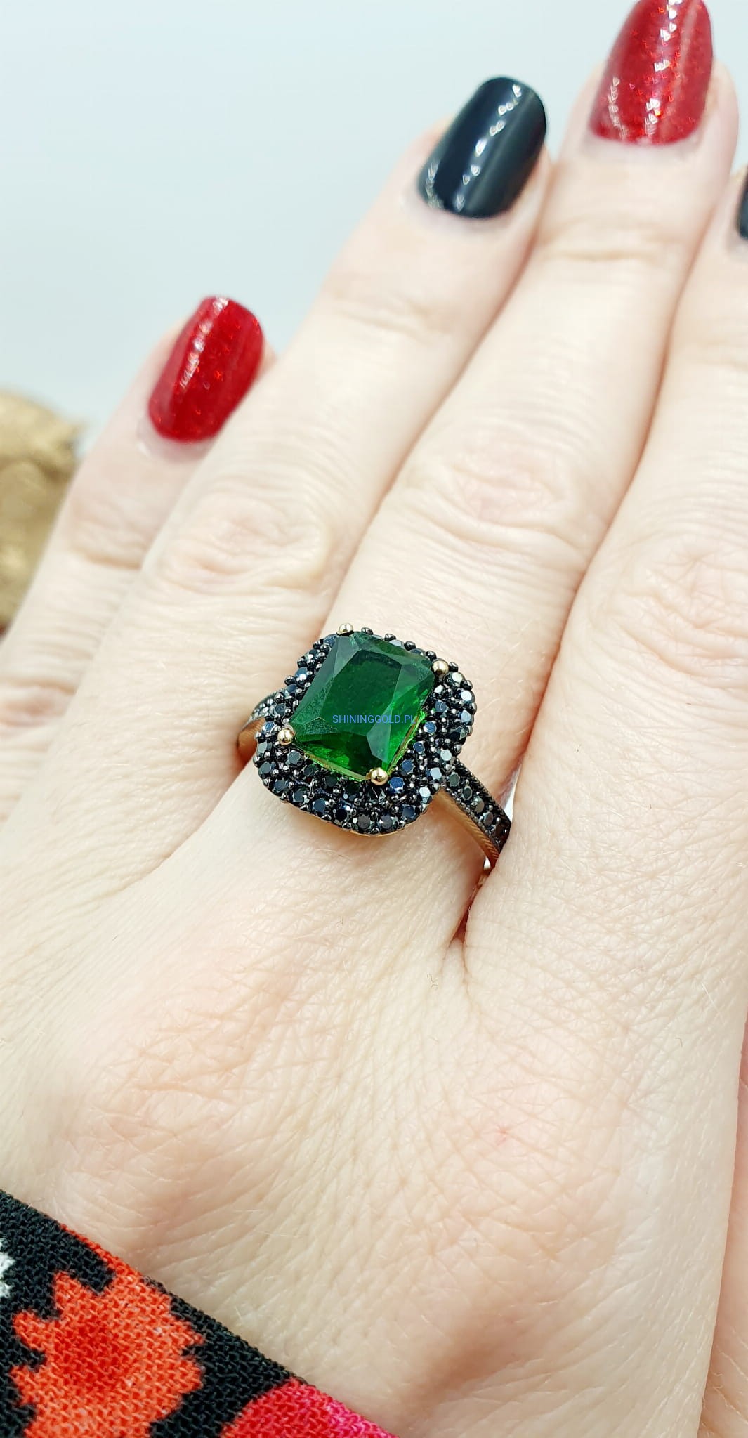 Złoty pierścionek z wyrazistym zielonym kamieniem syntetycznym, otoczonym subtelnymi czarnymi cyrkoniami. Elegancka kompozycja kolorów tworzy niezwykły efekt, który przyciąga spojrzenia i dodaje stylu każdej stylizacji.