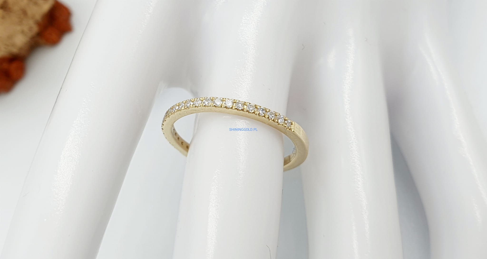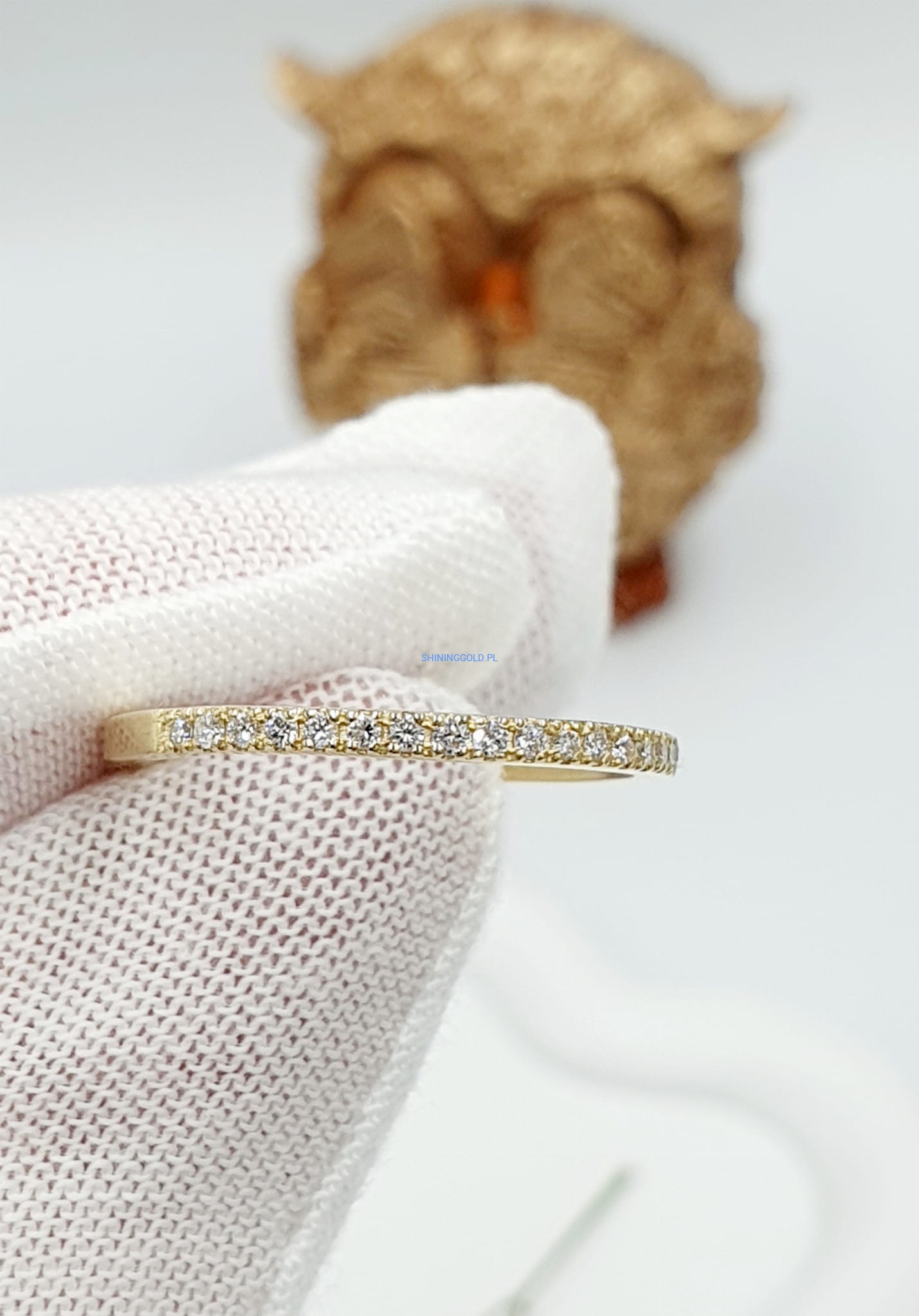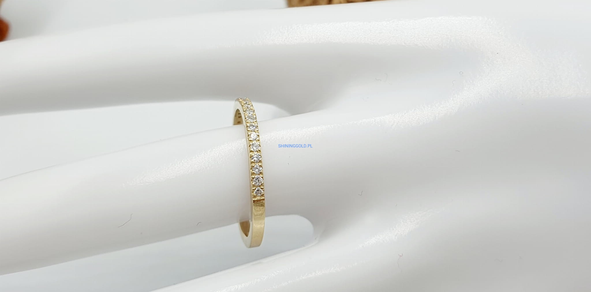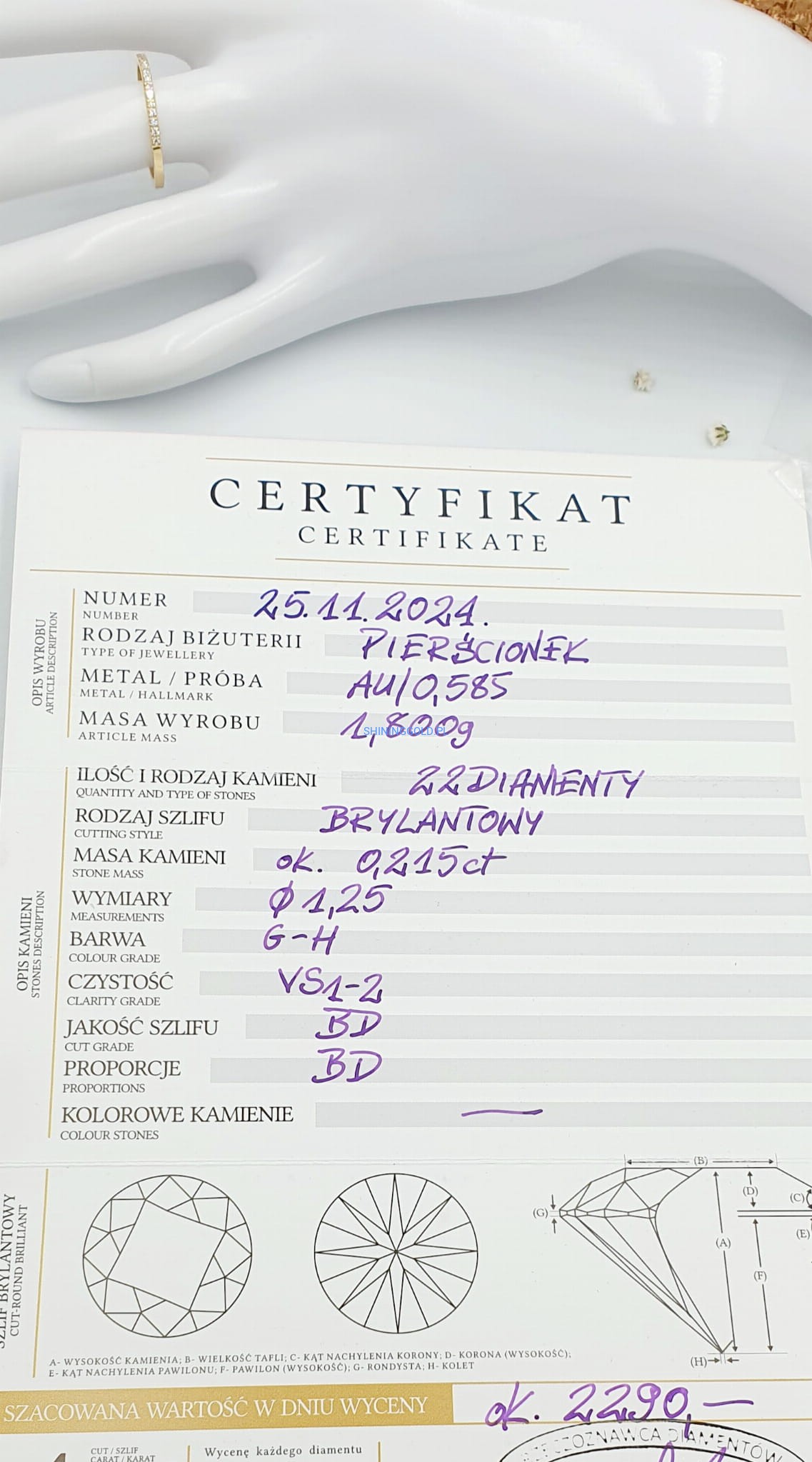 Ta elegancka złota obrączka to połączenie klasyki i luksusu. 22 diamenty o łącznej masie 0,215 ct dodają jej wyjątkowego blasku, a czystość VS1-2 oraz barwa G-H podkreślają najwyższą jakość. Idealna jako symbol miłości lub wyjątkowy prezent.
