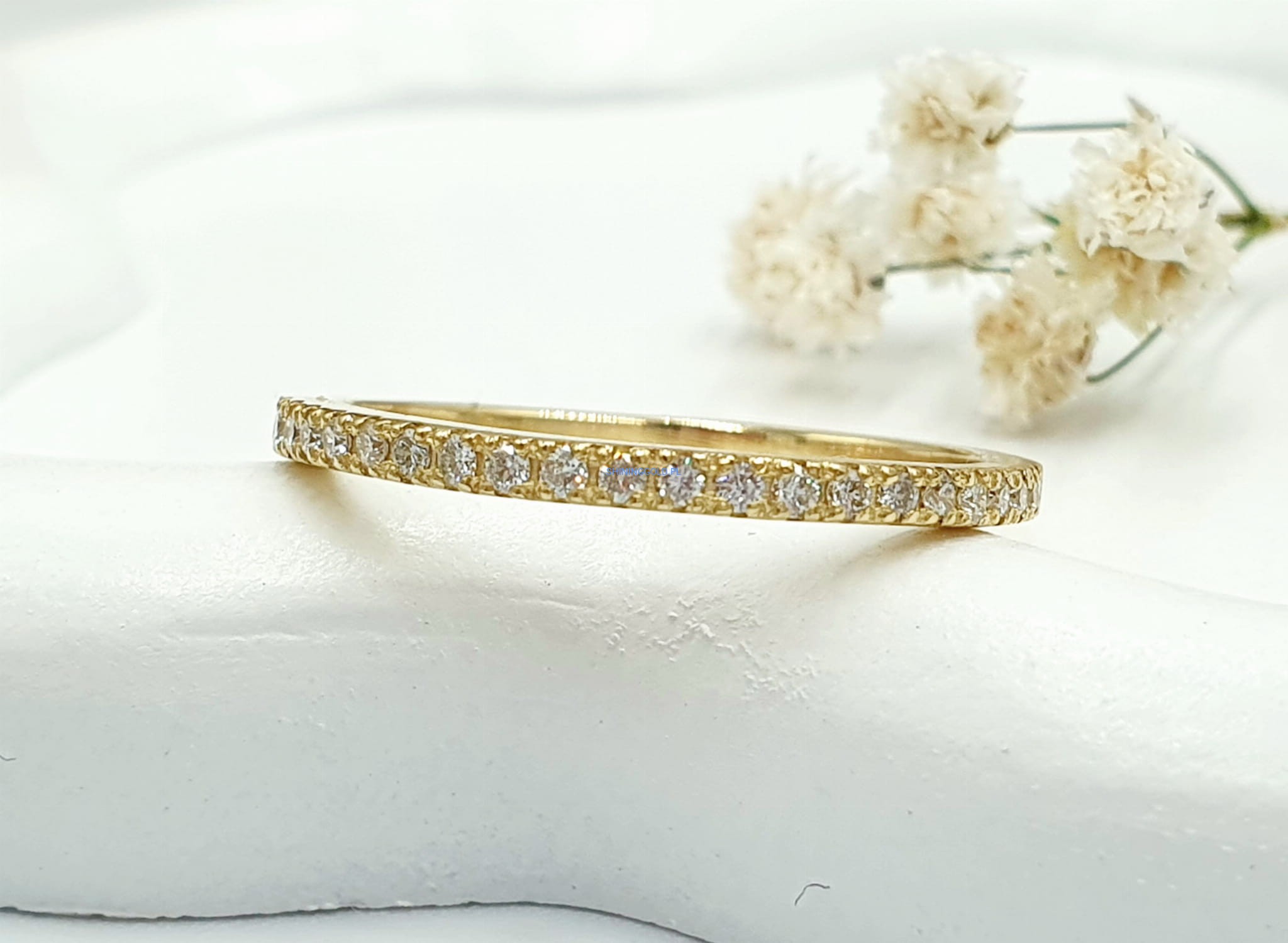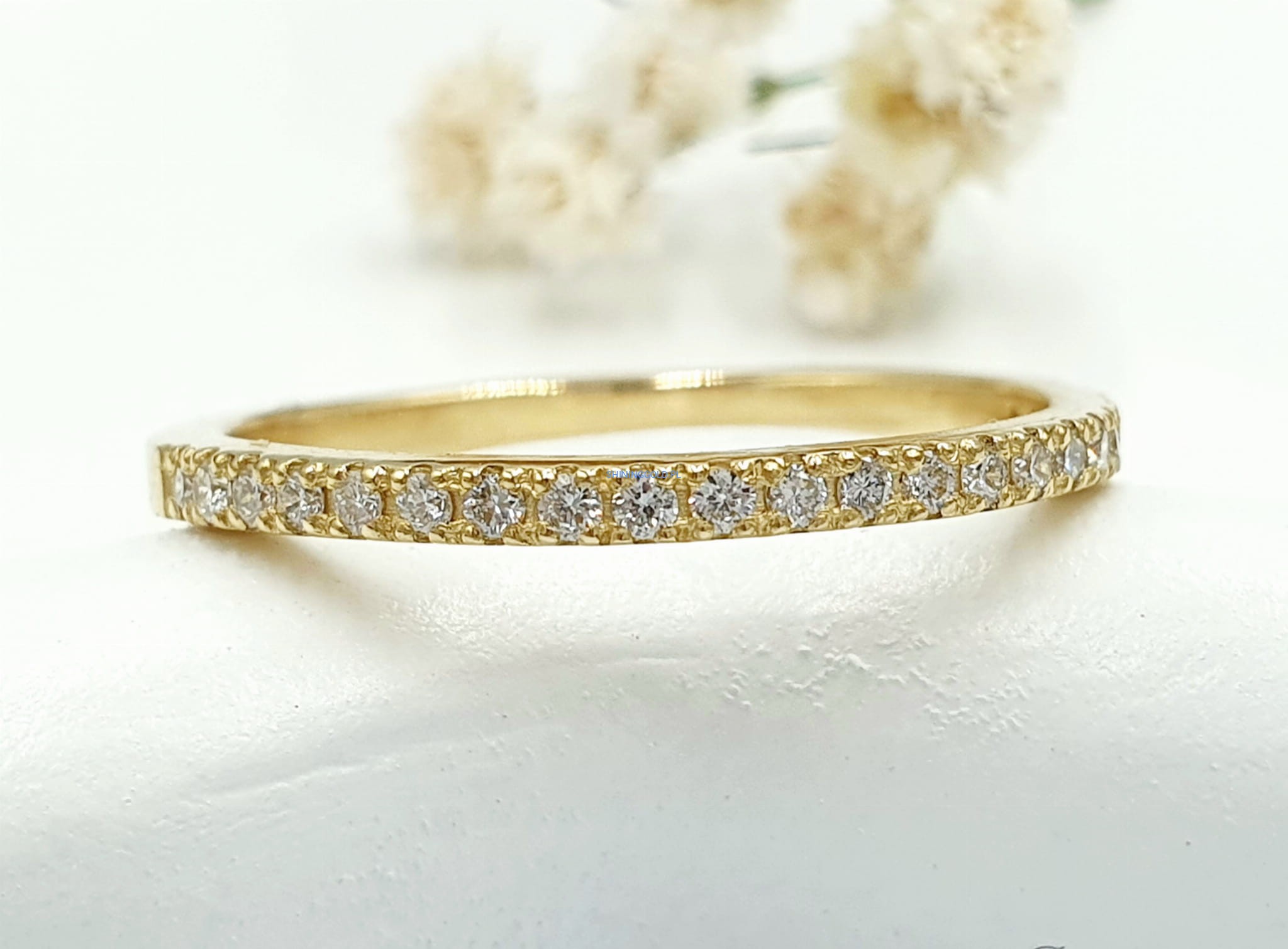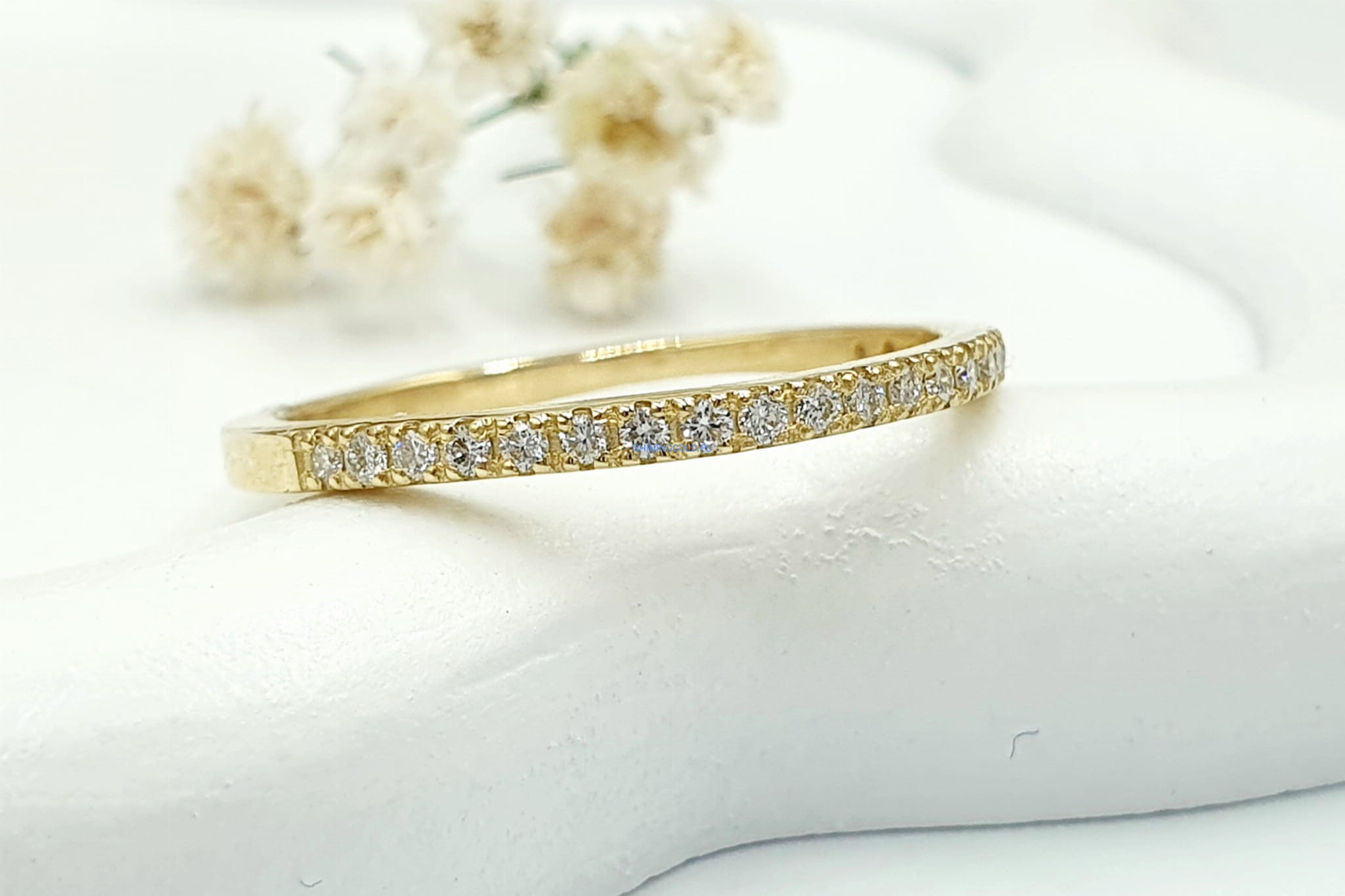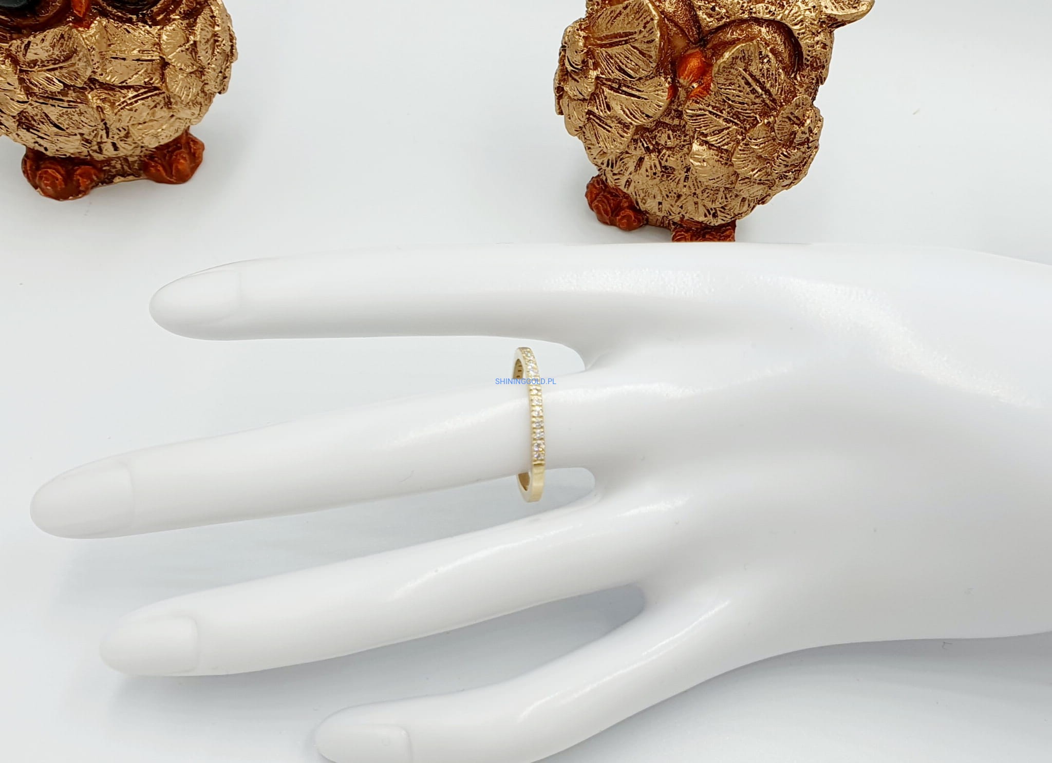 Ta elegancka złota obrączka to połączenie klasyki i luksusu. 22 diamenty o łącznej masie 0,215 ct dodają jej wyjątkowego blasku, a czystość VS1-2 oraz barwa G-H podkreślają najwyższą jakość. Idealna jako symbol miłości lub wyjątkowy prezent.