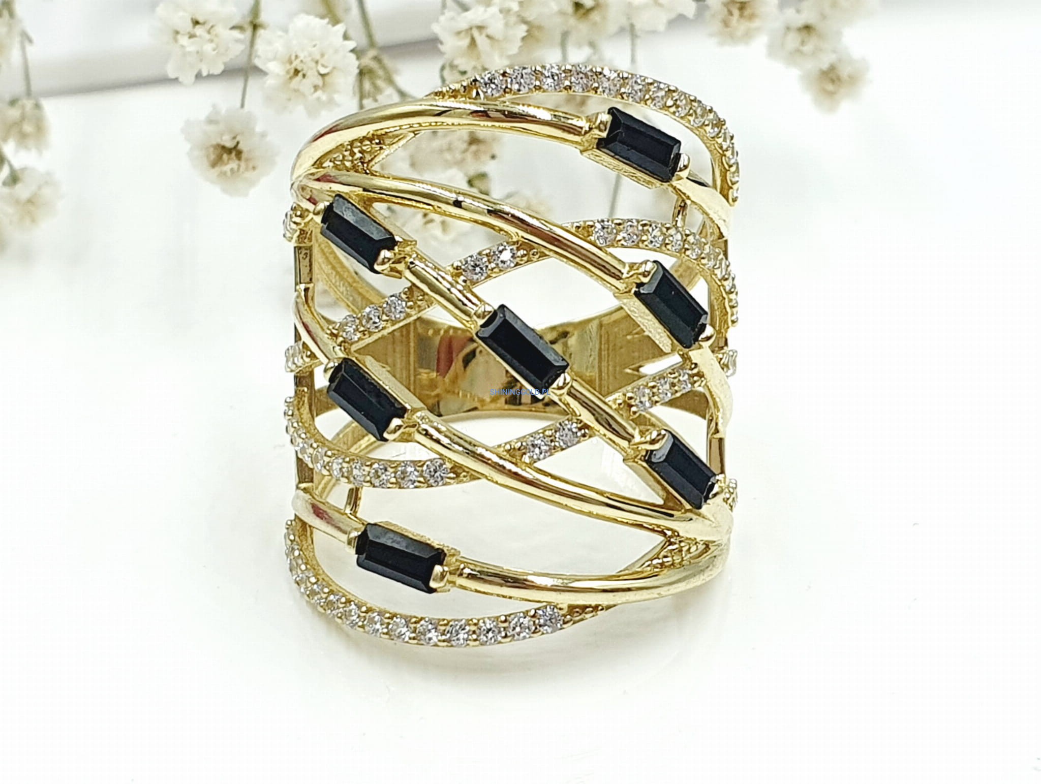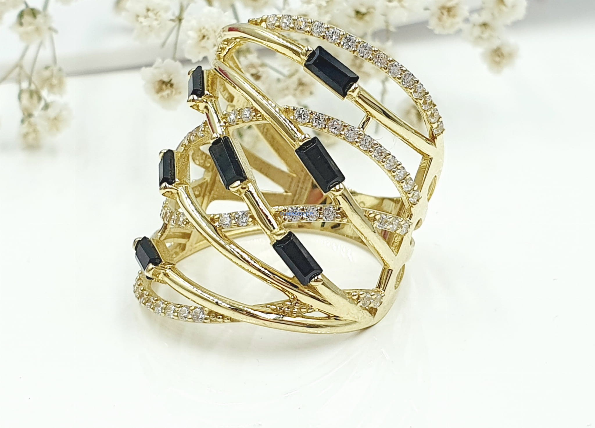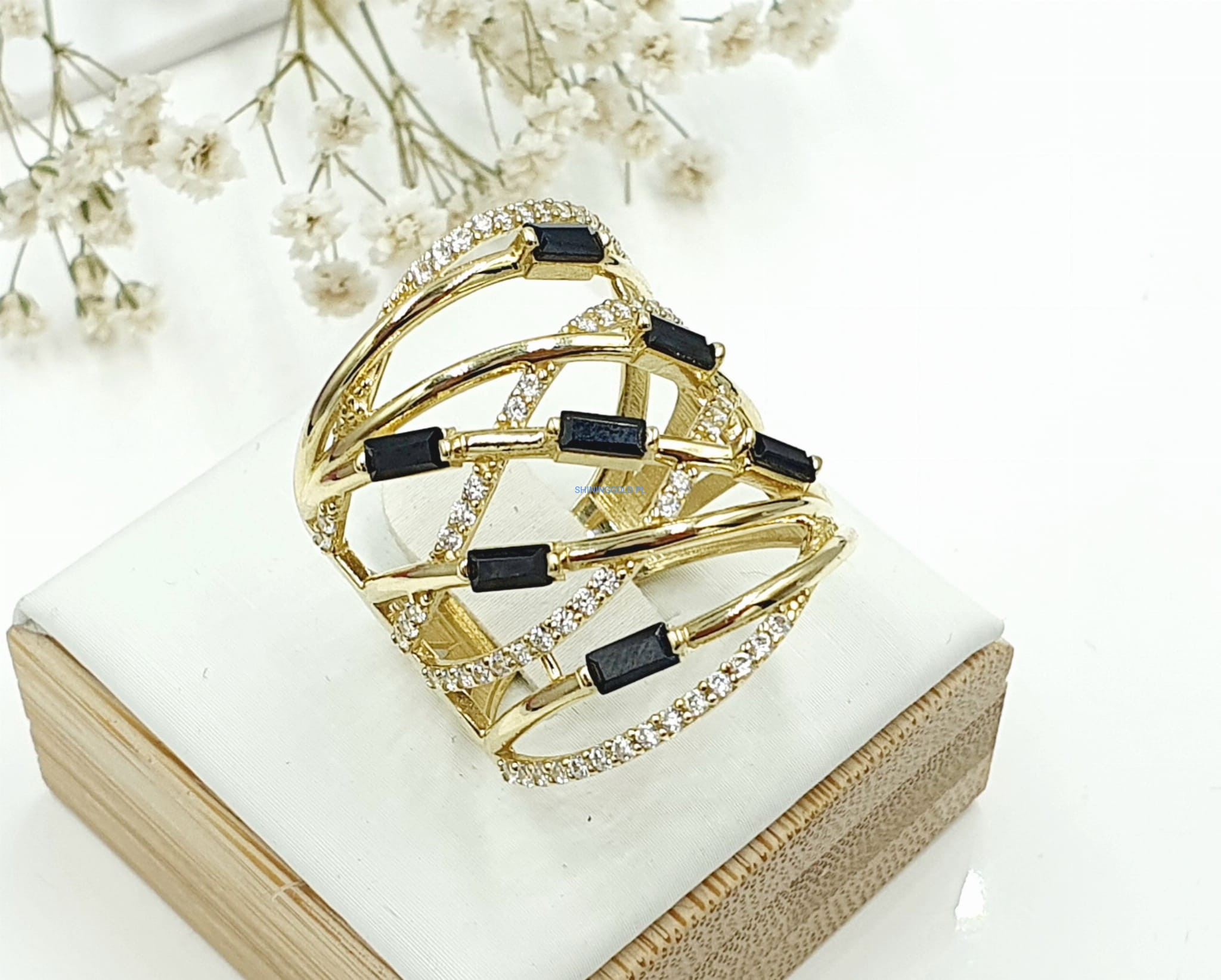 - Czarne onyksy: Kamienie te dodają pierścionkowi wyrafinowanego, eleganckiego stylu.