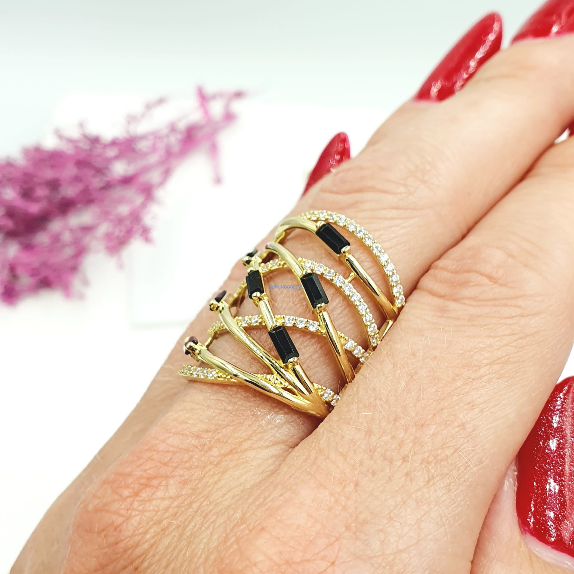 Elegancki złoty pierścionek ozdobiony czarnymi onyksami to perfekcyjny wybór dla miłośników klasyki z nutą tajemniczości. Onyksy, symbol siły i ochrony, harmonijnie komponują się z ciepłym odcieniem złota próby 585, tworząc biżuterię o ponadczasowym charakterze.