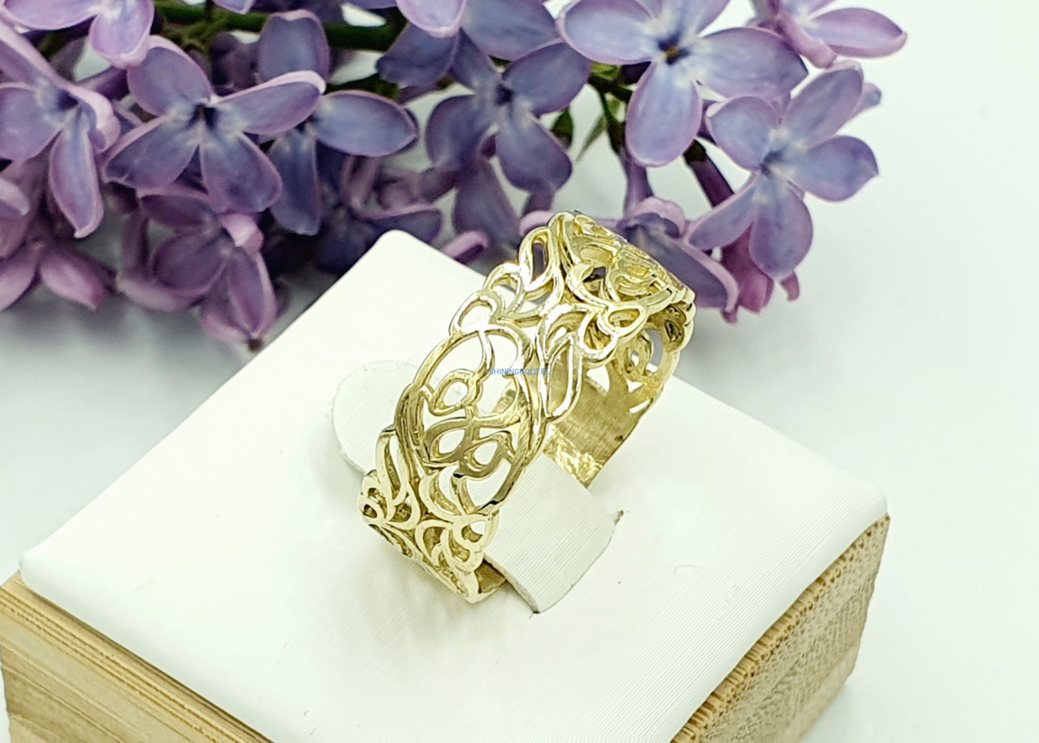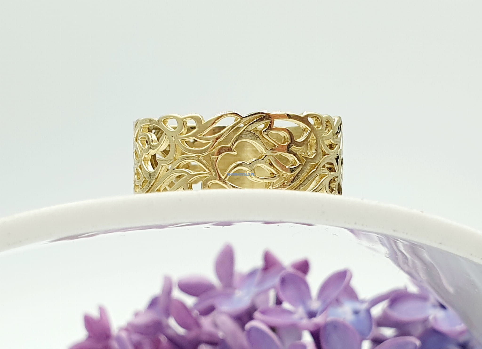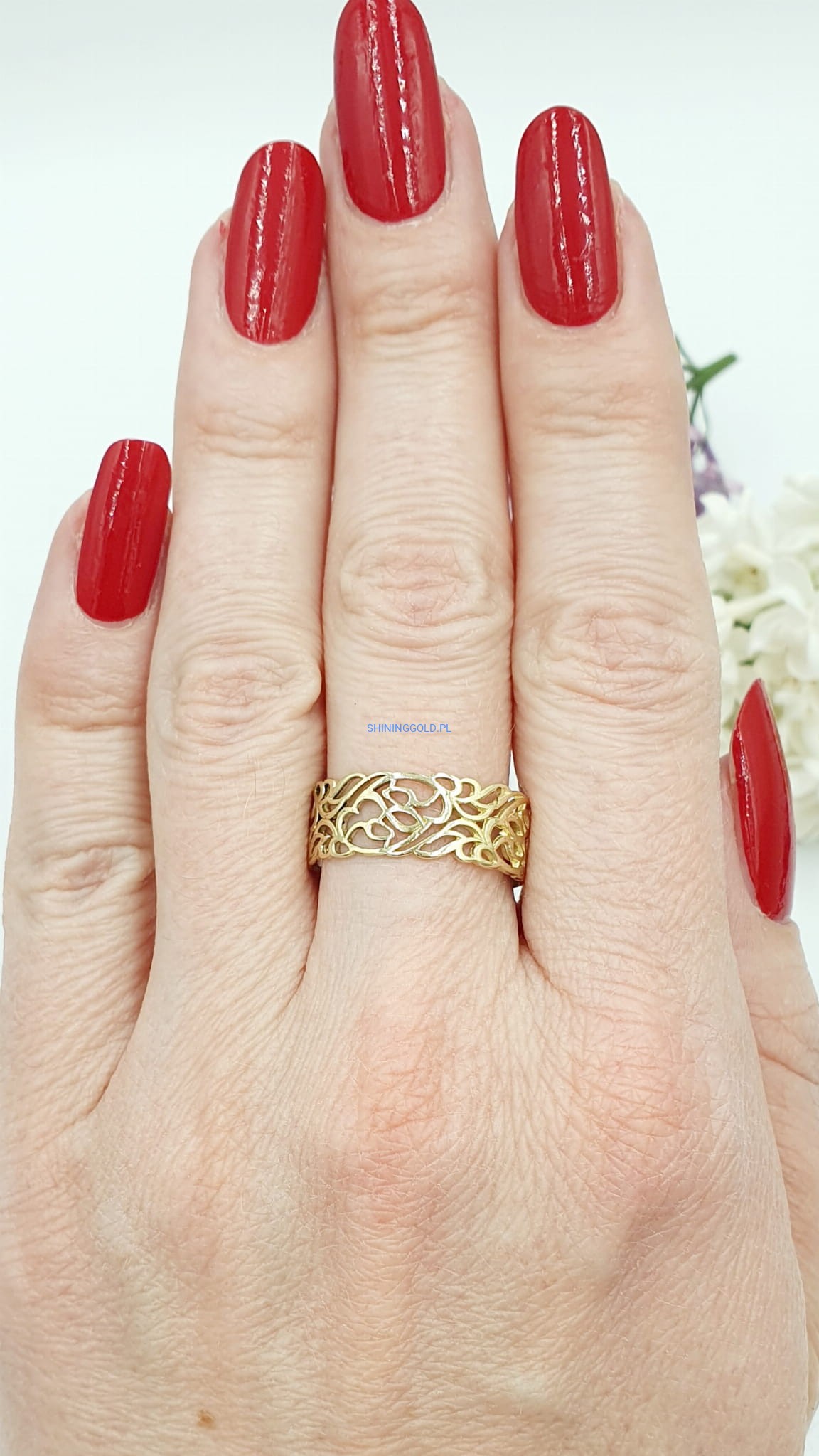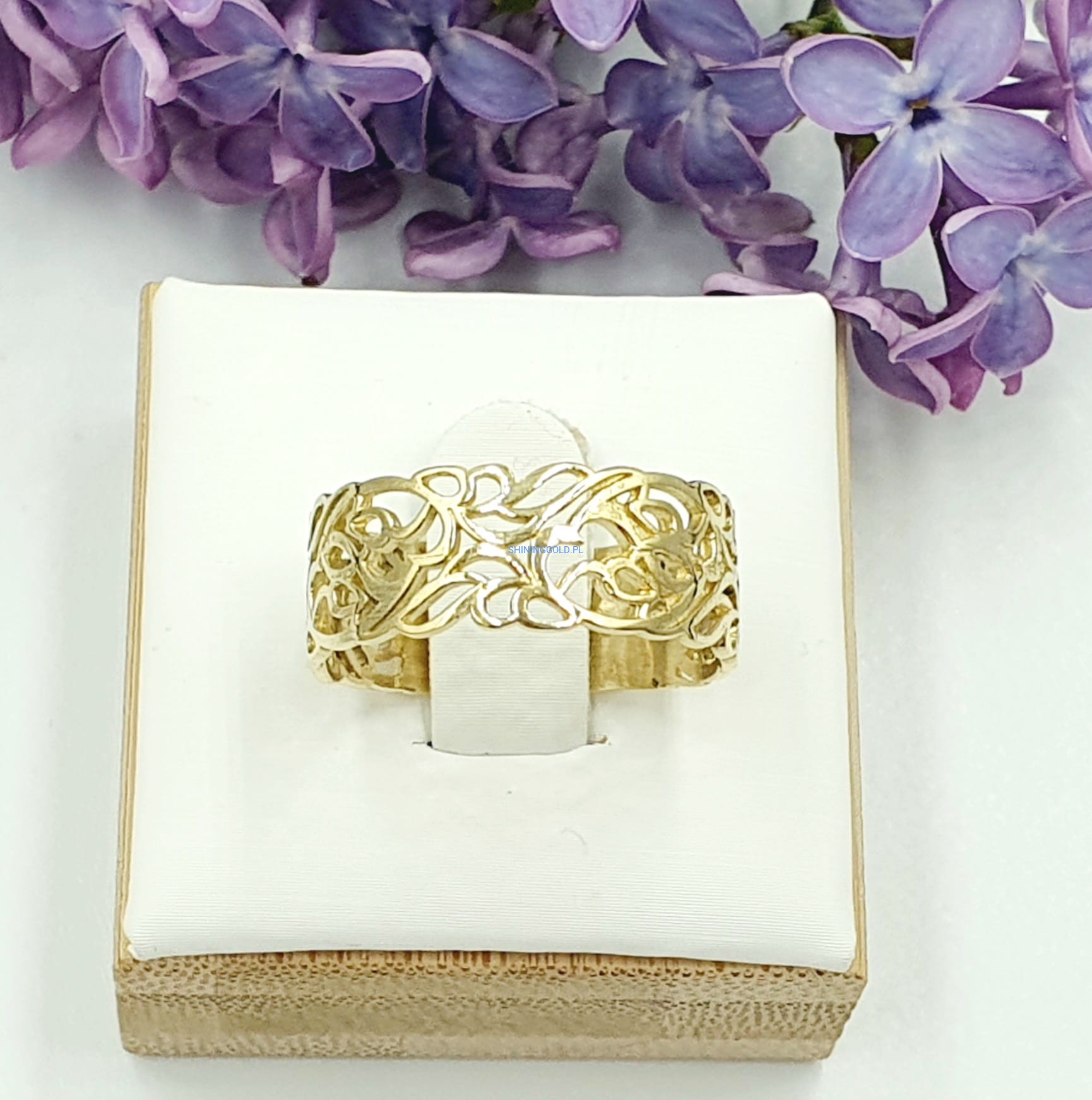 Wyjątkowy Dodatek dla Stylowych Osób: Złoty ażurowy pierścionek to wybór dla osób poszukujących niezwykłej biżuterii, która podkreśli ich wyjątkowy gust i styl.