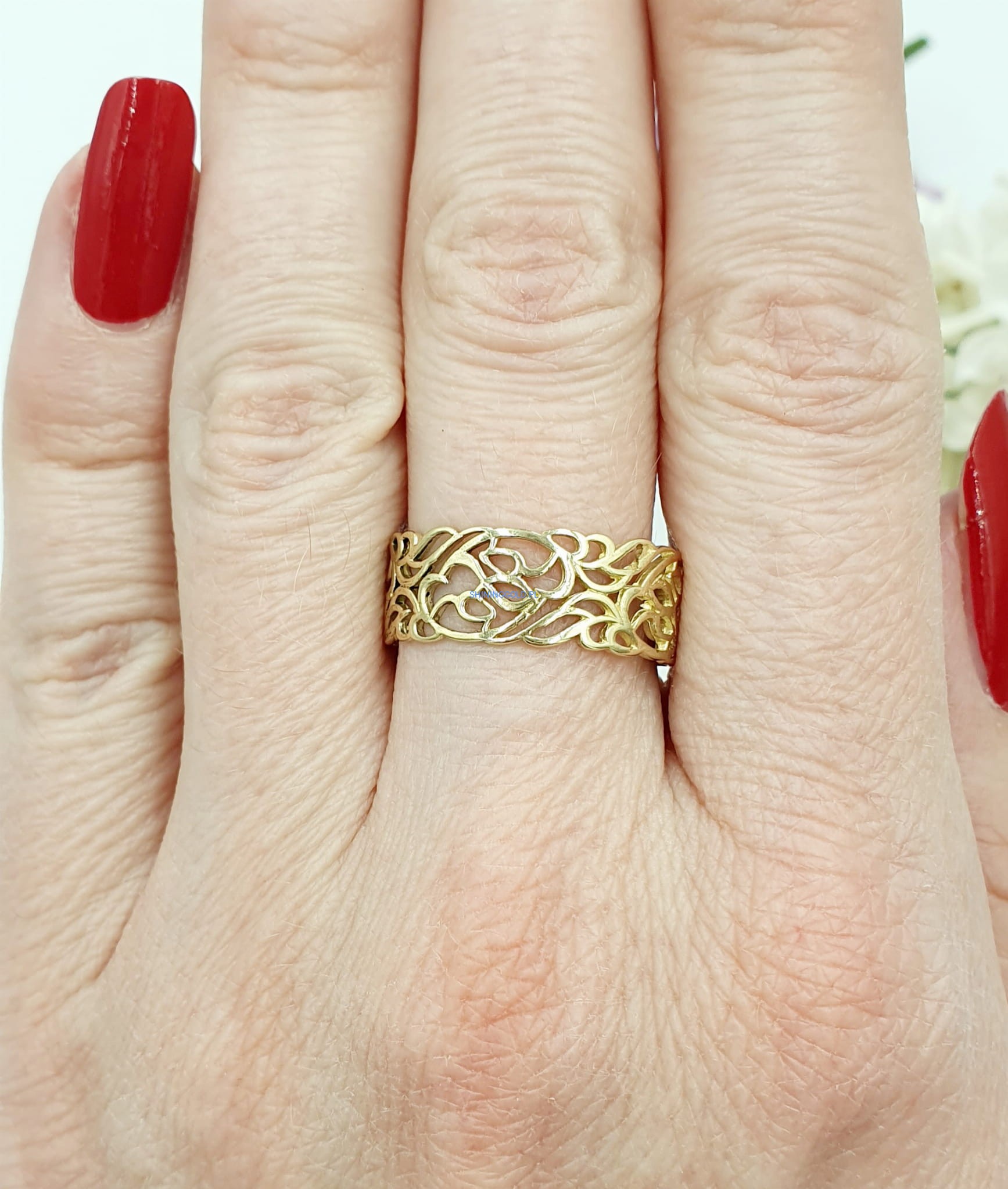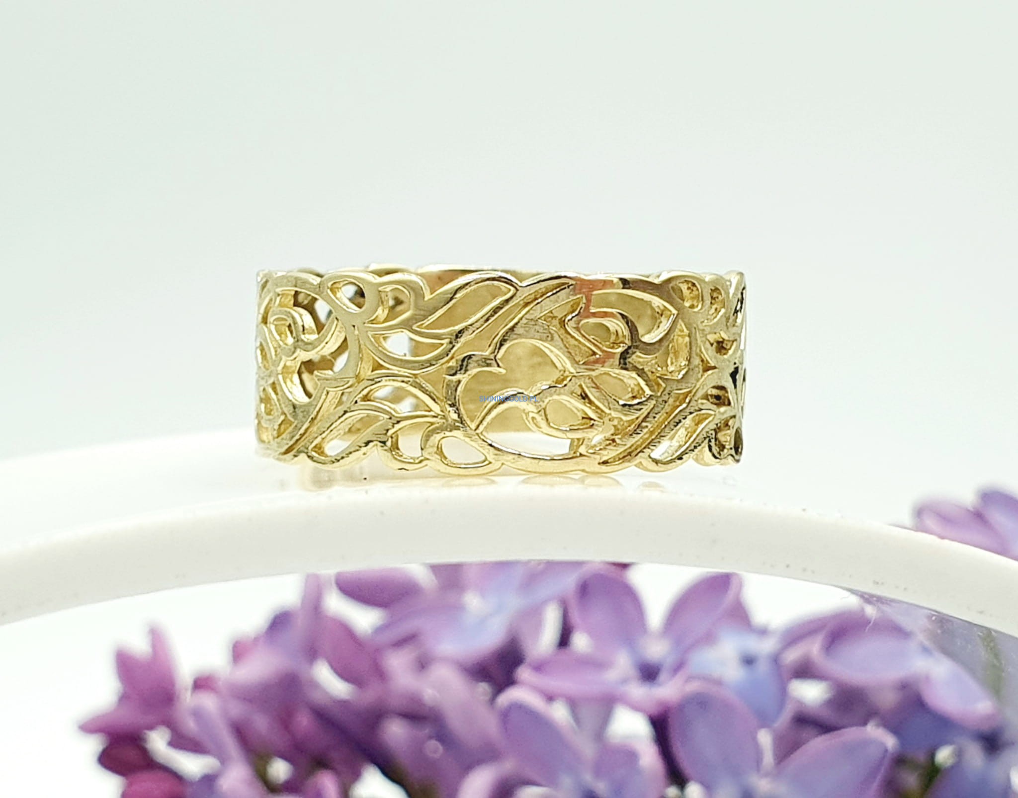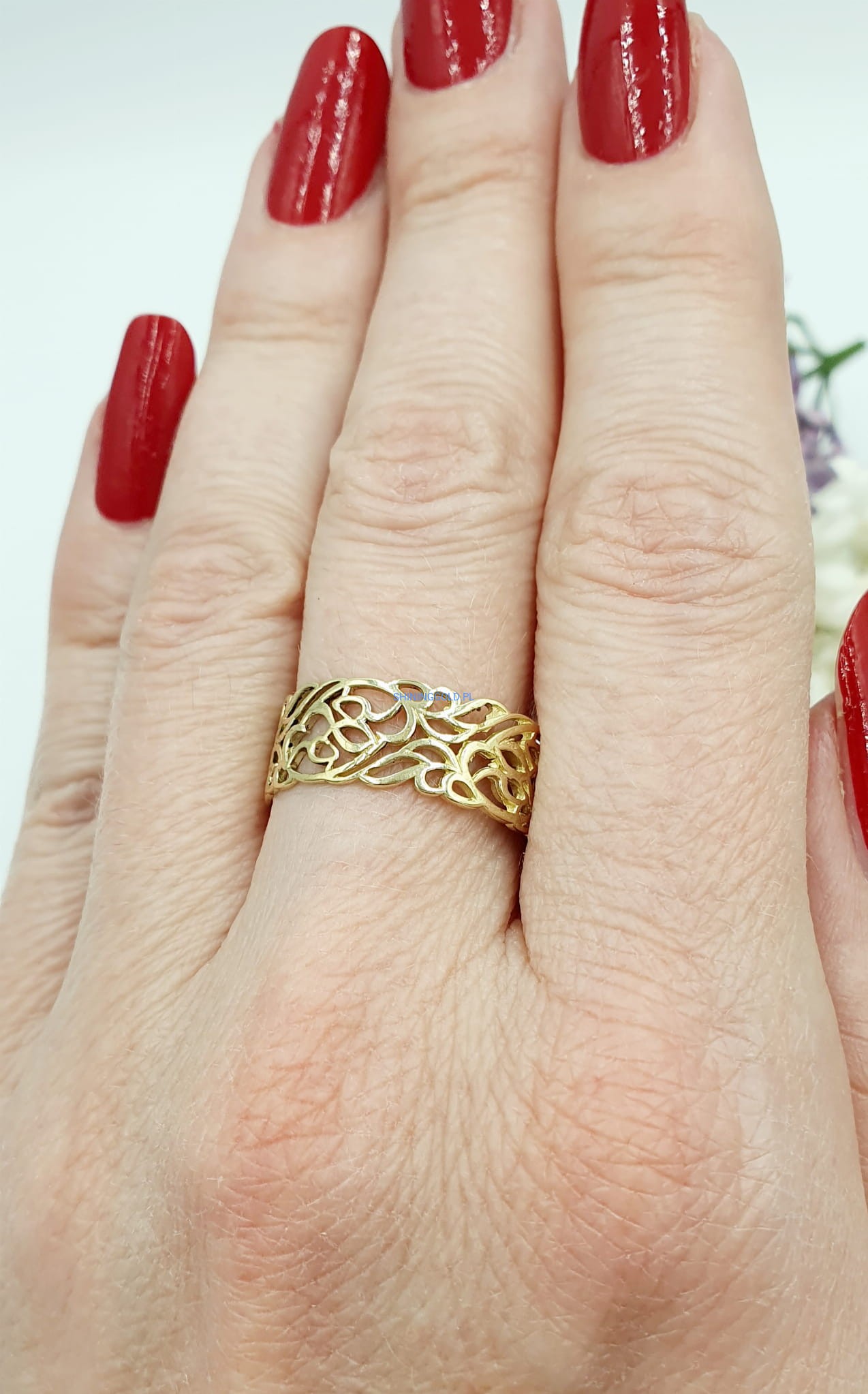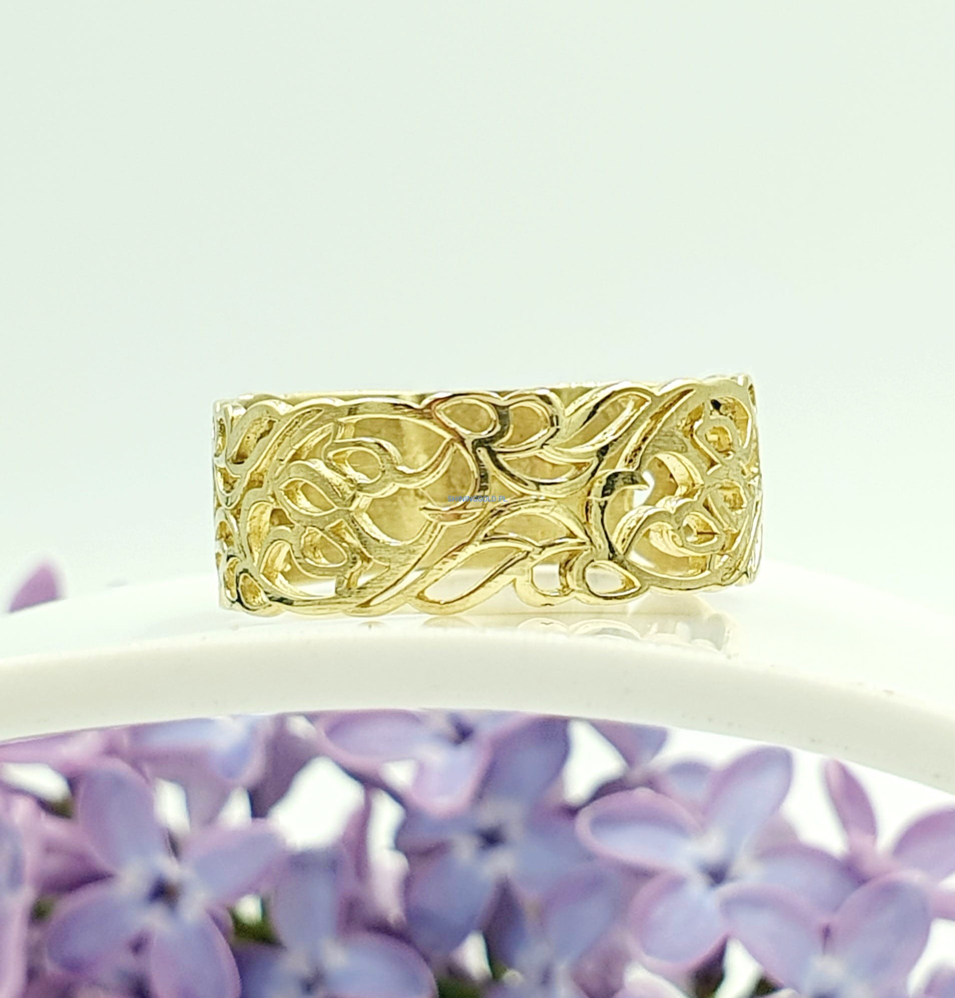 Wyjątkowy Dodatek dla Stylowych Osób: Złoty ażurowy pierścionek to wybór dla osób poszukujących niezwykłej biżuterii, która podkreśli ich wyjątkowy gust i styl.