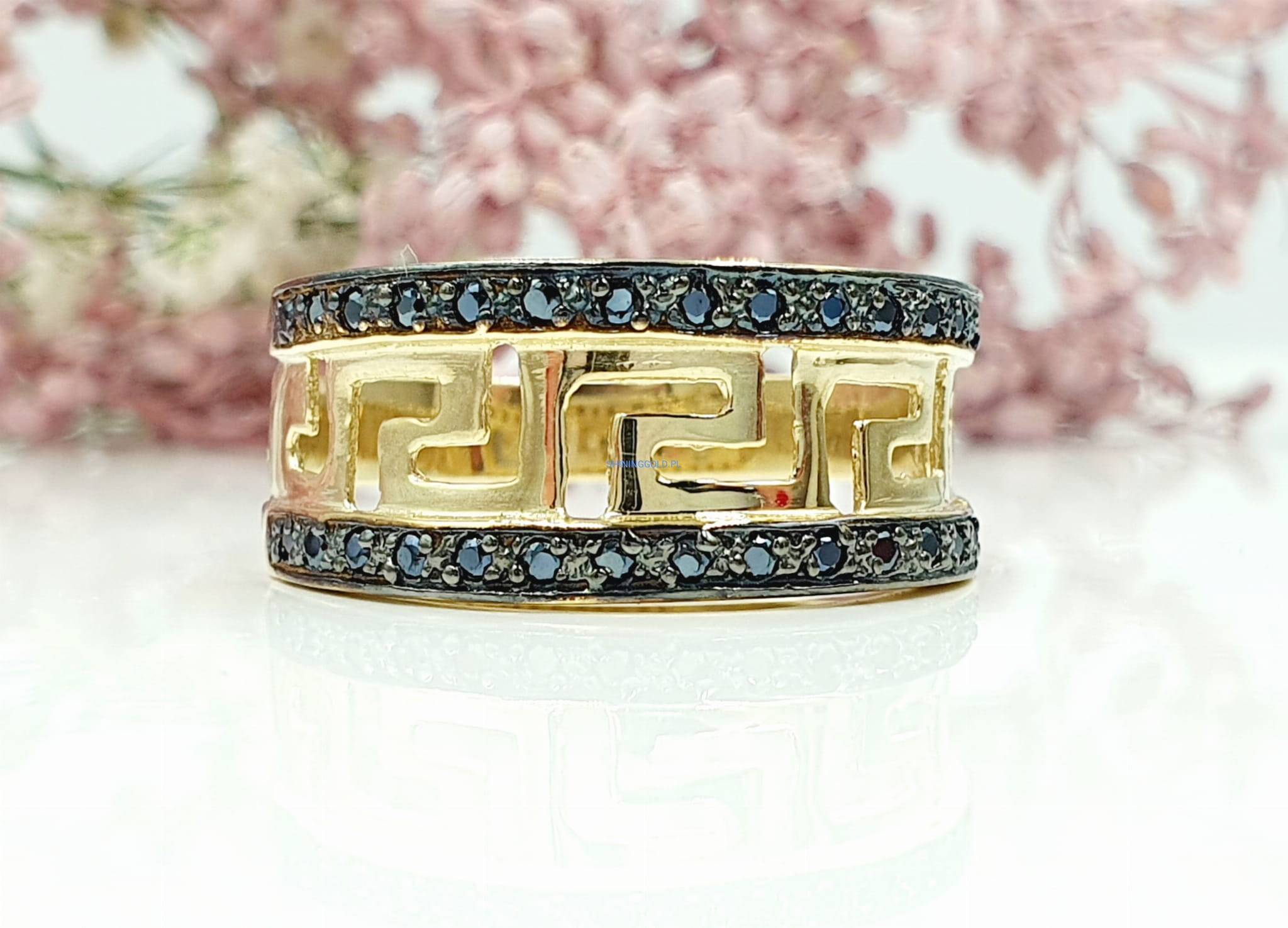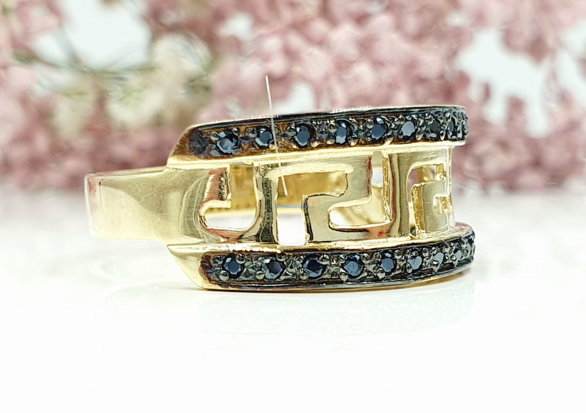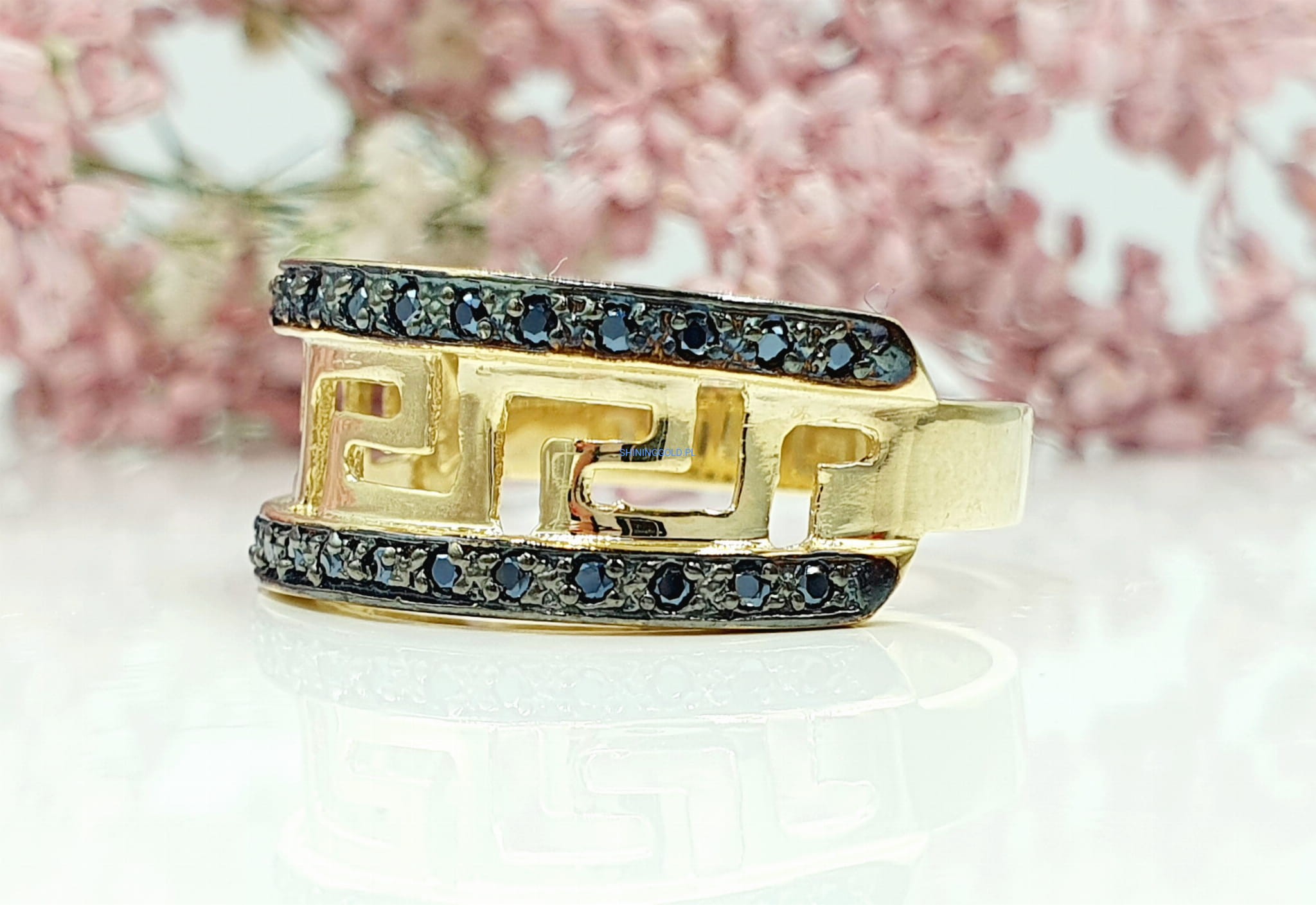 Piękny pierścionek z czarnymi cyrkoniami - Wzór grecki
