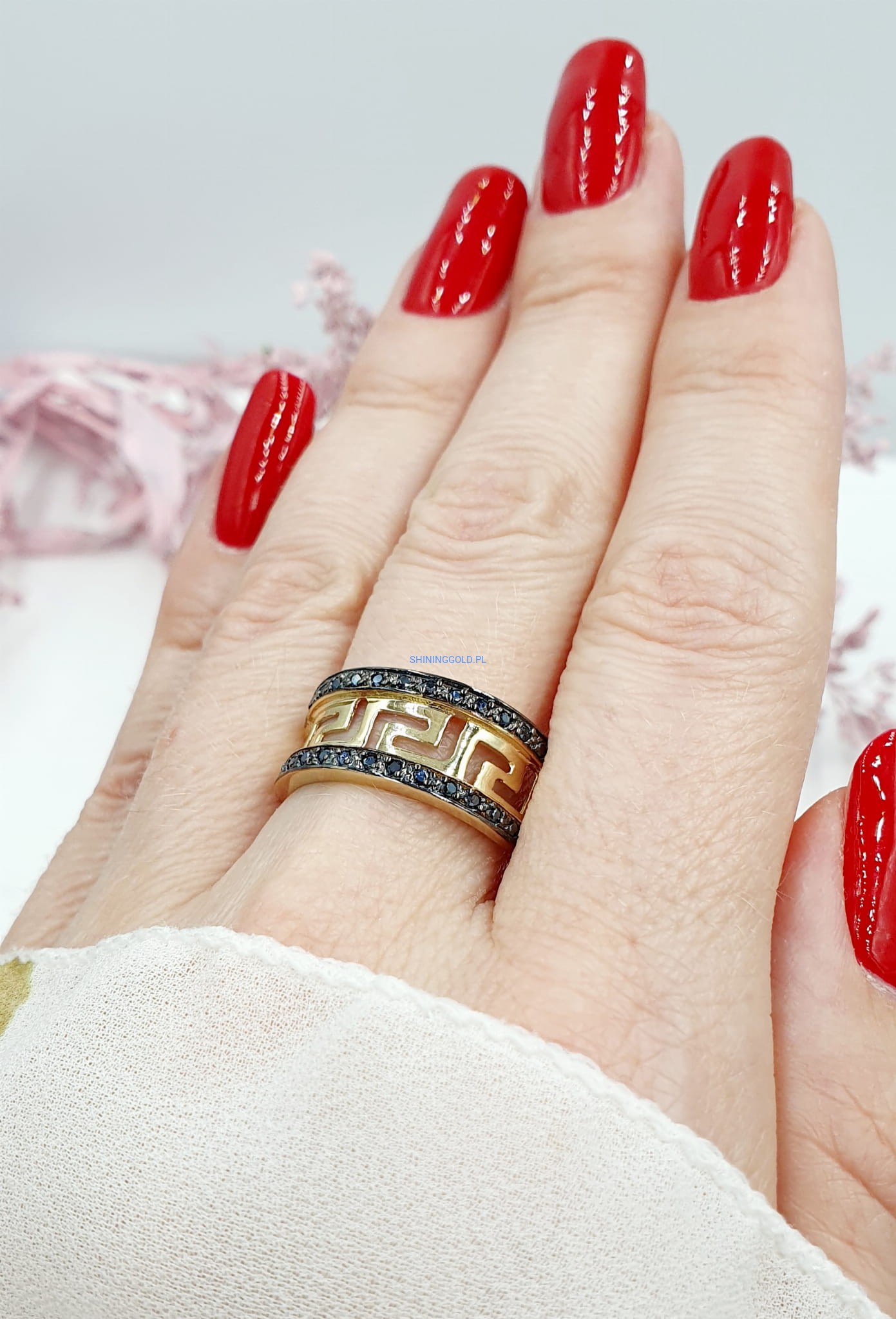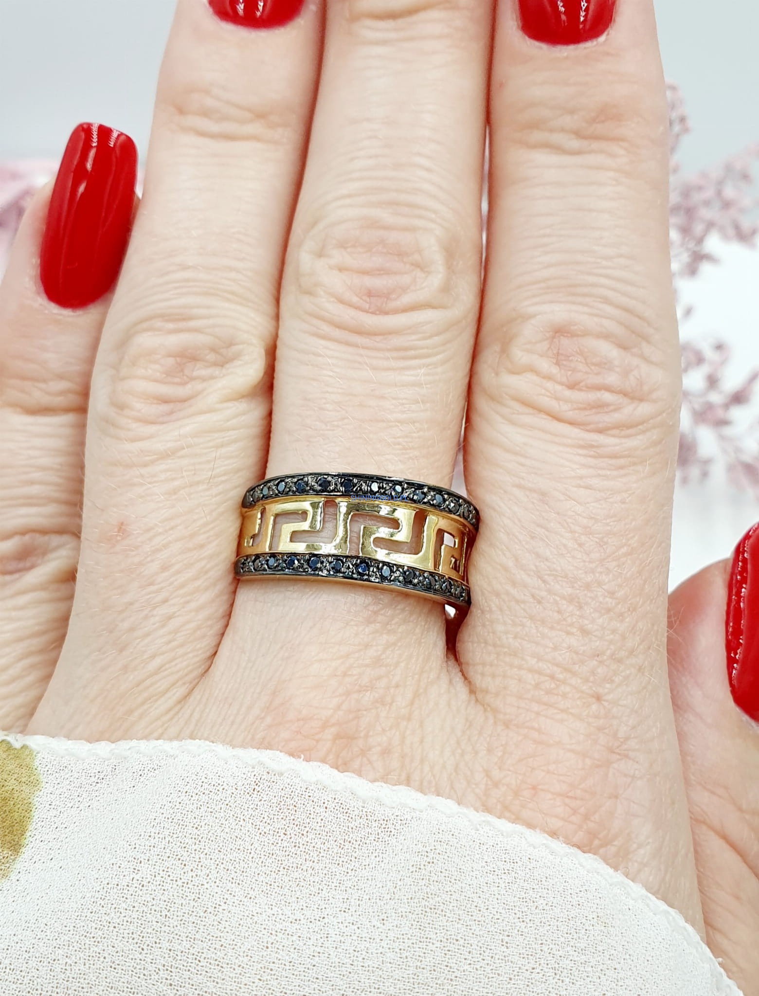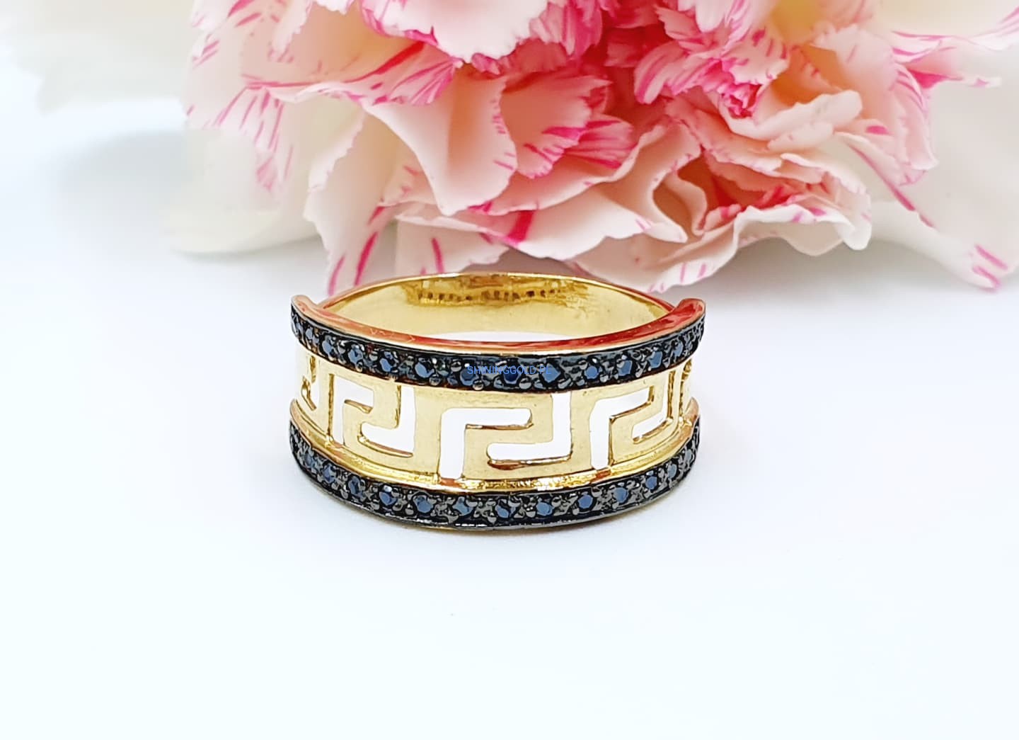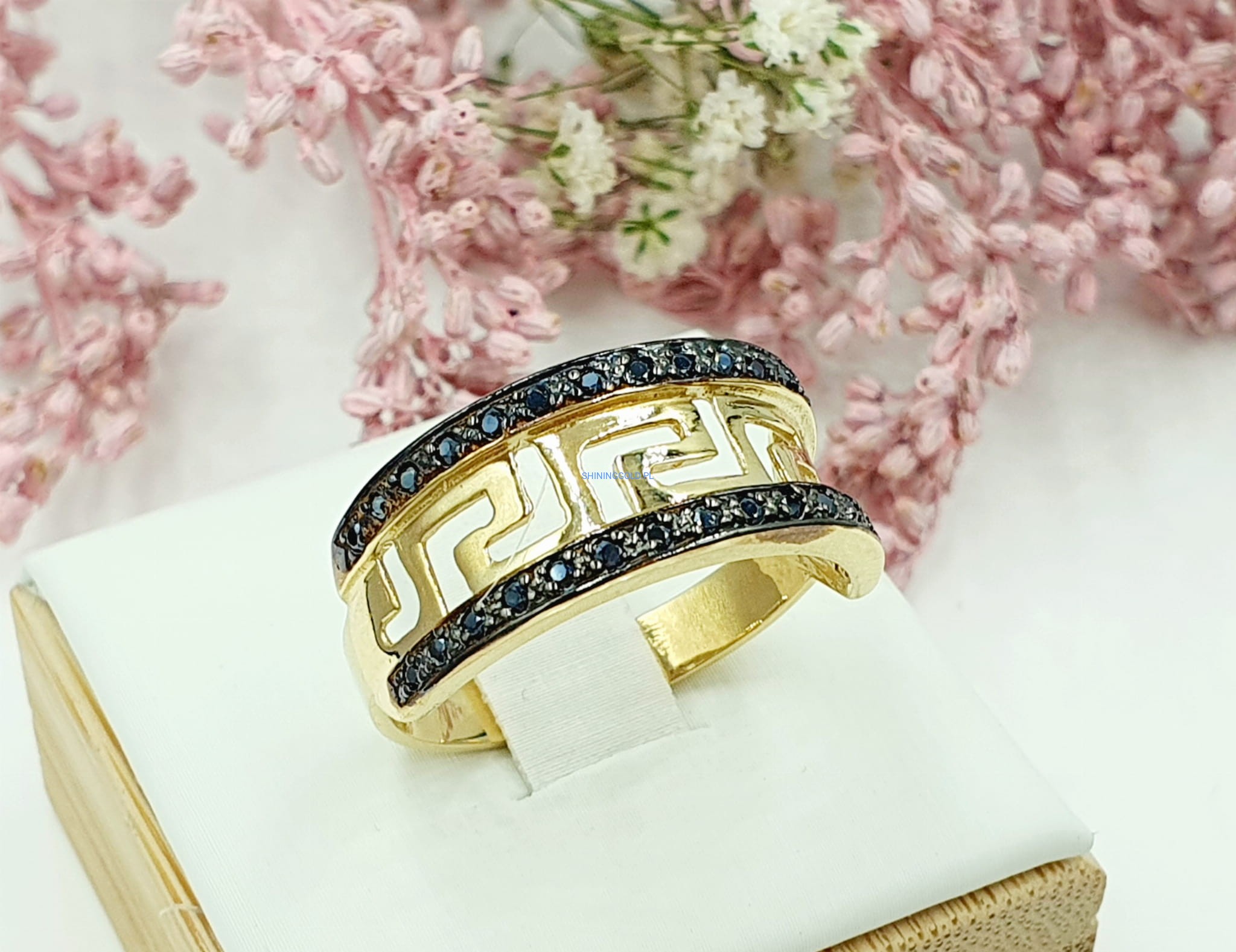 Piękny pierścionek z czarnymi cyrkoniami - Wzór grecki
