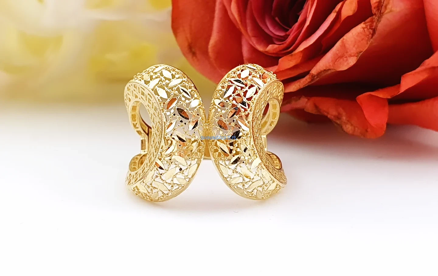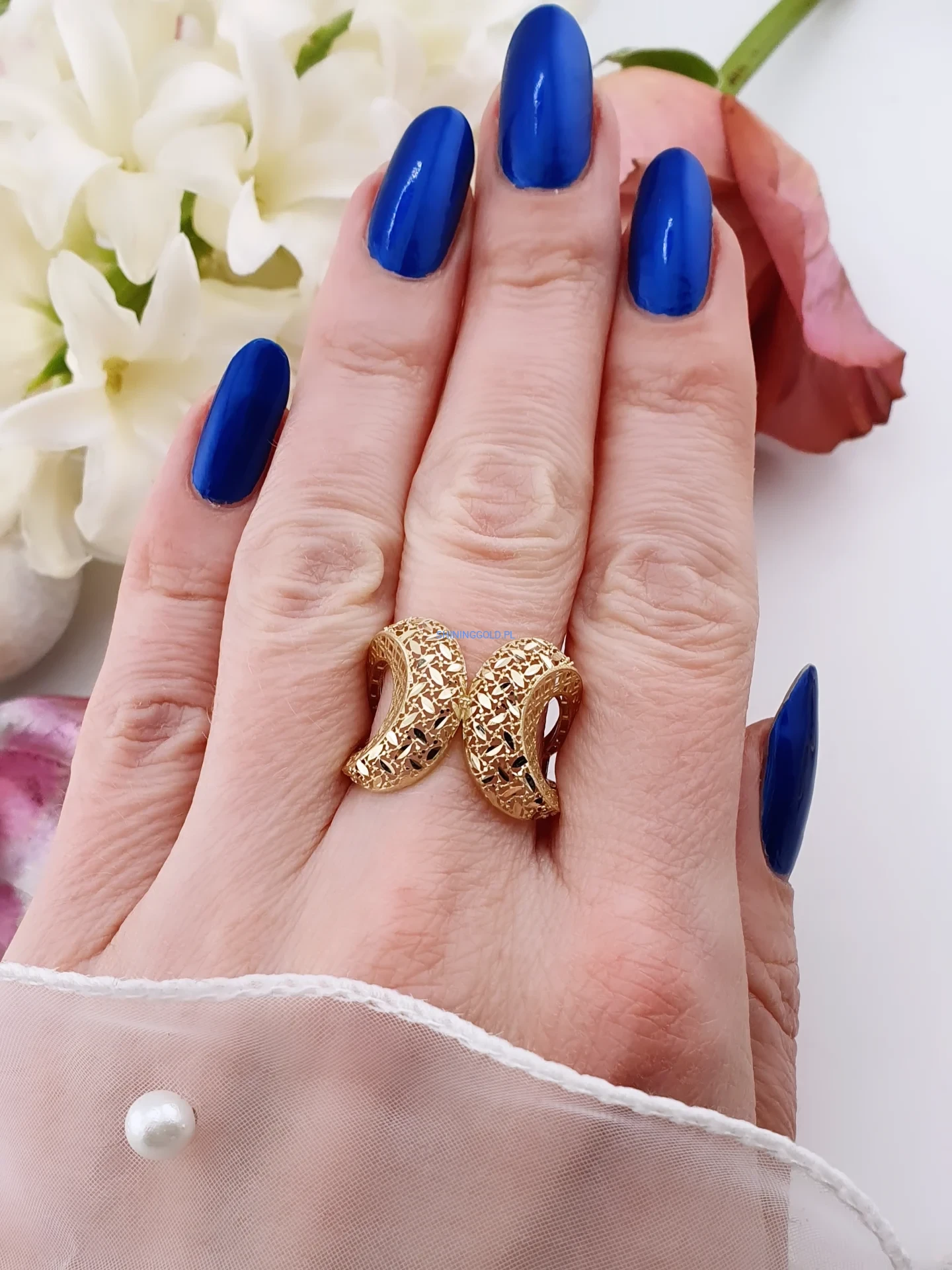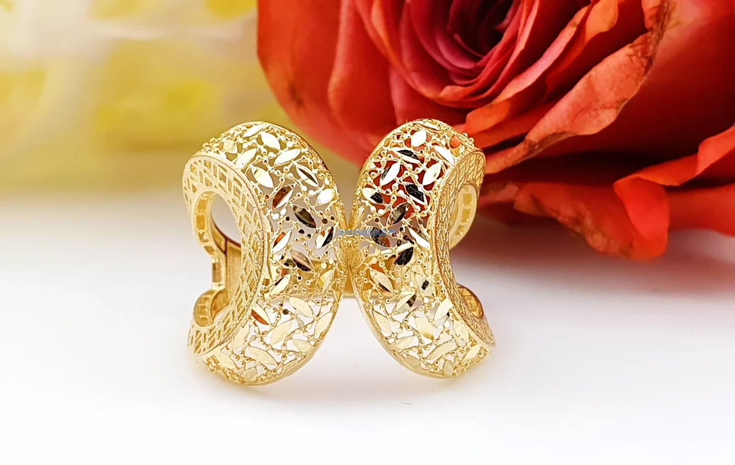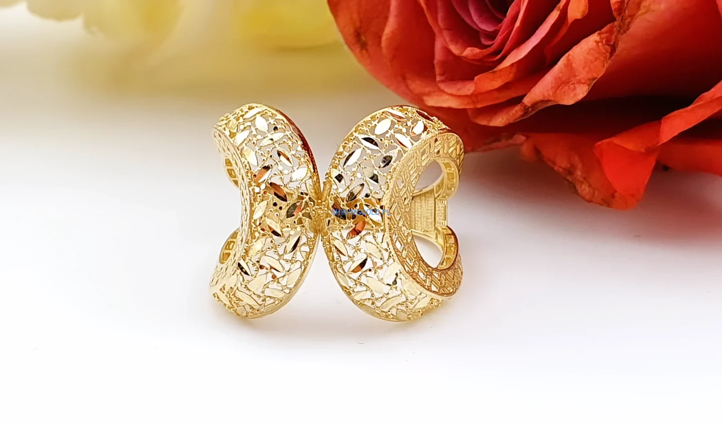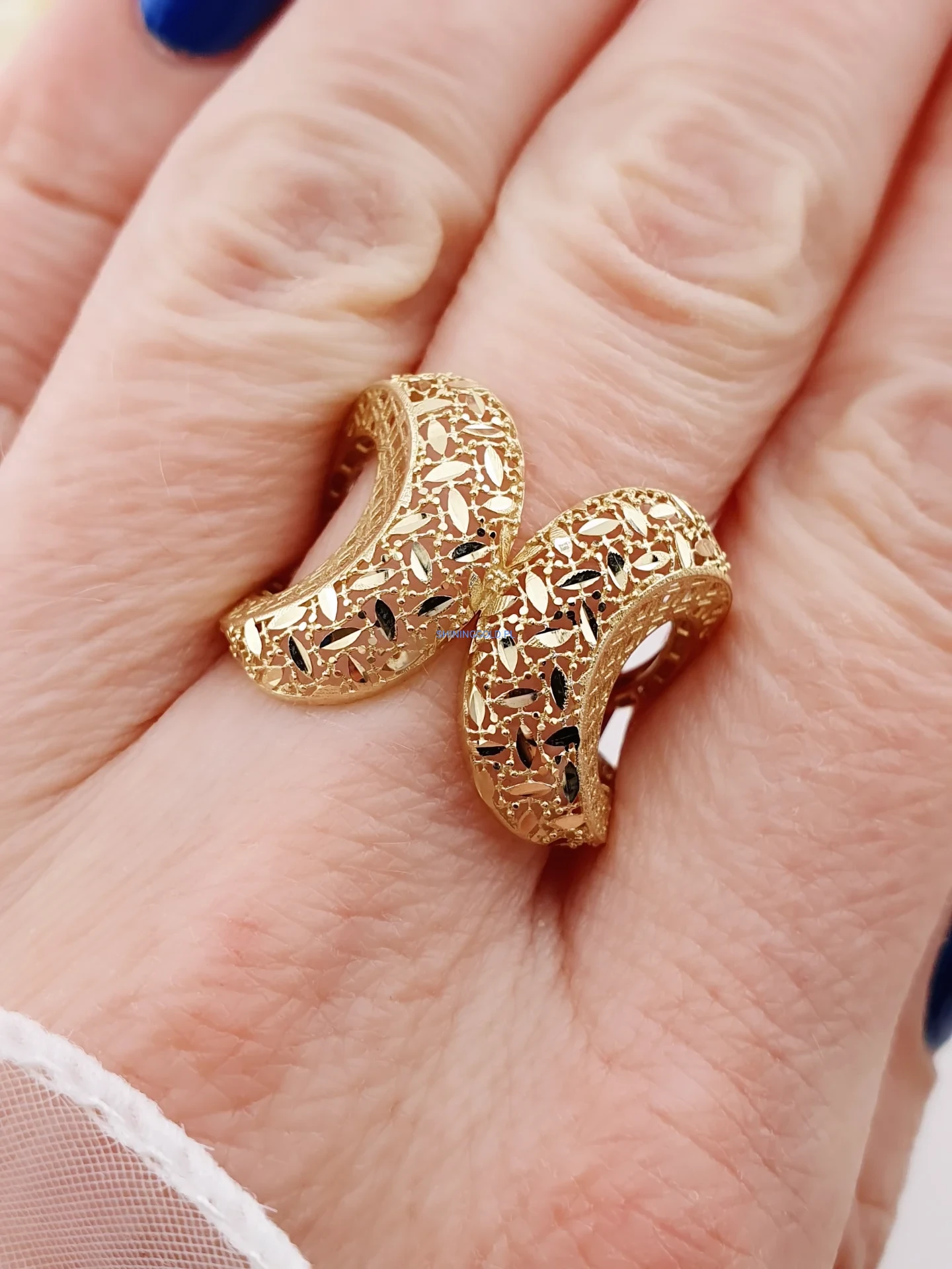 Uroczy pierścionek wykonany ze złota próby 585, o lekkiej, ażurowej formie przypominającej kokardkę. Delikatne zdobienia i finezyjna struktura sprawiają, że pięknie odbija światło i przyciąga spojrzenia.