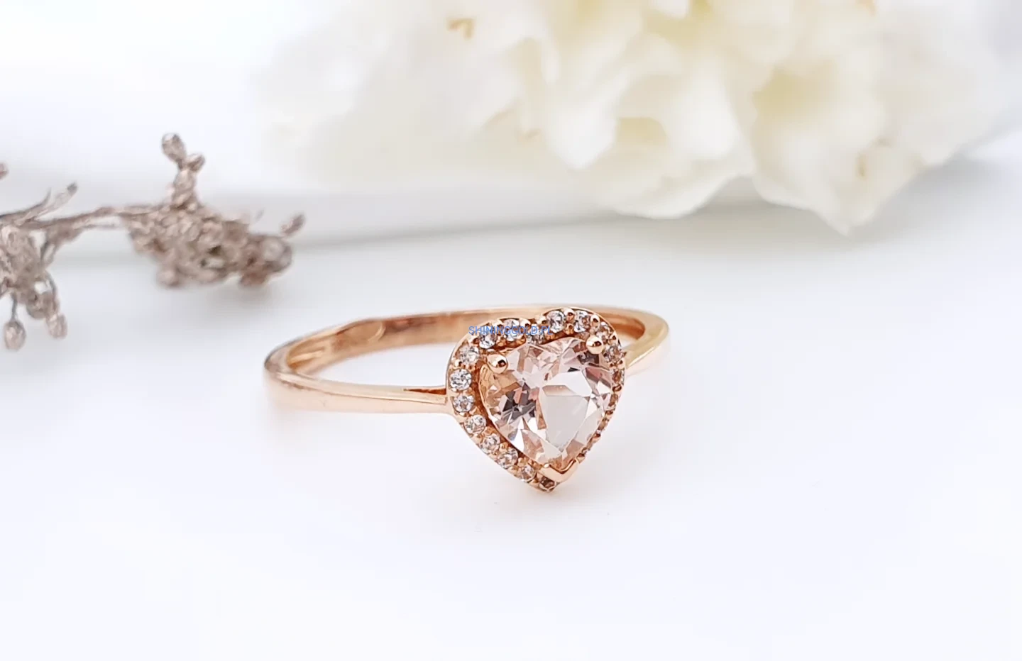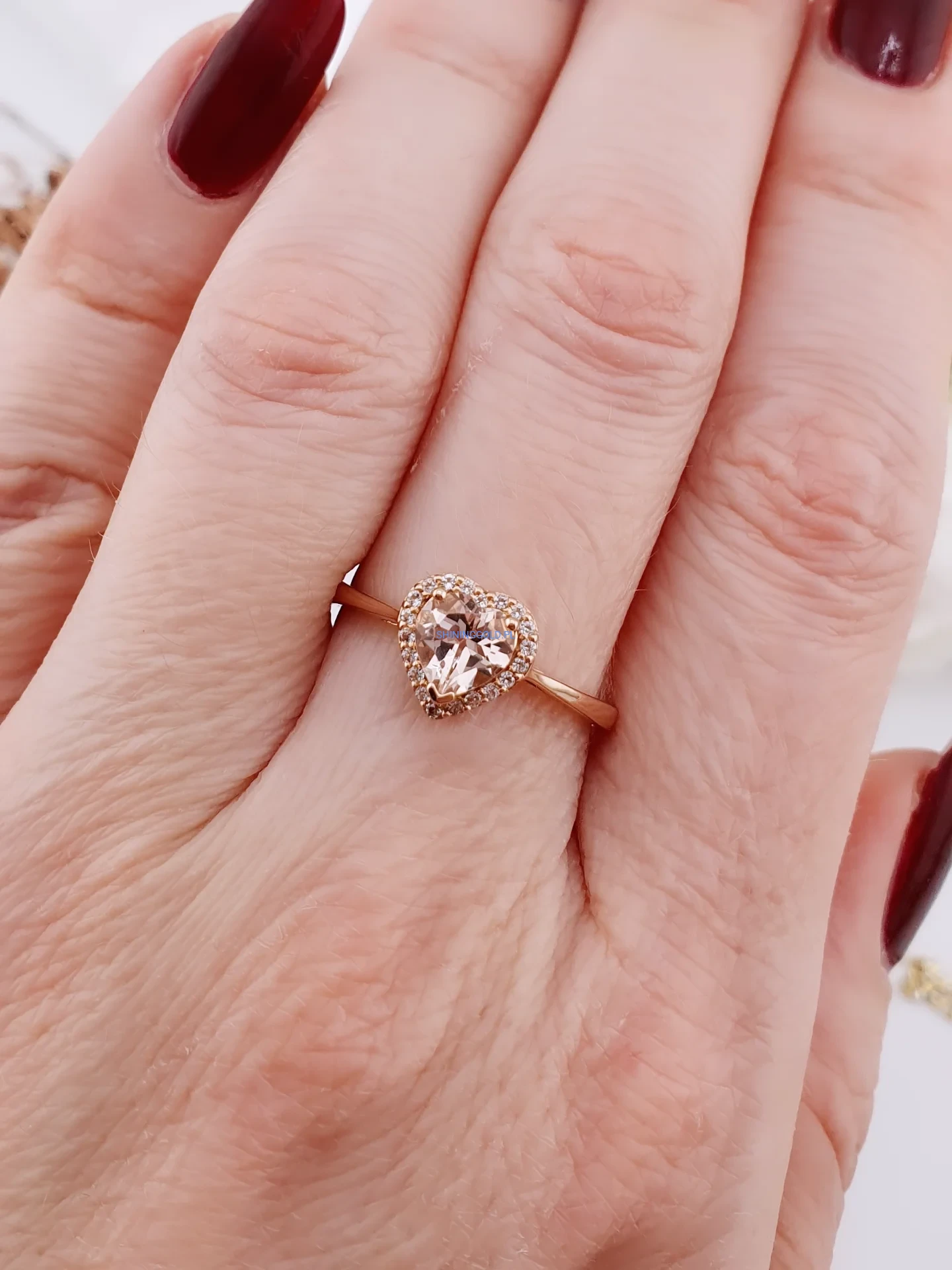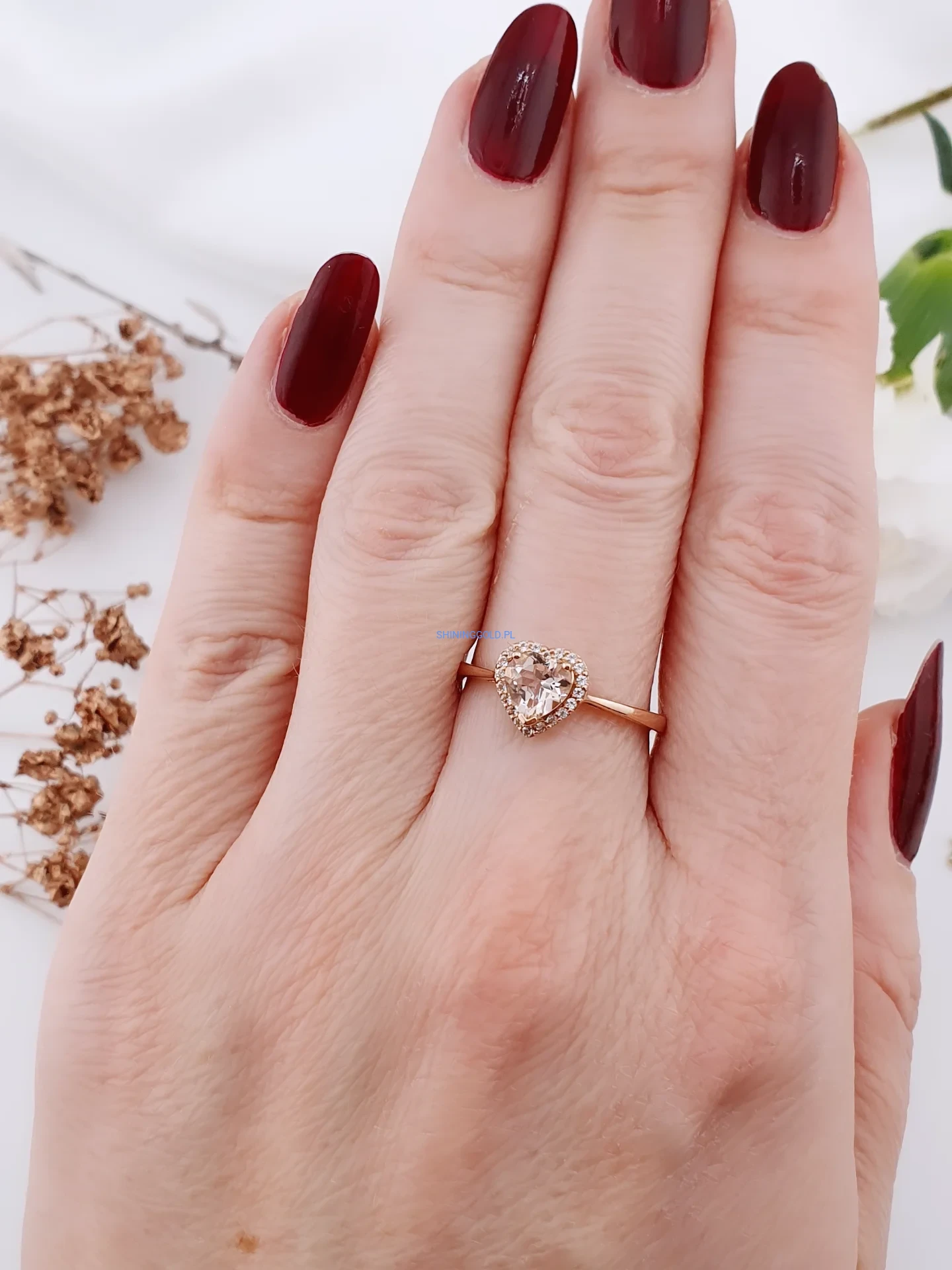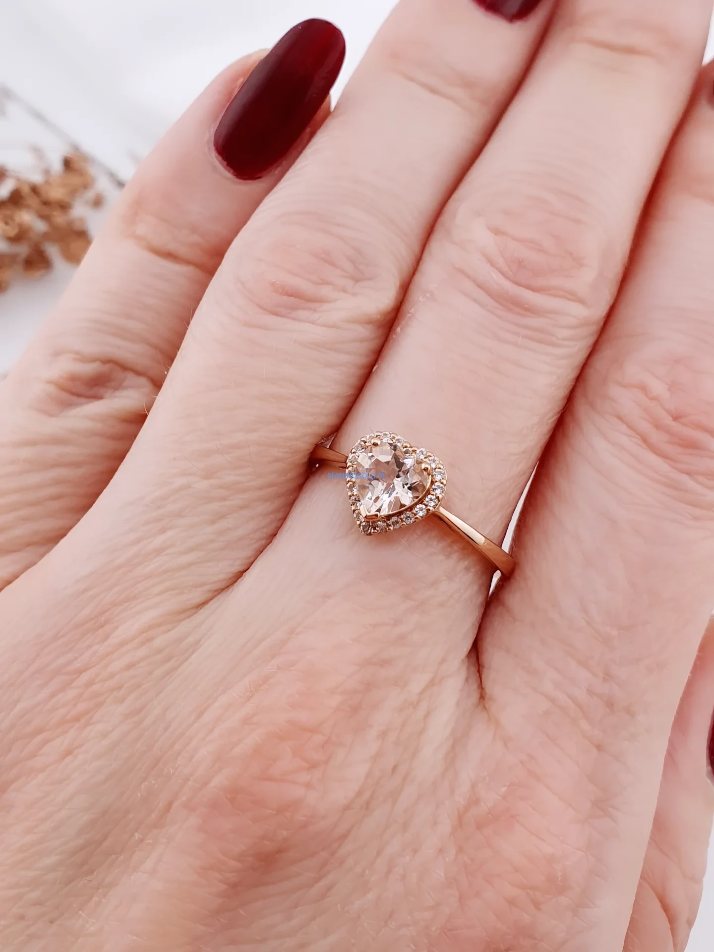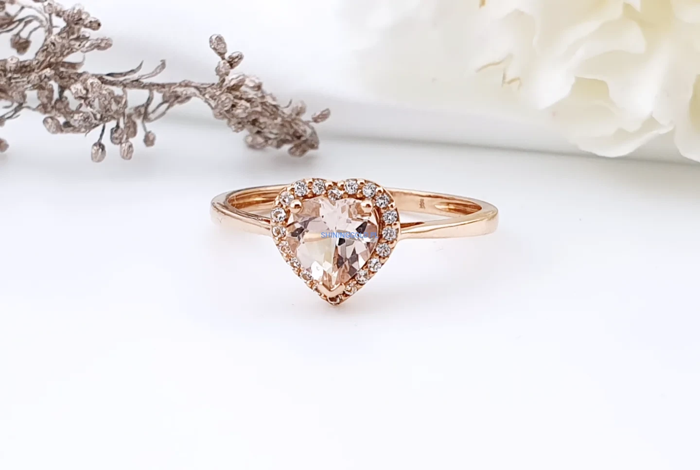 Delikatny i bardzo kobiecy pierścionek wykonany z różowego złota próby 585. Centralnym elementem jest cyrkonia w kształcie serca, osadzona w subtelnej oprawie typu halo, która dodatkowo podkreśla jej blask. Smukła obrączka nadaje całości lekkości i elegancji.