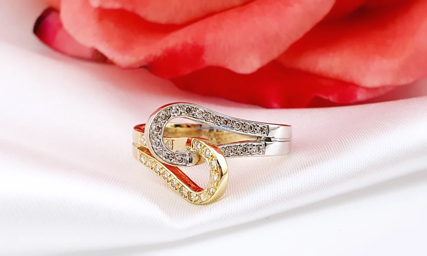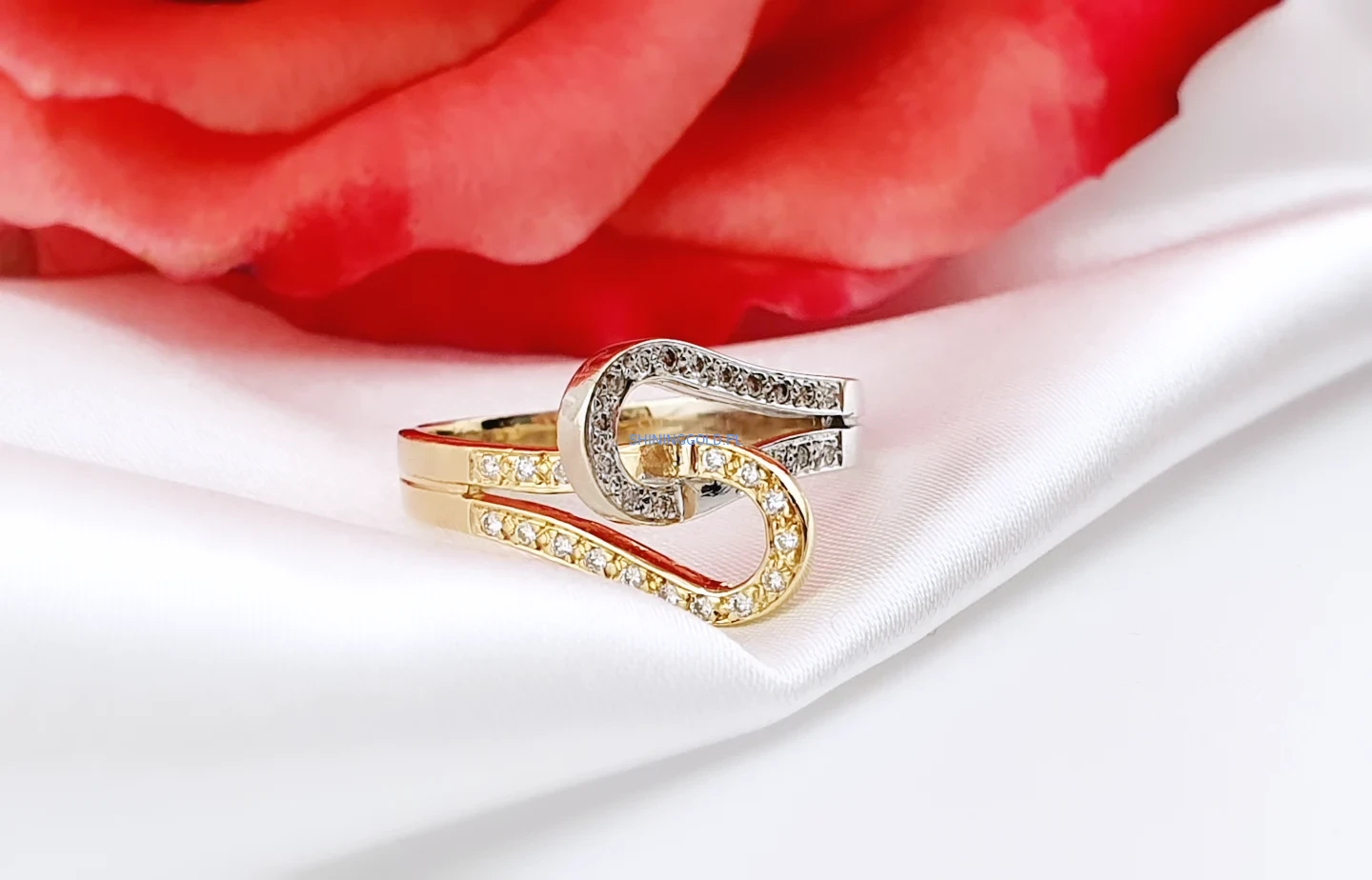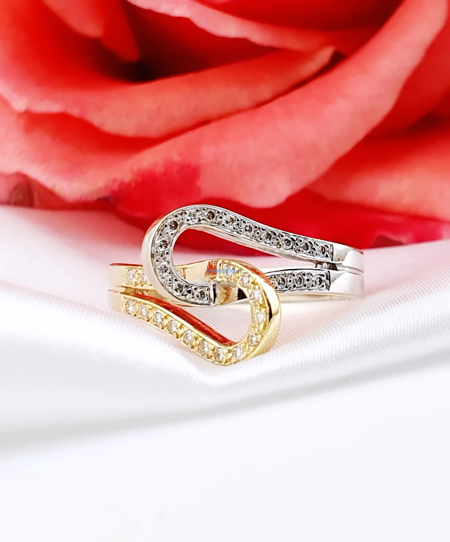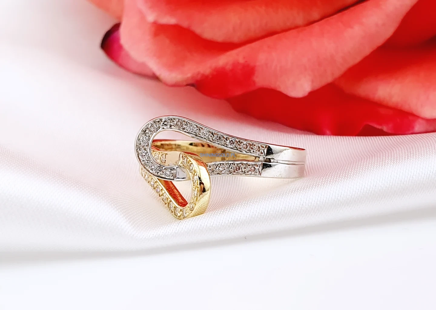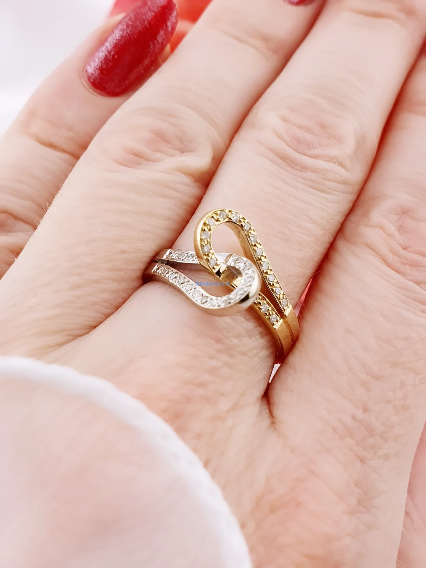 Złoty pierścionek 585 z diamentami – elegancki splot w dwóch kolorach złota