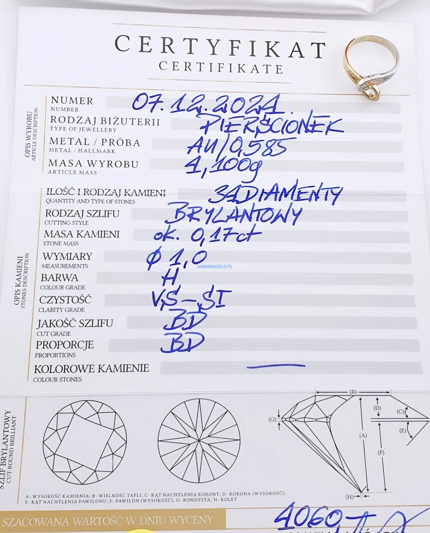 Złoty pierścionek 585 z Diamentami (1041WS)