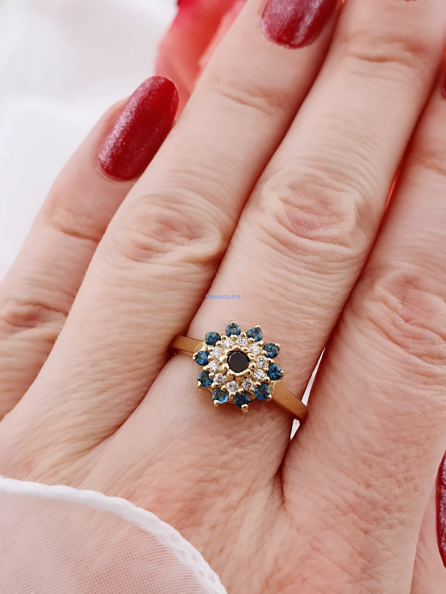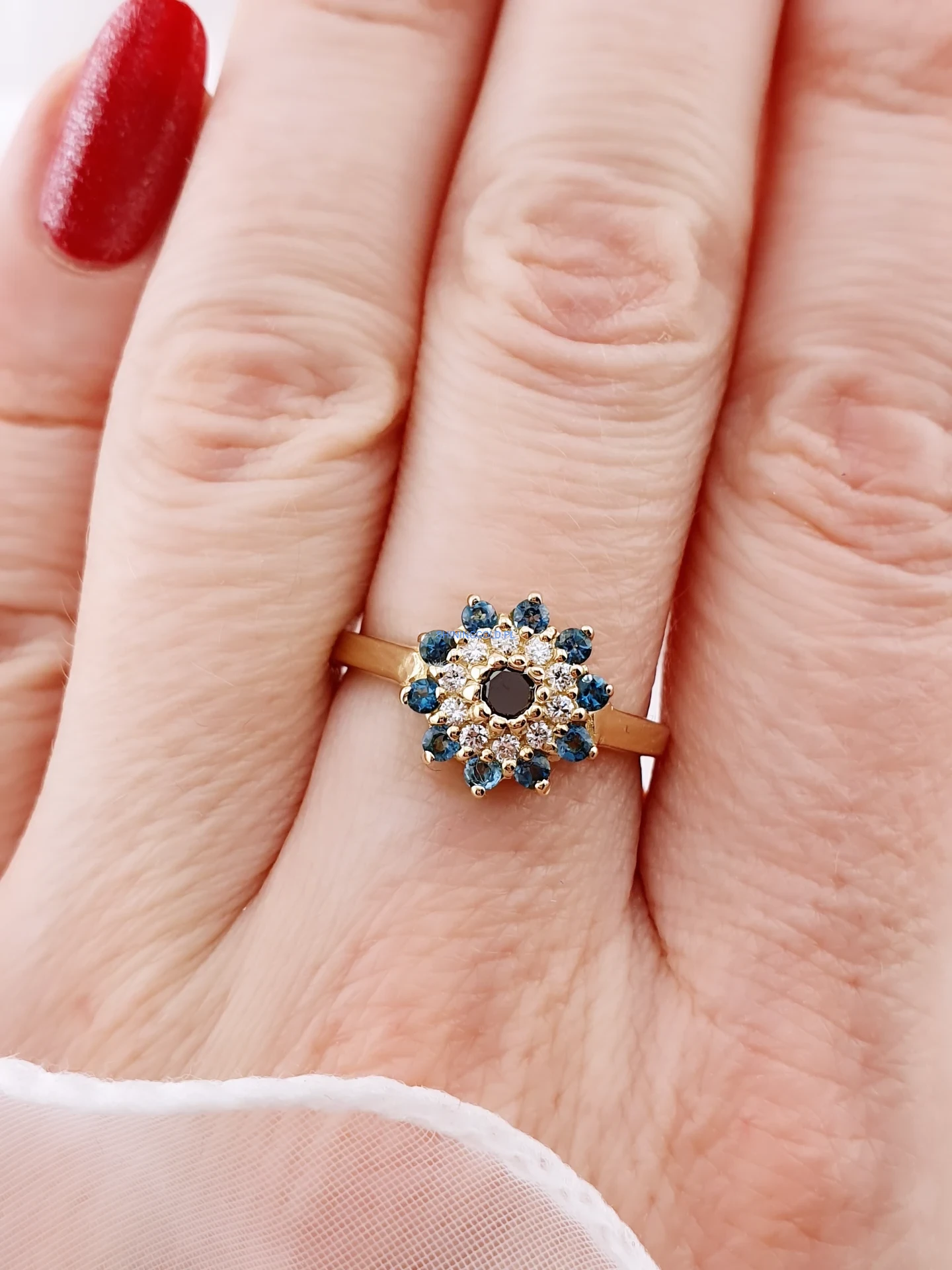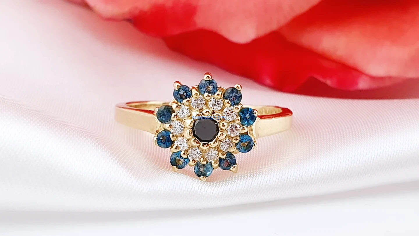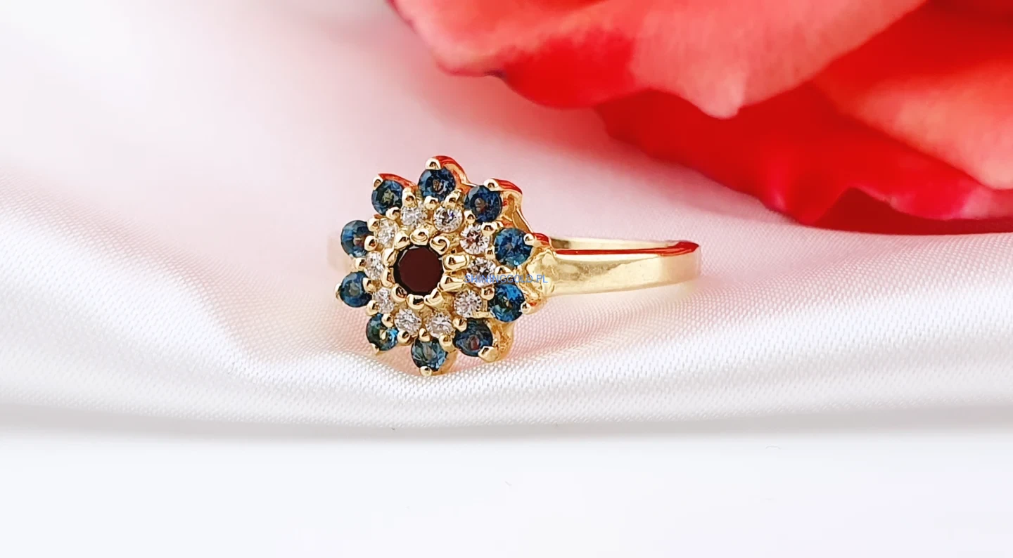 Wyjątkowy pierścionek wykonany ze złota próby 585, zachwycający bogatą i harmonijną oprawą kamieni. Centralne miejsce zajmuje czarny diament, otoczony brylantami o jasnej barwie H oraz głęboko niebieskimi topazami London Blue. Układ kamieni tworzy elegancki, kwiatowy motyw, który pięknie mieni się w świetle i przyciąga wzrok.