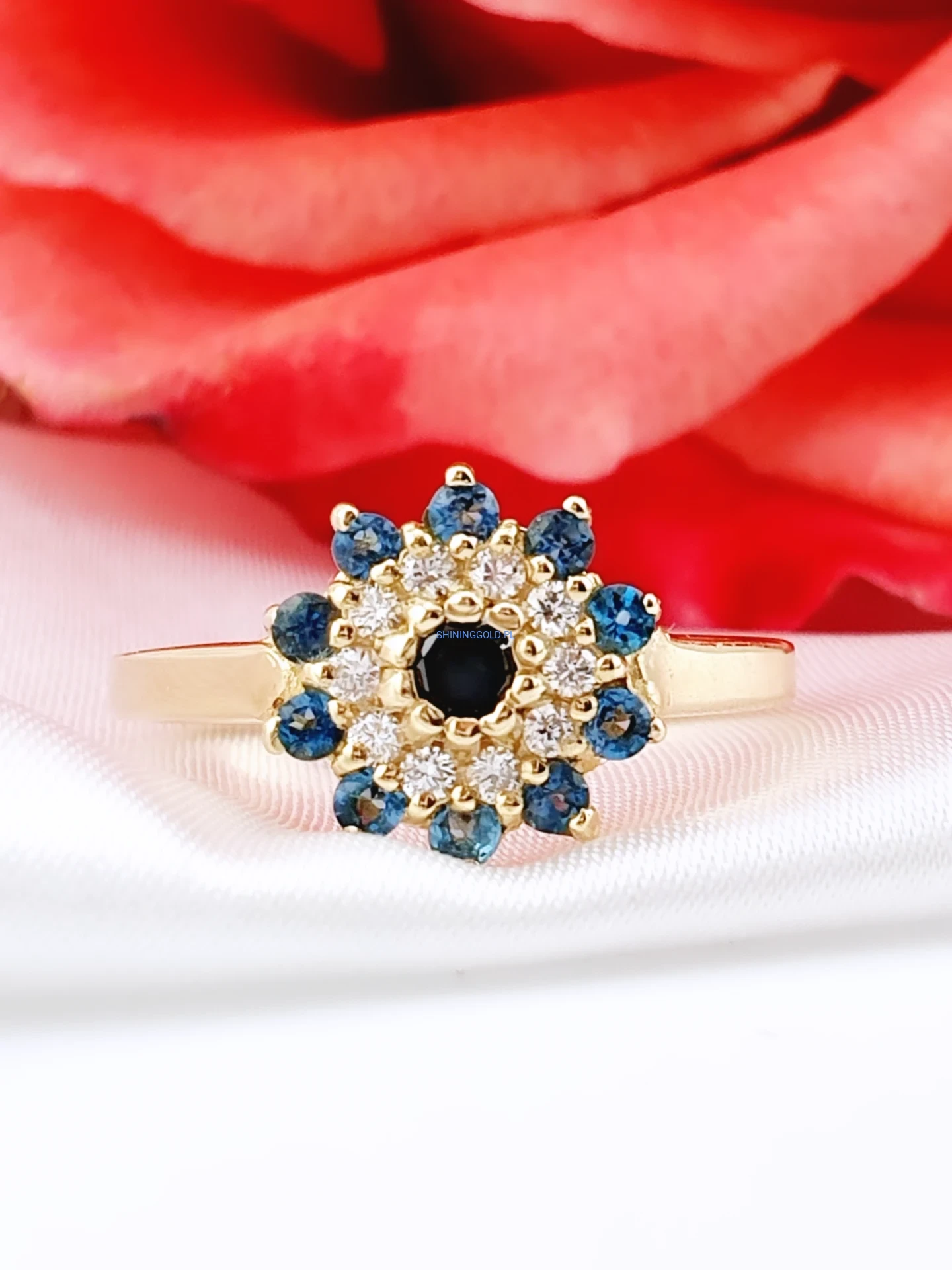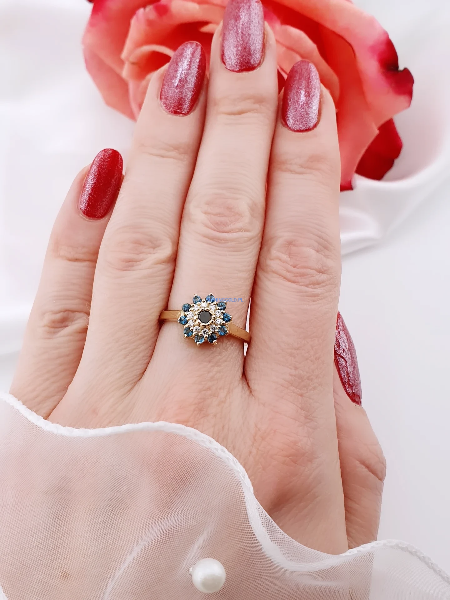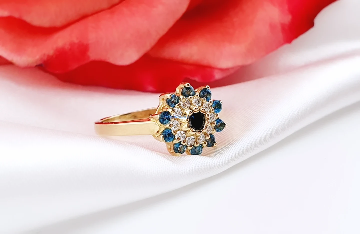 Wyjątkowy pierścionek wykonany ze złota próby 585, zachwycający bogatą i harmonijną oprawą kamieni. Centralne miejsce zajmuje czarny diament, otoczony brylantami o jasnej barwie H oraz głęboko niebieskimi topazami London Blue. Układ kamieni tworzy elegancki, kwiatowy motyw, który pięknie mieni się w świetle i przyciąga wzrok.
