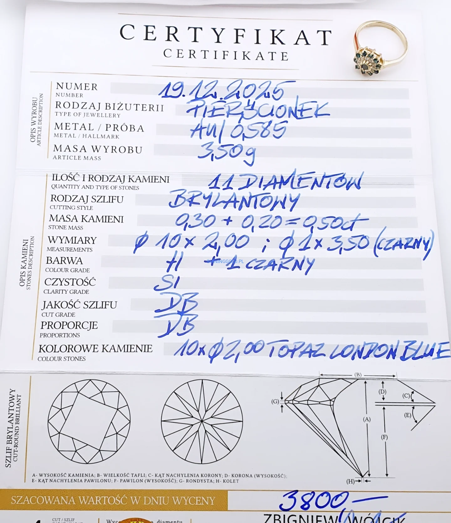 • diamenty: 11 szt., łącznie ok. 0,50 ct