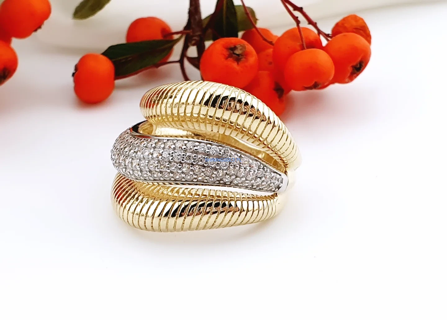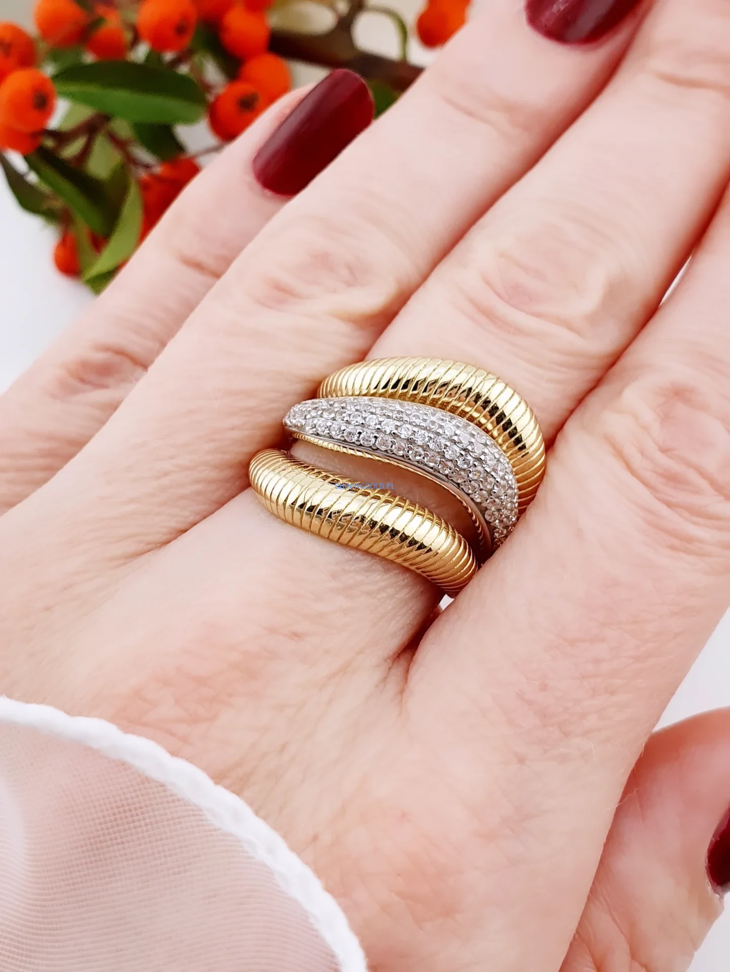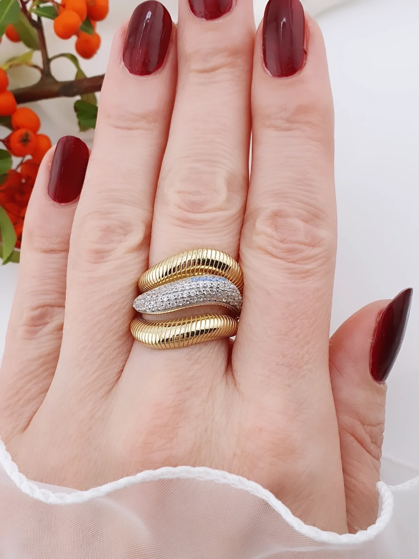 Zjawiskowy, pełen blasku pierścionek wykonany z żółtego złota próby 585. Jego nowoczesna, potrójna forma o charakterystycznej, karbowanej strukturze zachwyca elegancją i oryginalnością. Centralny pas wysadzany drobnymi, lśniącymi cyrkoniami nadaje mu wyjątkowego luksusu i sprawia, że biżuteria pięknie odbija światło.