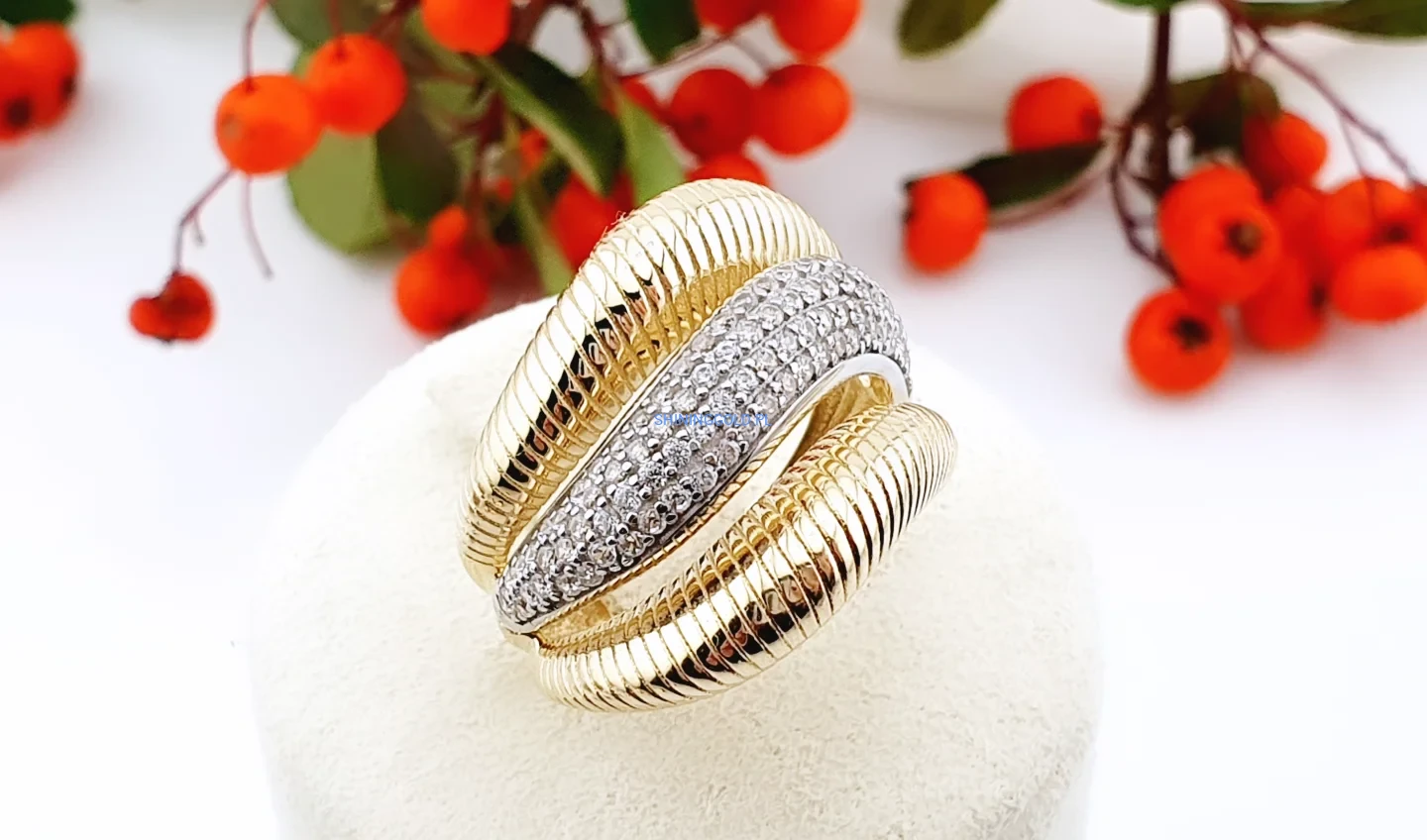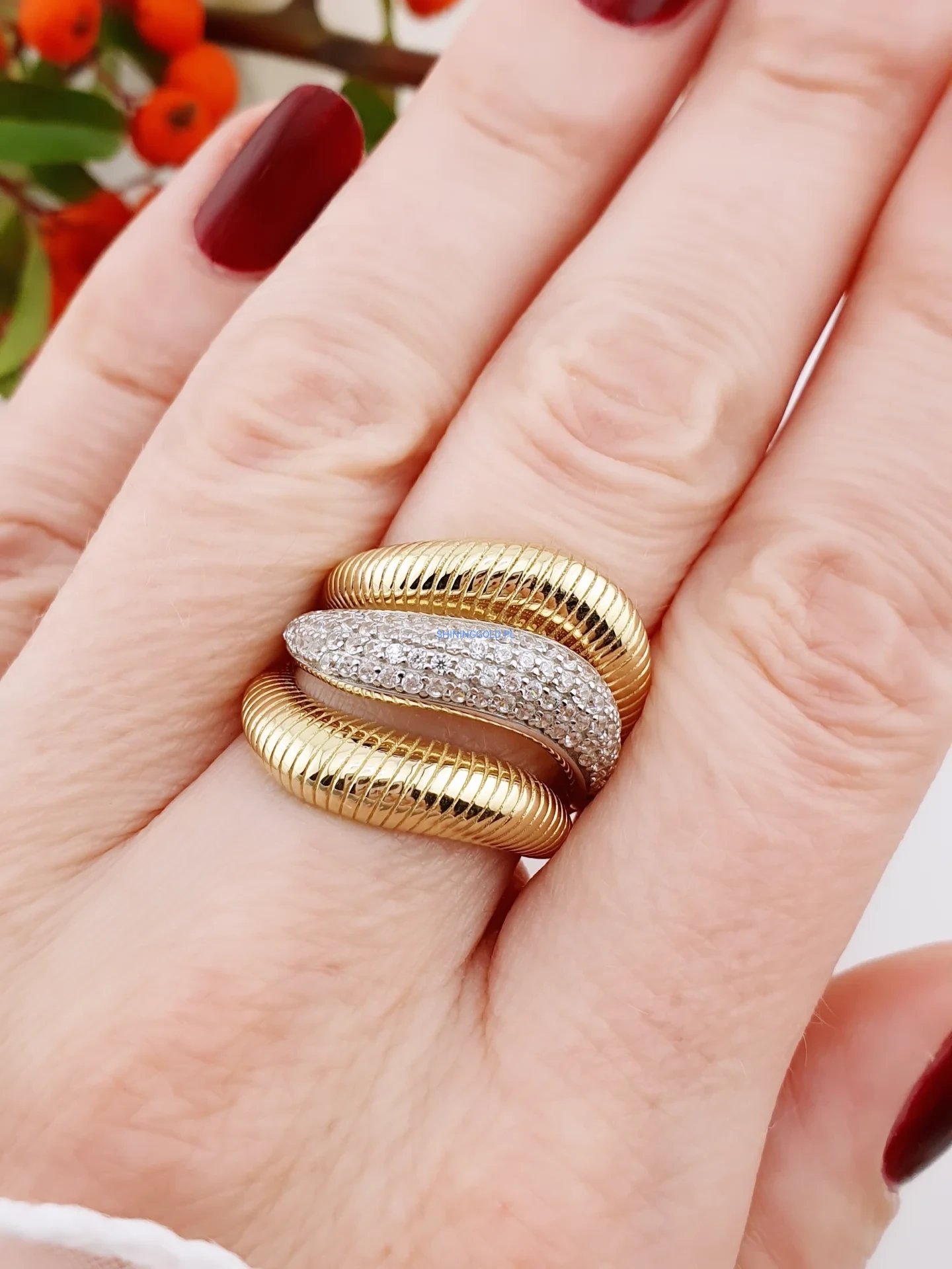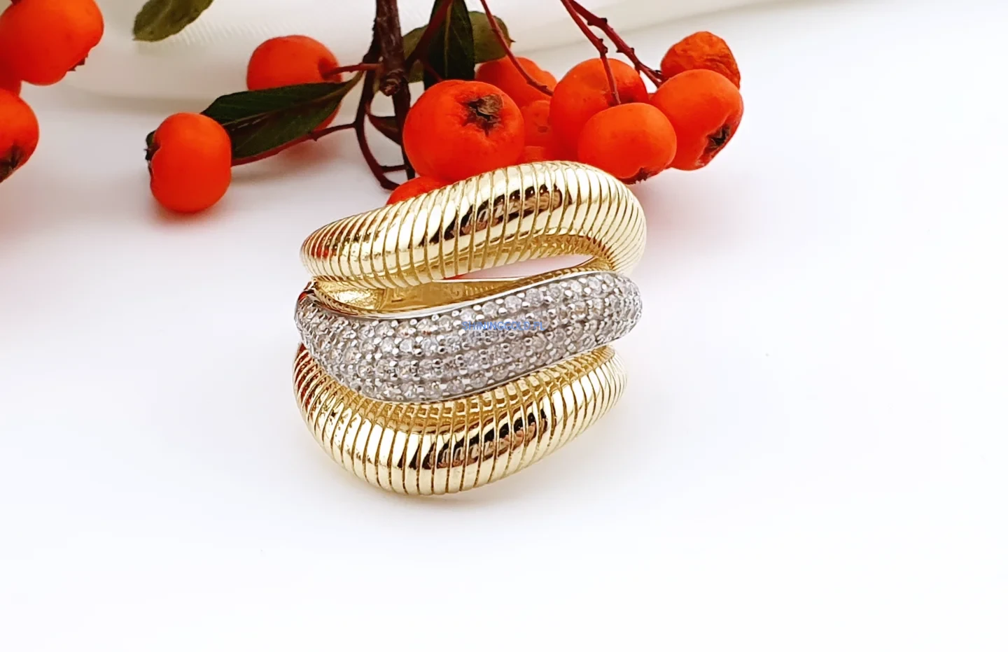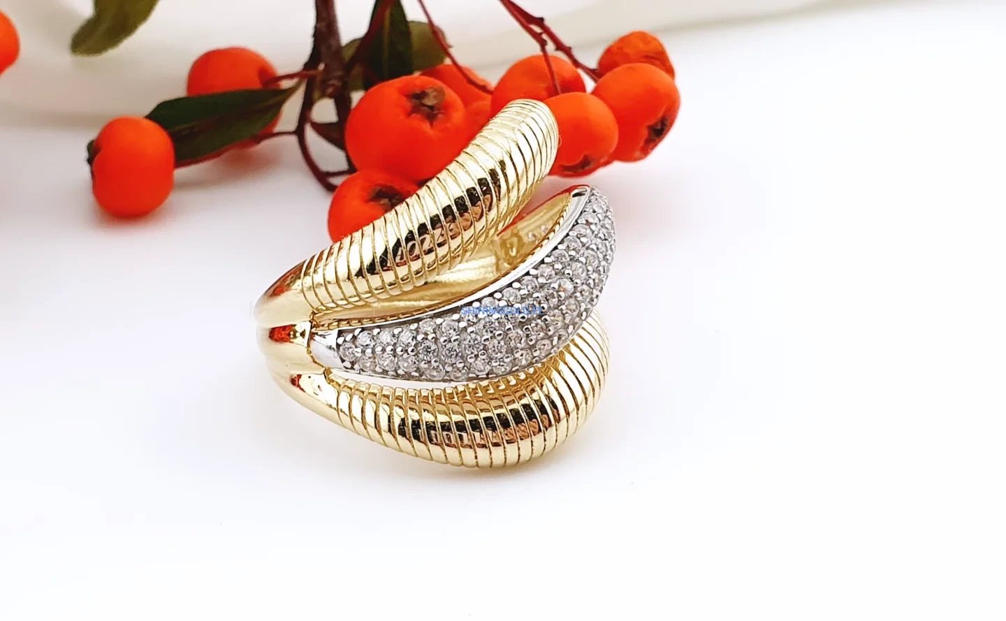 Zjawiskowy, pełen blasku pierścionek wykonany z żółtego złota próby 585. Jego nowoczesna, potrójna forma o charakterystycznej, karbowanej strukturze zachwyca elegancją i oryginalnością. Centralny pas wysadzany drobnymi, lśniącymi cyrkoniami nadaje mu wyjątkowego luksusu i sprawia, że biżuteria pięknie odbija światło.