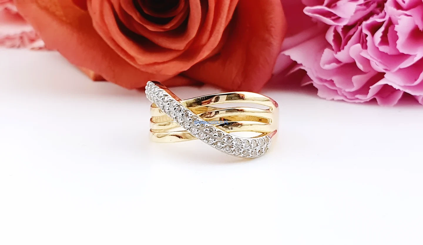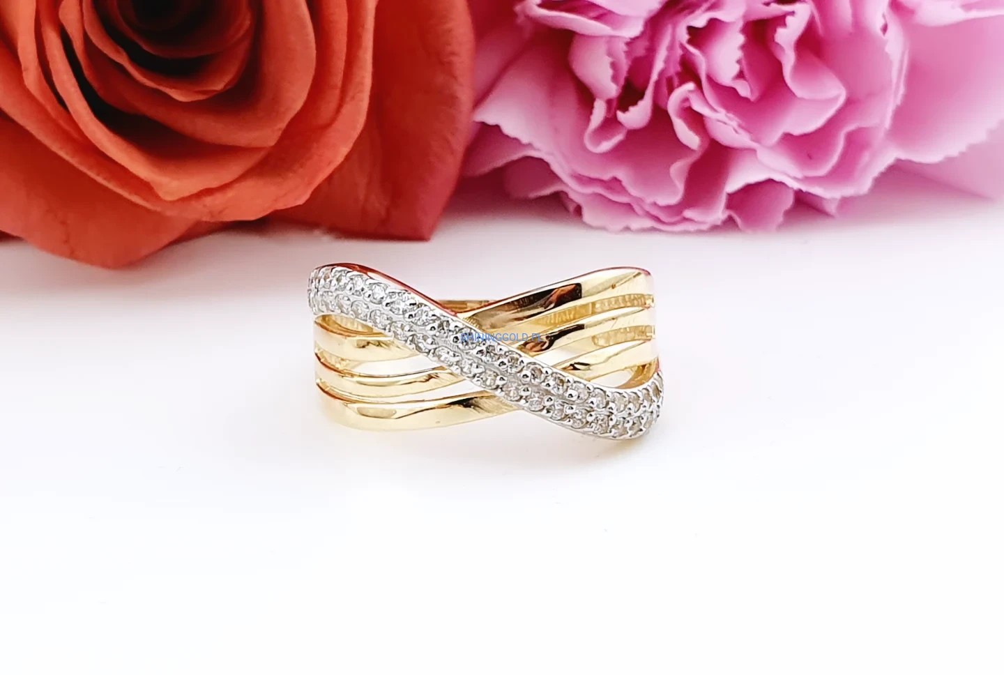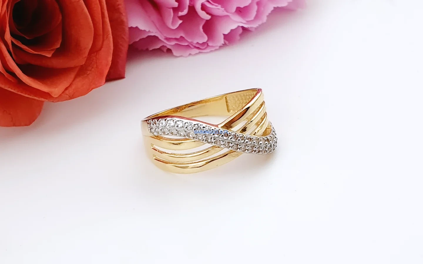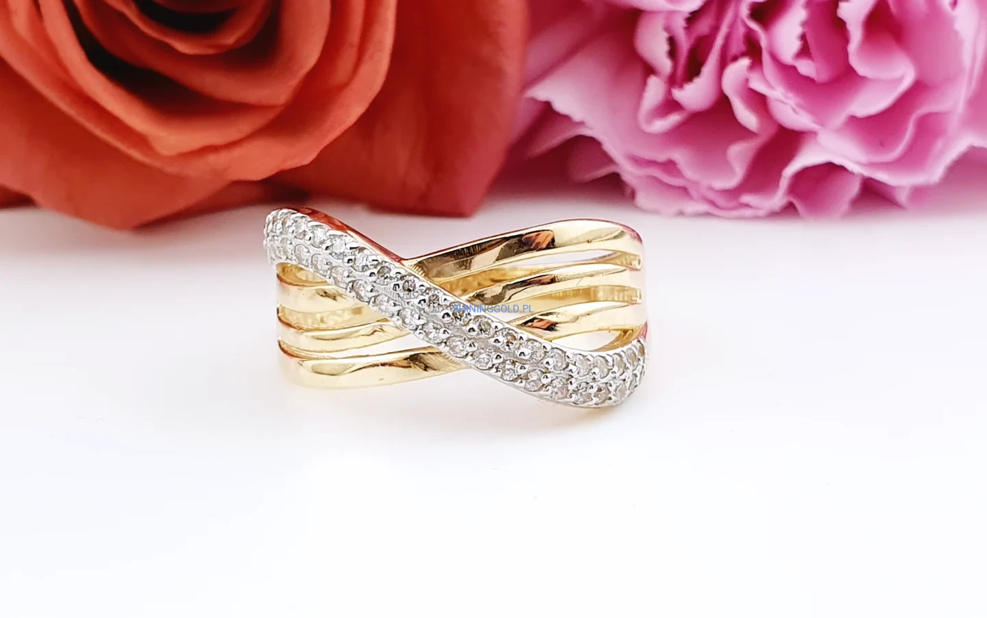 Złoty pierścionek 585 z cyrkoniami – szeroki (049A)