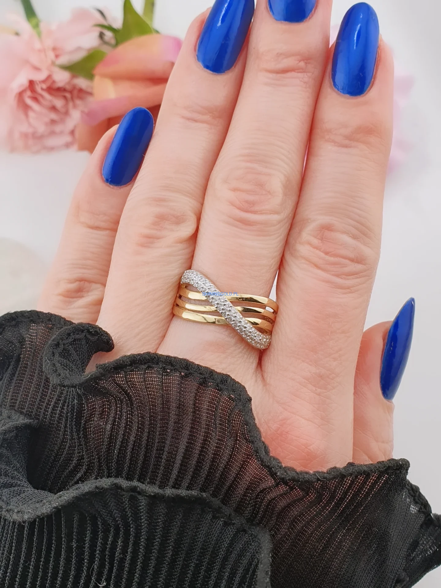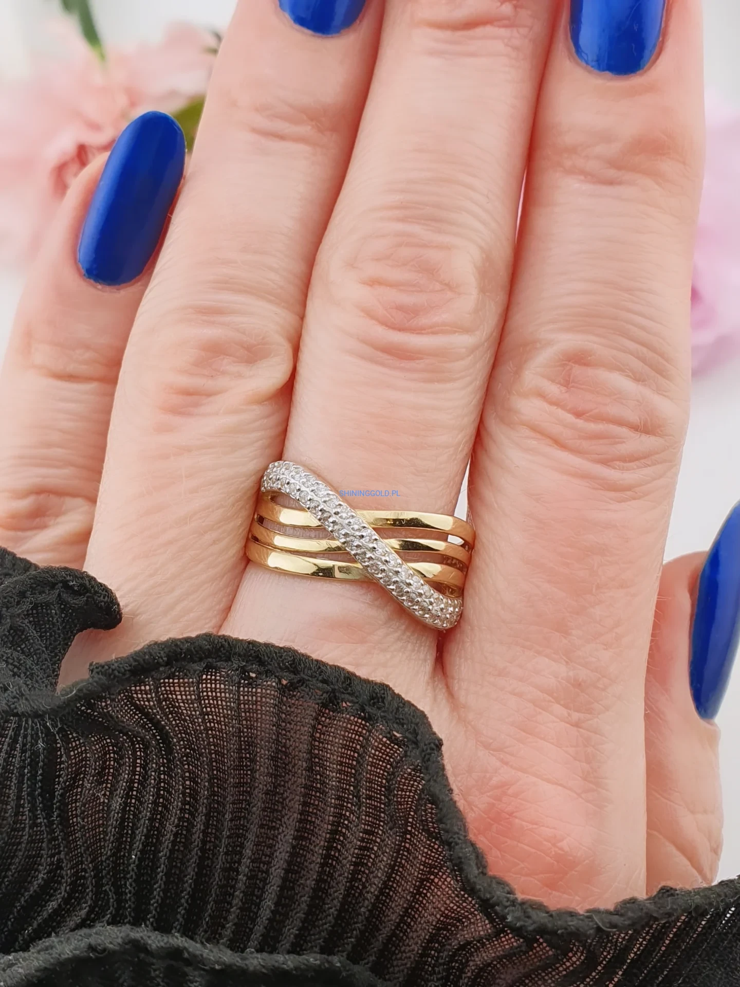 Stylowy pierścionek wykonany ze złota próby 585, o szerszej formie i efektownym przeplatanym wzorze. Subtelnie osadzone cyrkonie dodają mu blasku i podkreślają jego elegancki charakter.