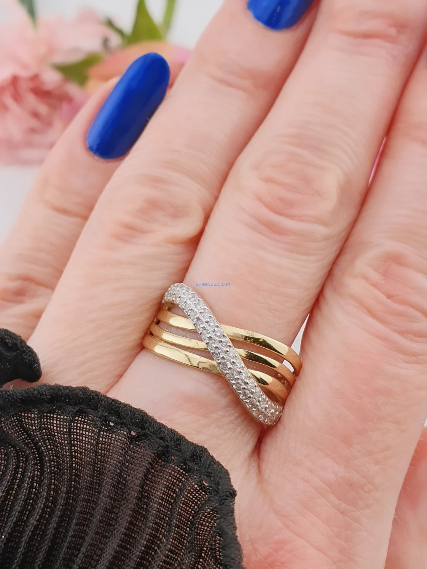 Złoty pierścionek 585 z cyrkoniami – szeroki