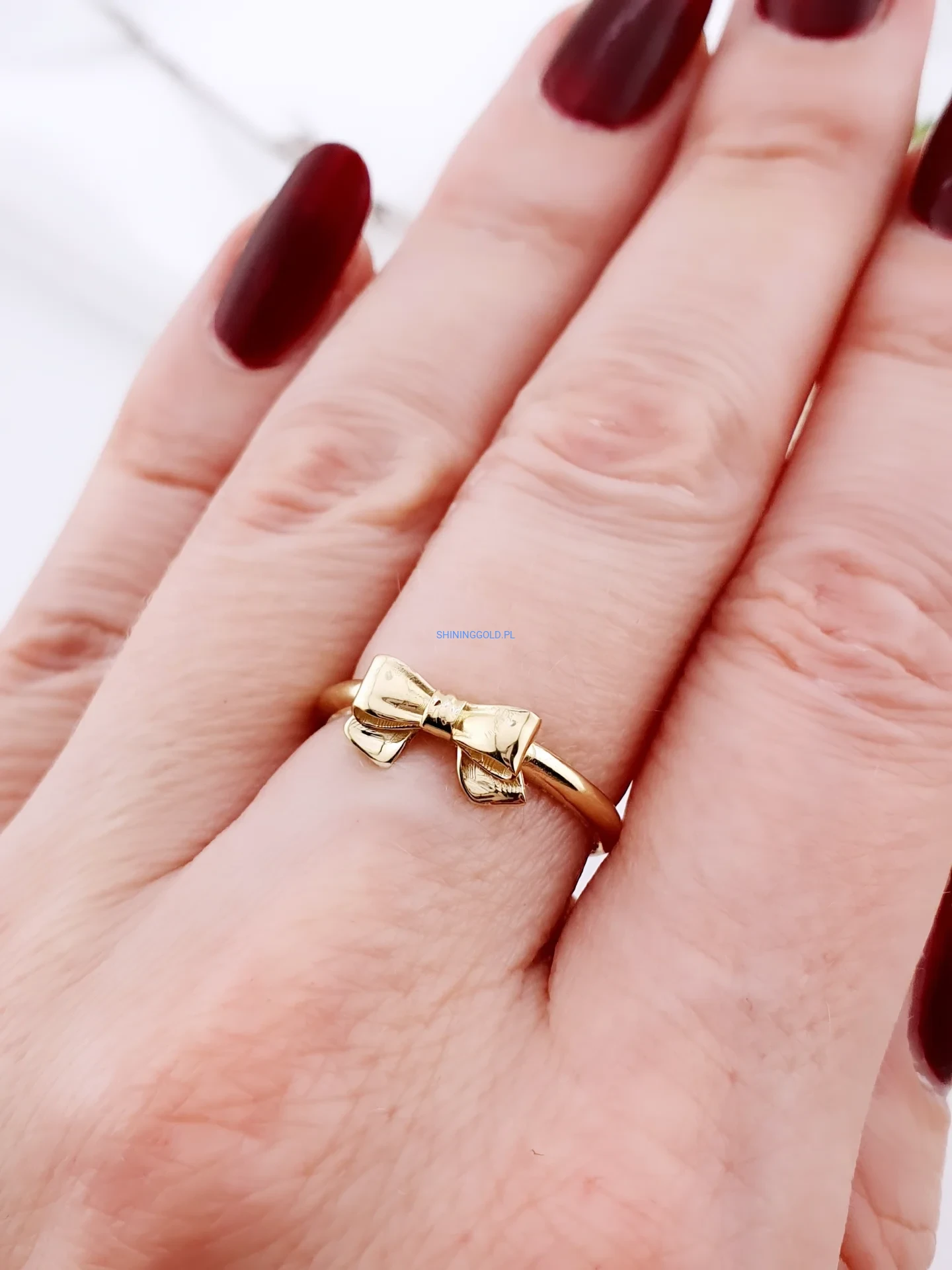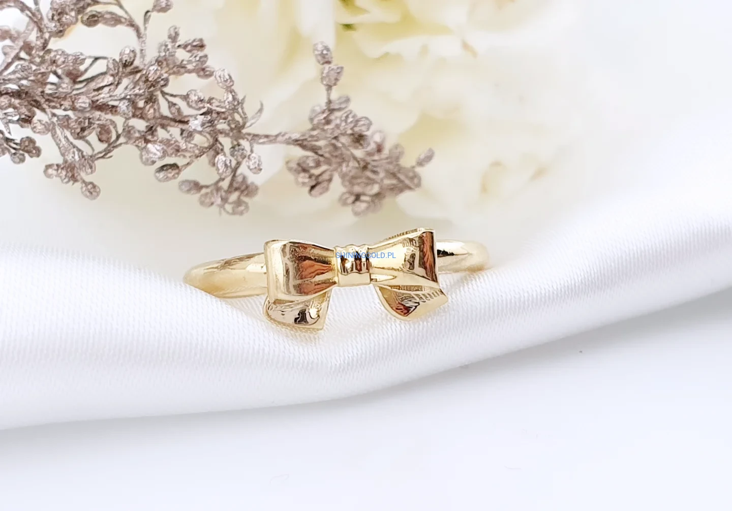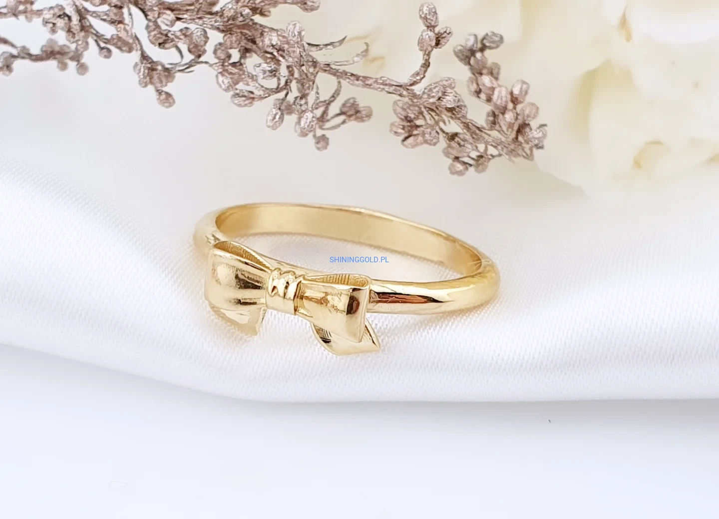 Gładka, polerowana powierzchnia pięknie odbija światło, podkreślając ciepły odcień złota. Motyw kokardki nadaje pierścionkowi romantycznego charakteru i czyni go doskonałym wyborem na prezent – zarówno dla młodszej, jak i dorosłej osoby.
