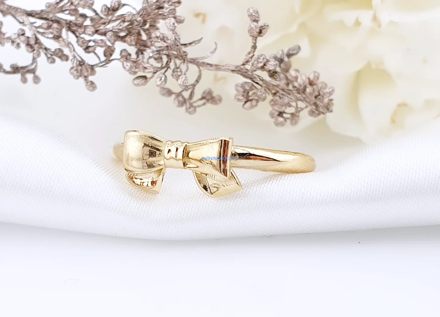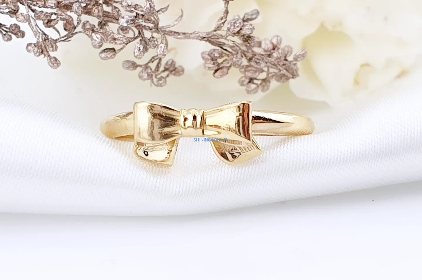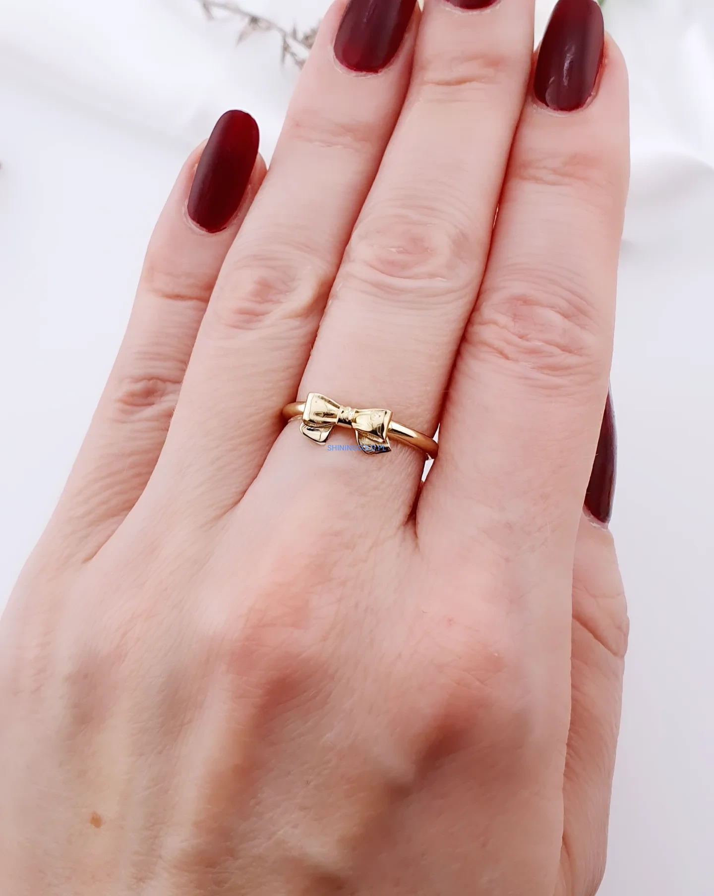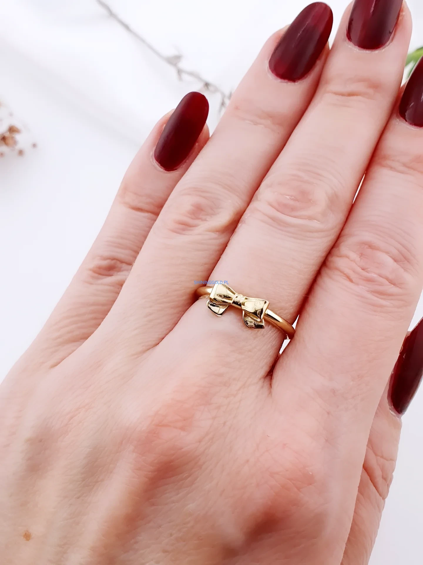 Gładka, polerowana powierzchnia pięknie odbija światło, podkreślając ciepły odcień złota. Motyw kokardki nadaje pierścionkowi romantycznego charakteru i czyni go doskonałym wyborem na prezent – zarówno dla młodszej, jak i dorosłej osoby.