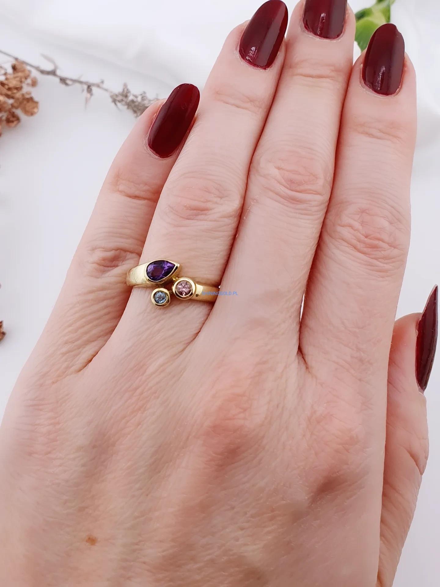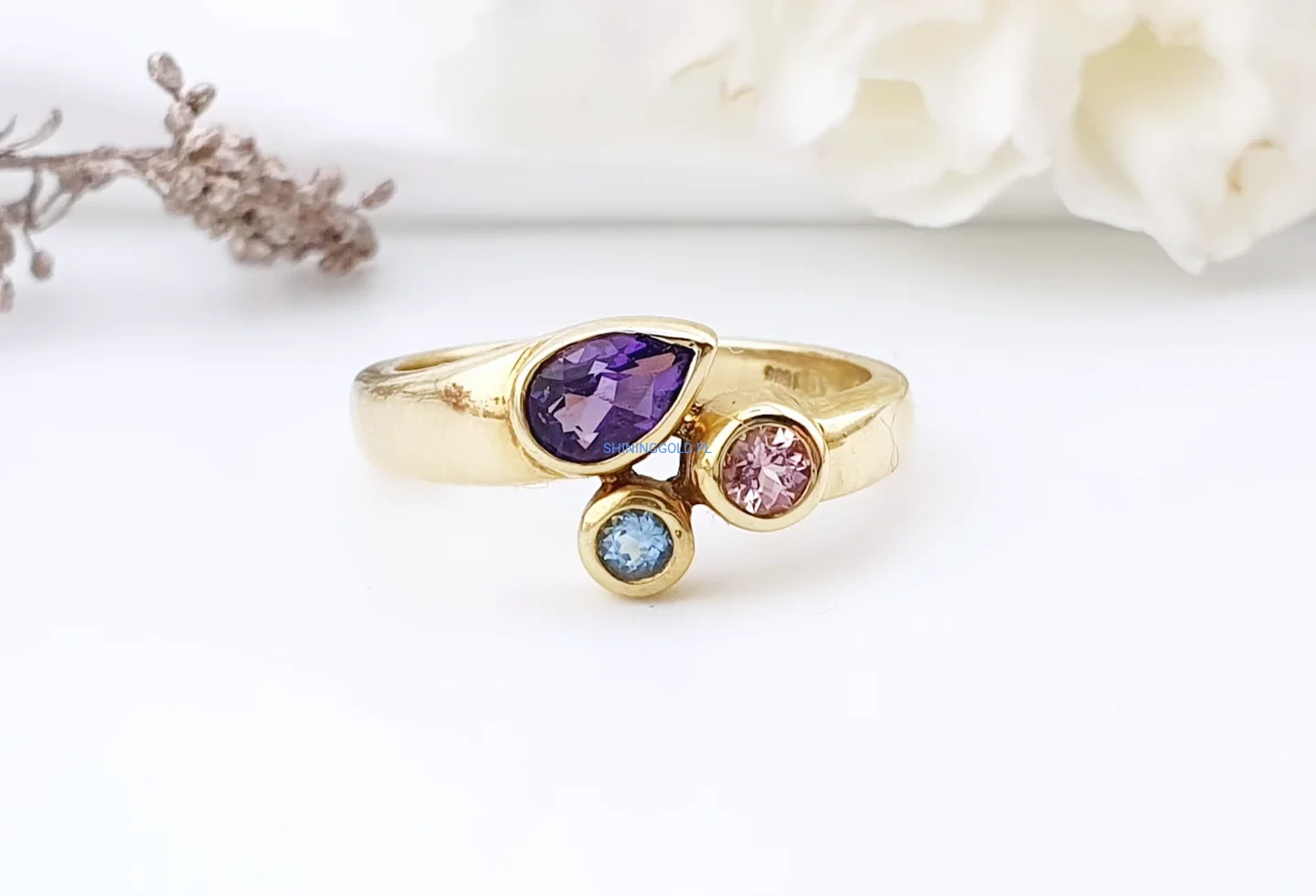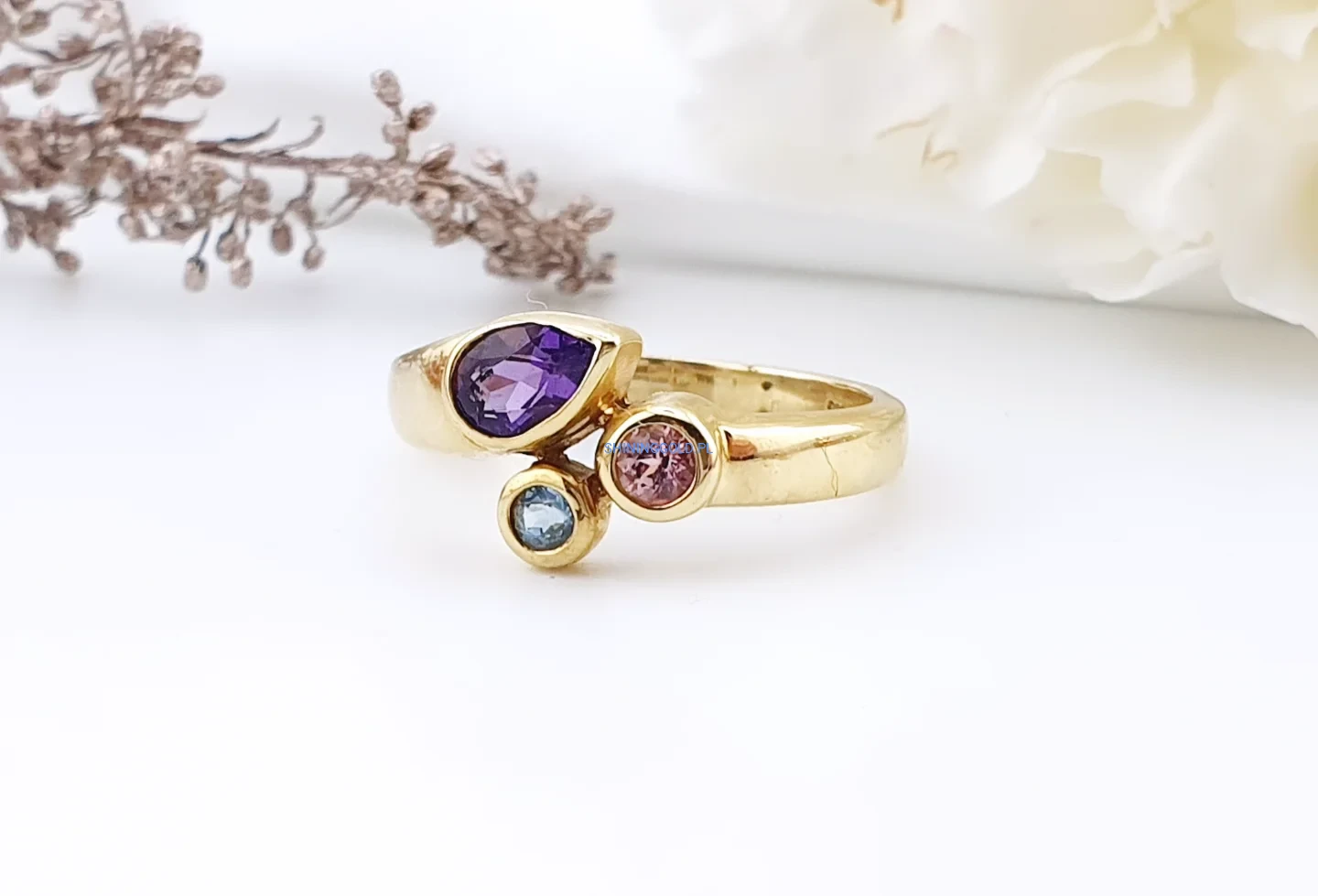 Efektowny pierścionek wykonany z żółtego złota próby 585, ozdobiony trzema kamieniami w różnych barwach. Centralnym elementem jest fioletowy kamień o łezkowatym kształcie, któremu towarzyszą dwa mniejsze kamienie w odcieniach różu i błękitu. Taka kompozycja nadaje biżuterii nowoczesny, artystyczny charakter.