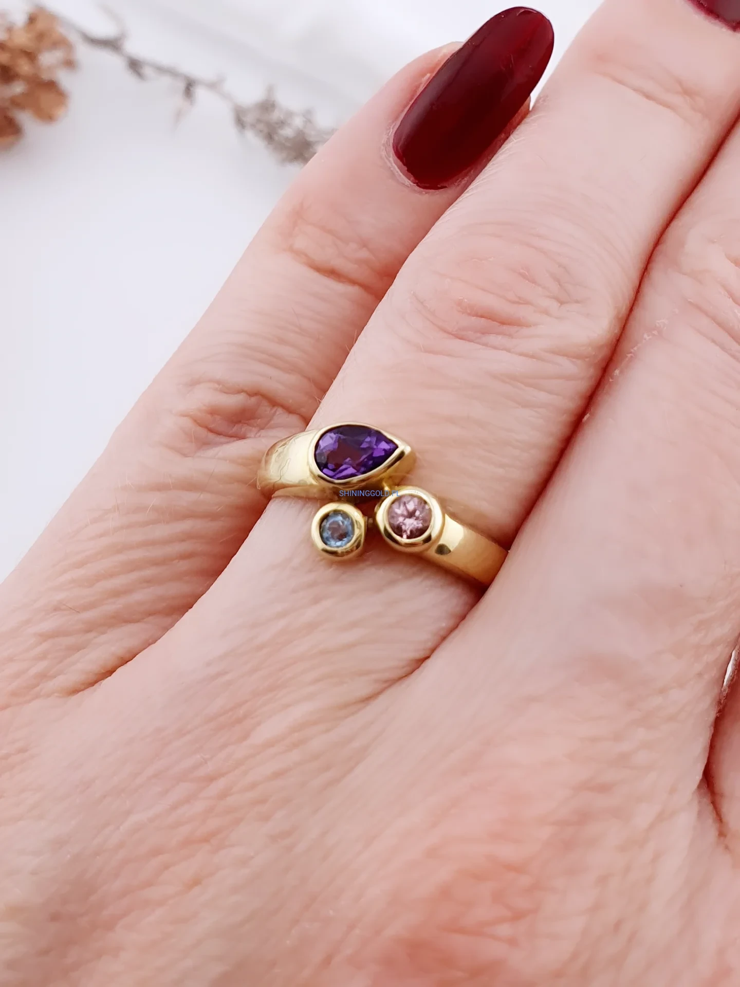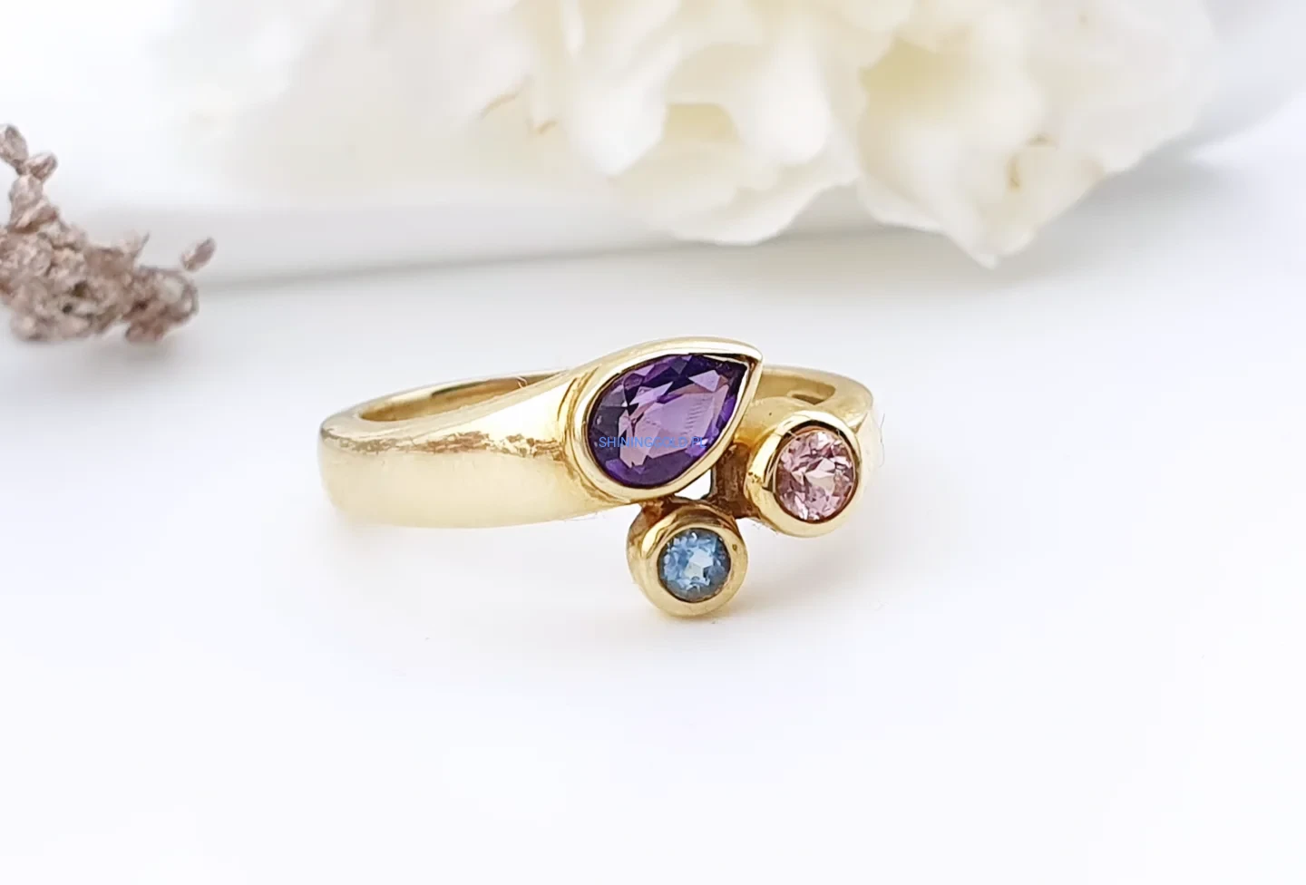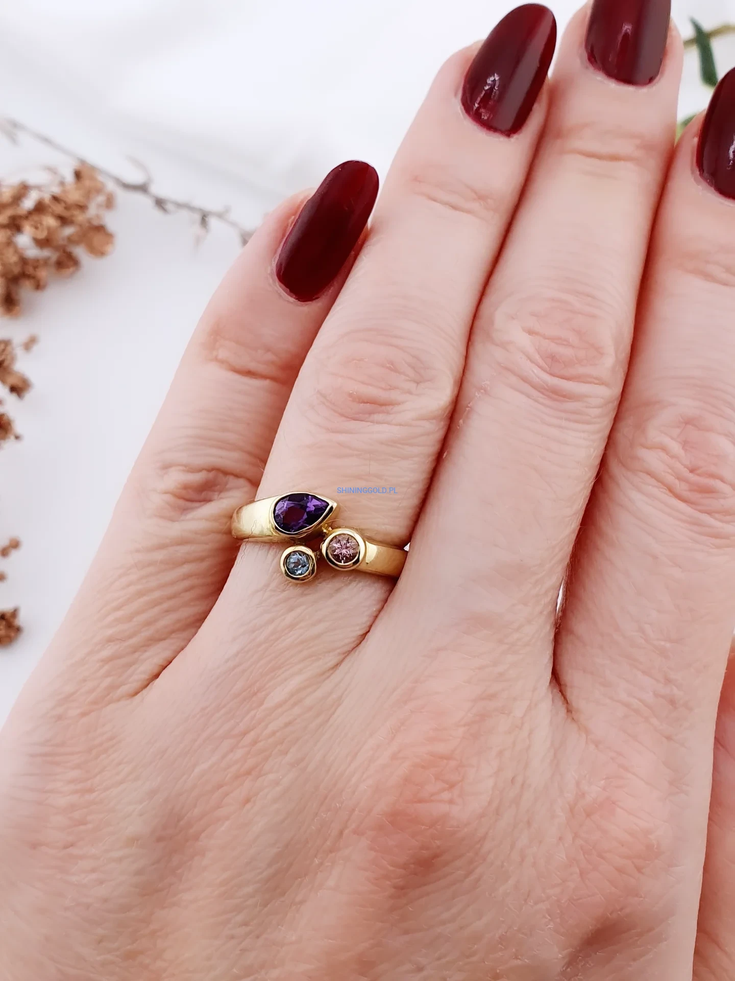 Efektowny pierścionek wykonany z żółtego złota próby 585, ozdobiony trzema kamieniami w różnych barwach. Centralnym elementem jest fioletowy kamień o łezkowatym kształcie, któremu towarzyszą dwa mniejsze kamienie w odcieniach różu i błękitu. Taka kompozycja nadaje biżuterii nowoczesny, artystyczny charakter.