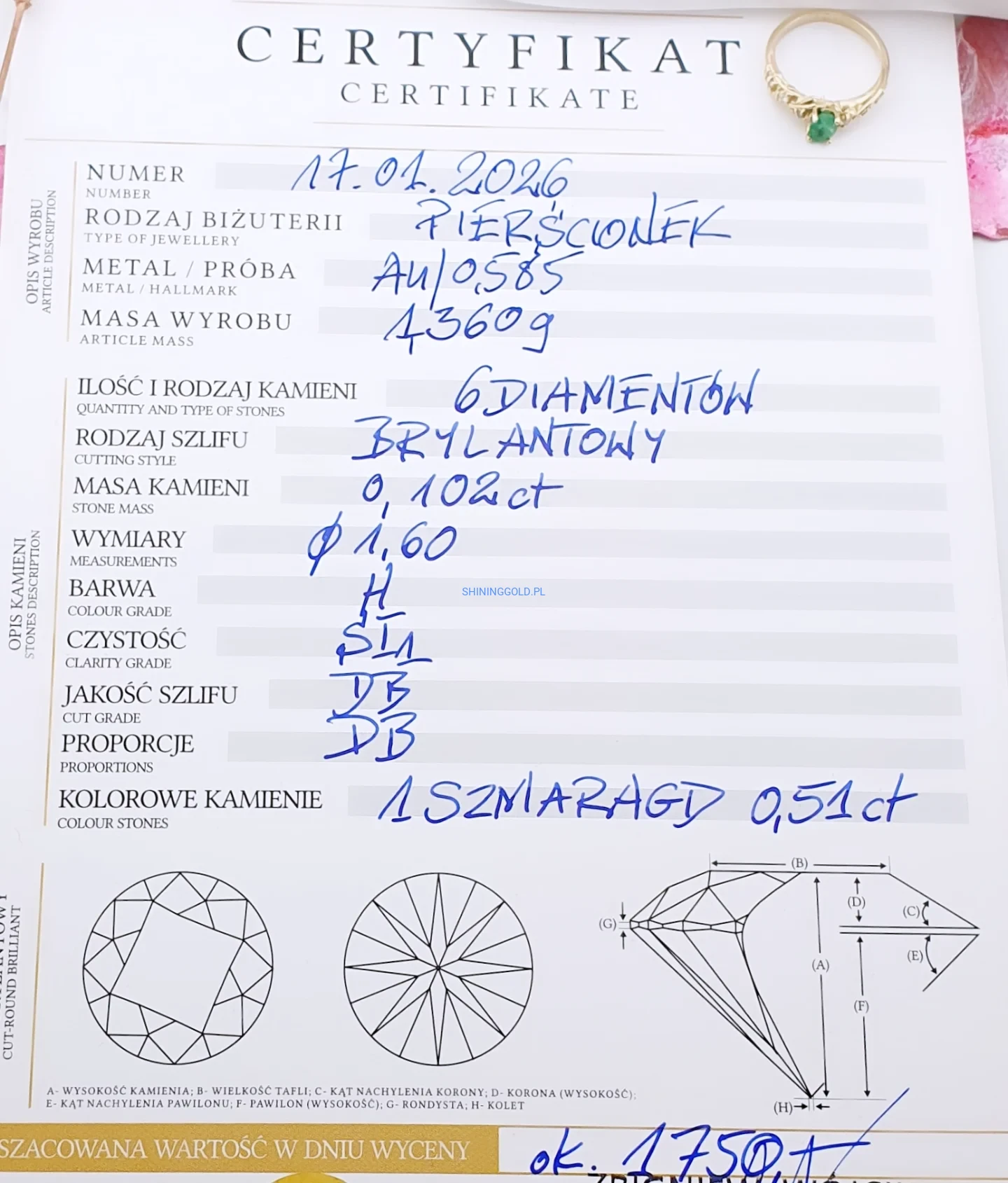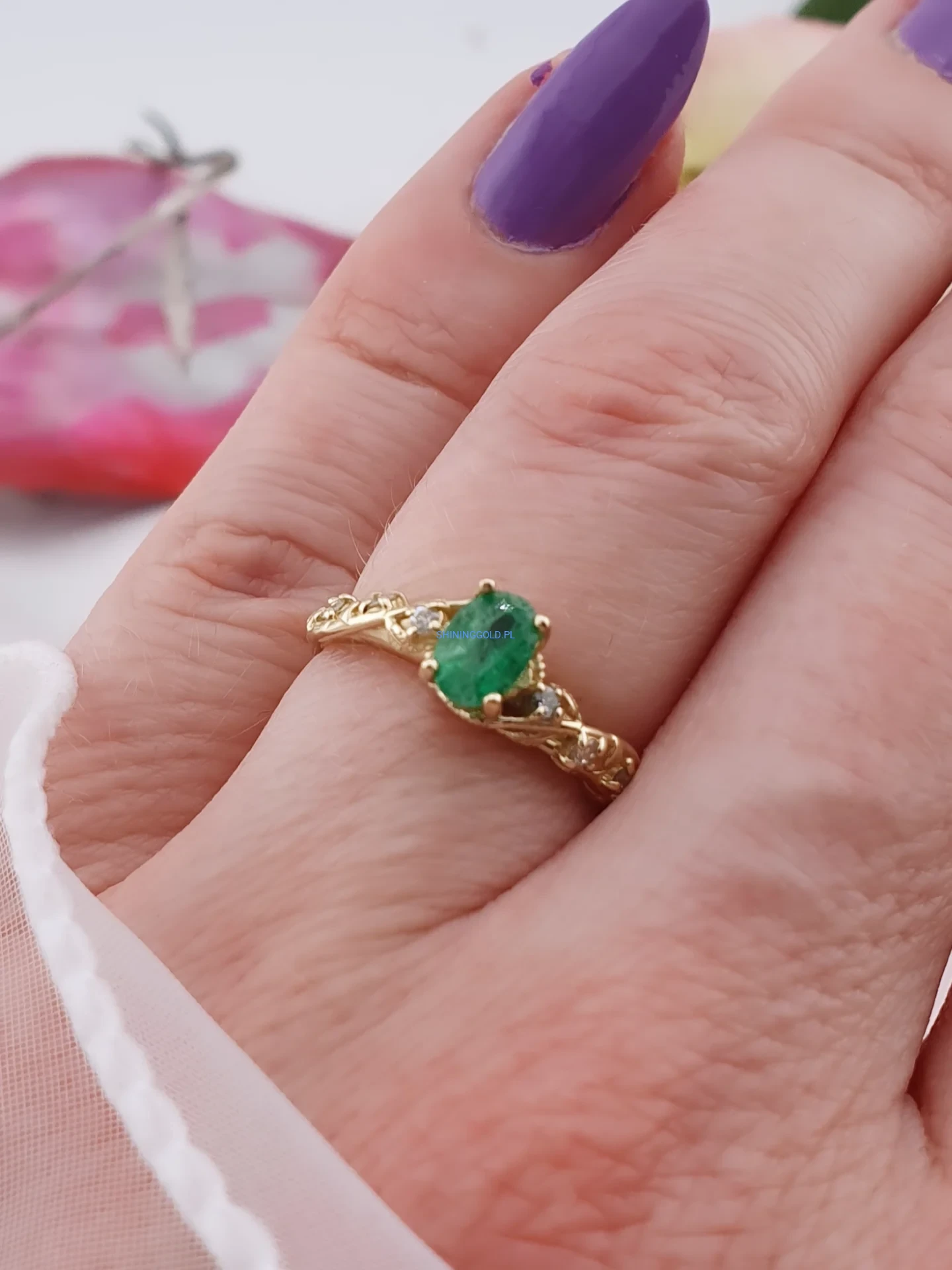 Złoty pierścionek 585 z naturalnym szmaragdem i diamentami (1012WS)