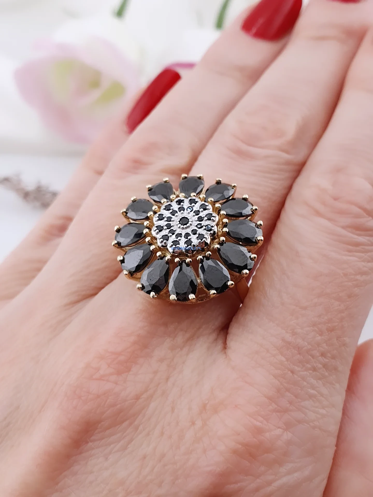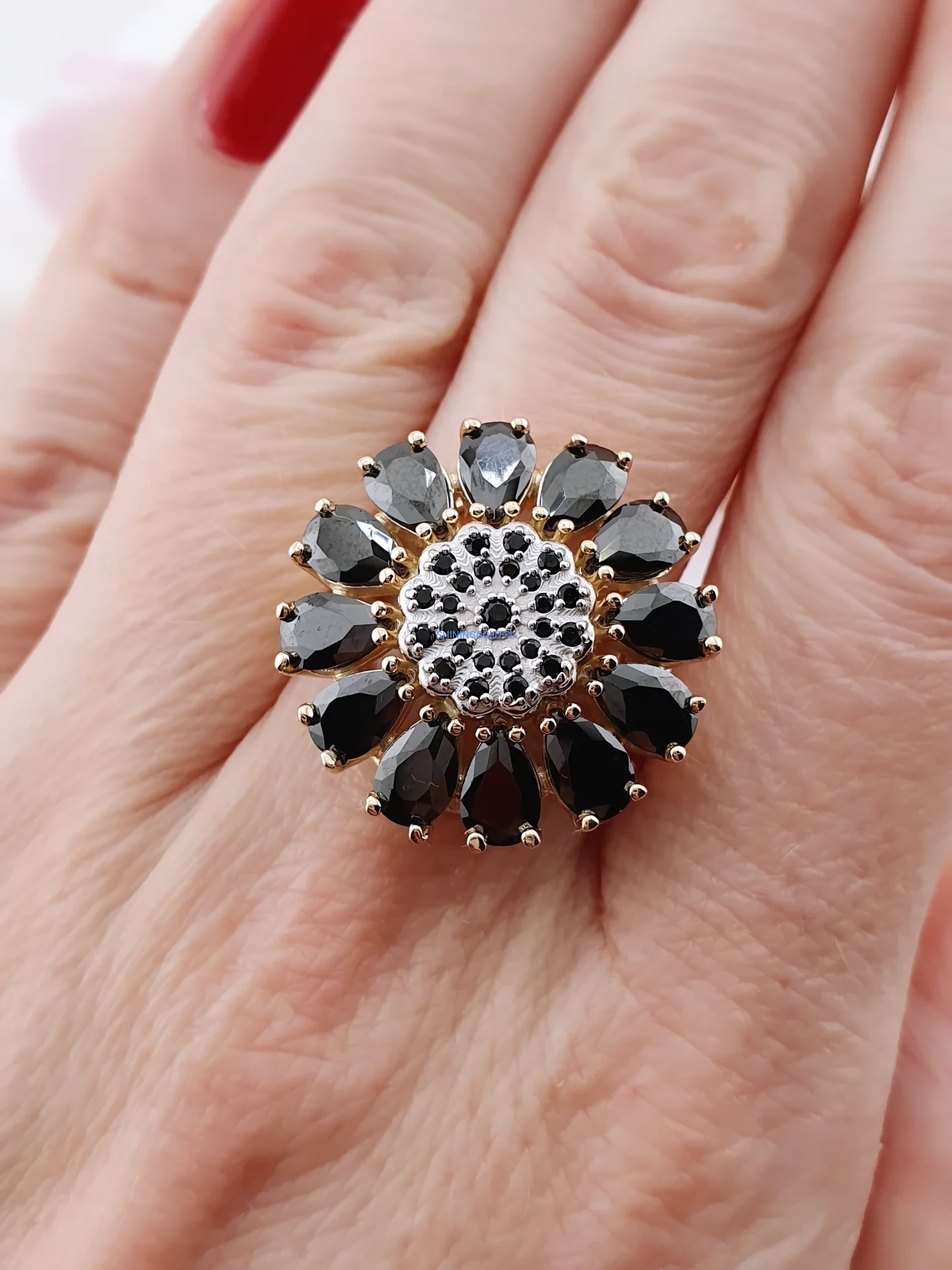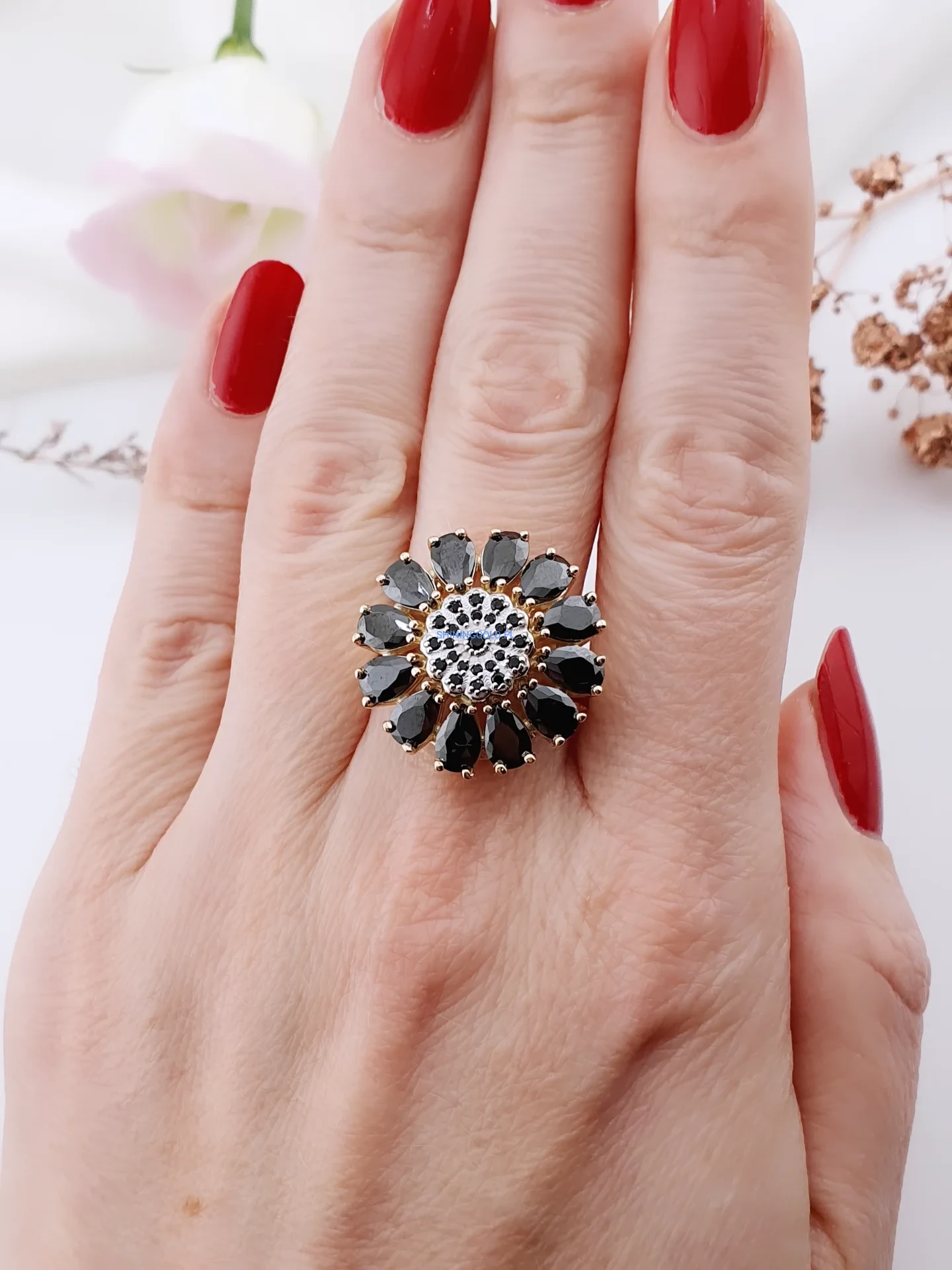 Wyrazisty pierścionek wykonany ze złota próby 585, przyciągający uwagę efektowną kompozycją czarnych onyksów. Kamienie ułożone w kształt kwiatu tworzą elegancką i bardzo kobiecą formę, a centralna część subtelnie zdobiona jasnymi akcentami dodaje całości wyjątkowego blasku. Kontrast złota i głębokiej czerni onyksów sprawia, że pierścionek prezentuje się niezwykle luksusowo.